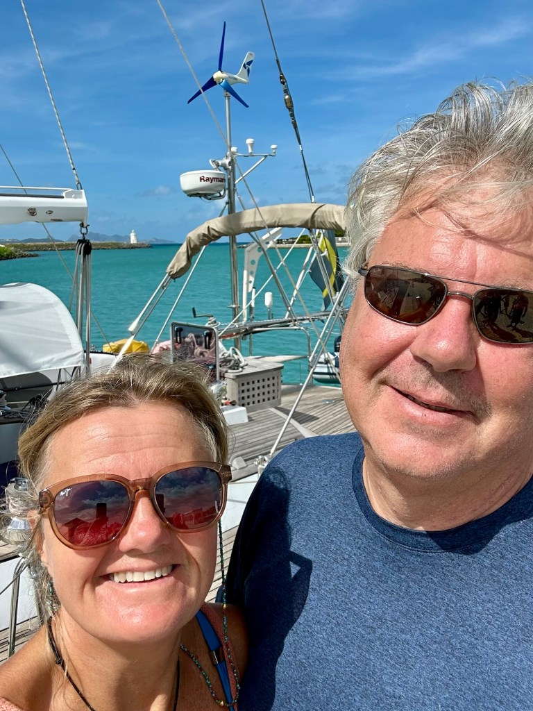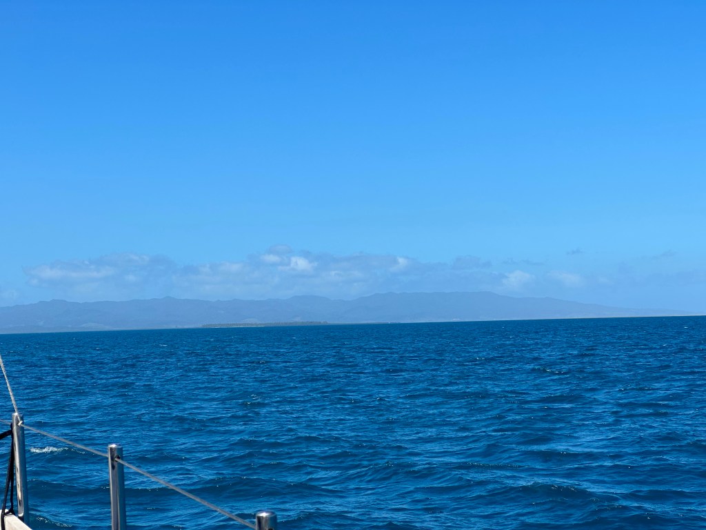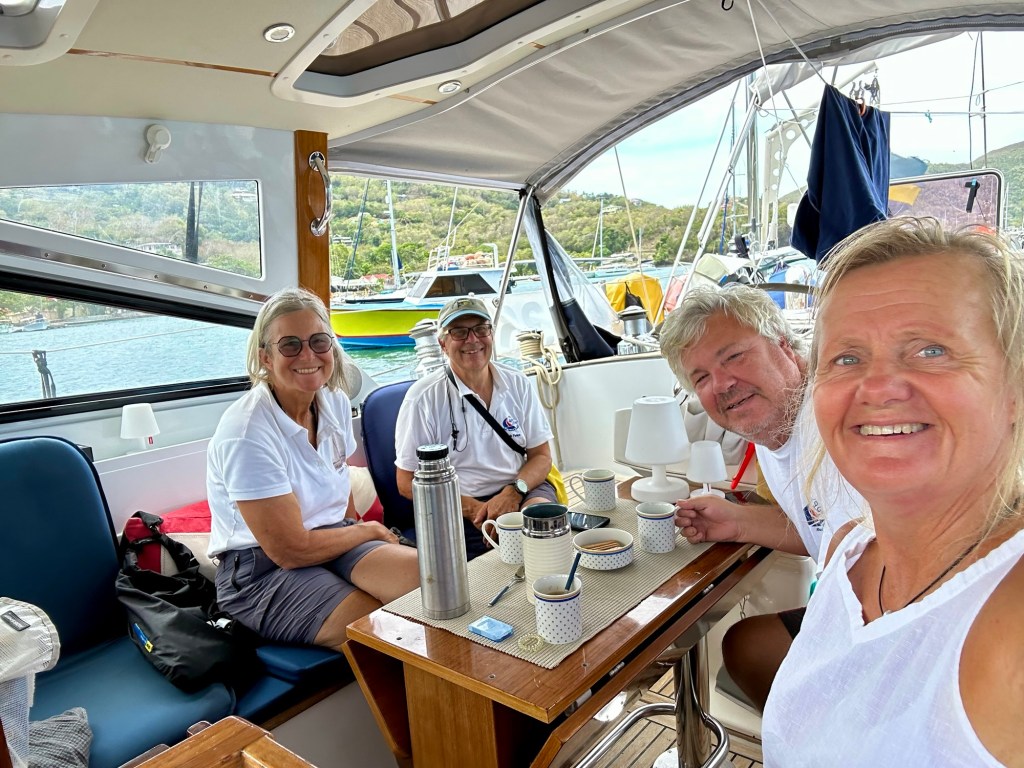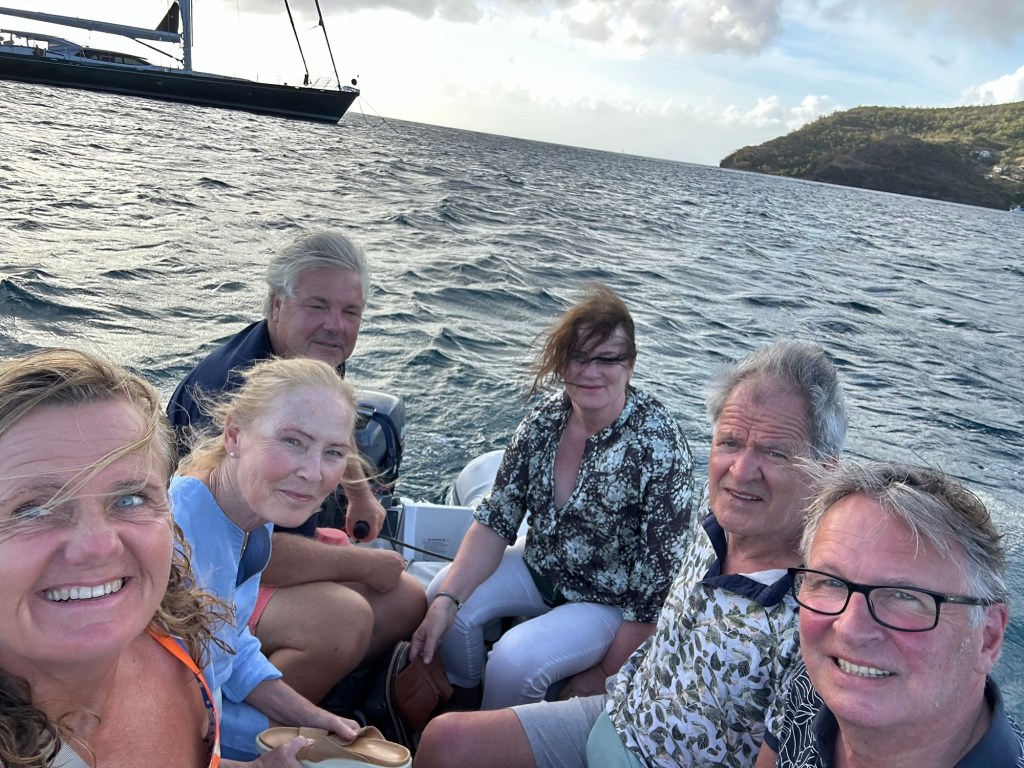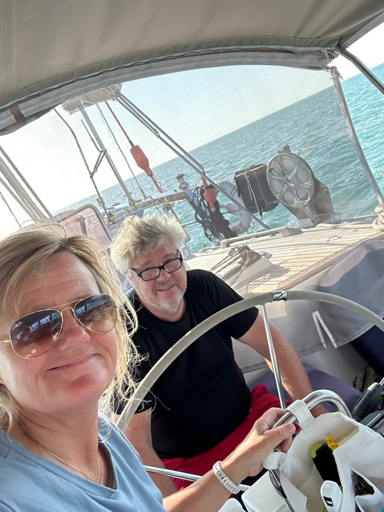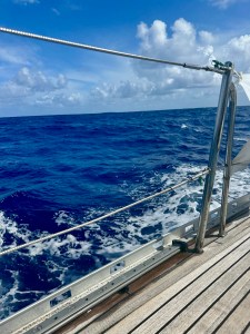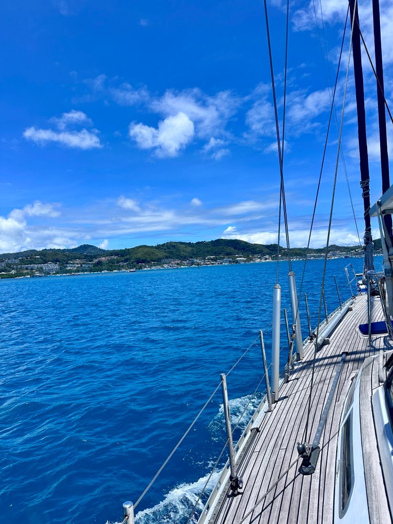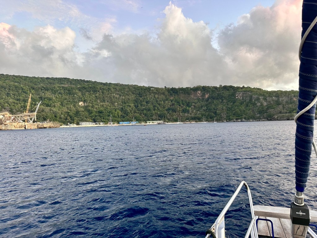 The gangway is put up, and the dinghy is hoisted. We detached the engine yesterday. Just after eleven, the marina staff comes to help us get away from the pilings, and we wave goodbye to Sien and Martin. Before we leave, we fill up with 140 liters of diesel, so now we have a full tank. We also prepare with seasickness patches, which I’m glad we did because as soon as we rounded Antigua, it started rolling, and we lean to port all the time. We’re not good at managing food; neither of us feels like being in the kitchen and cooking, not even going downstairs, so it’s crackers, pastries, and fruit.