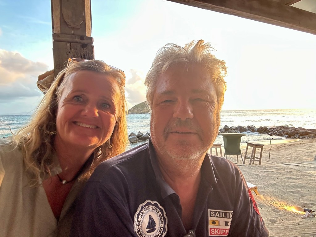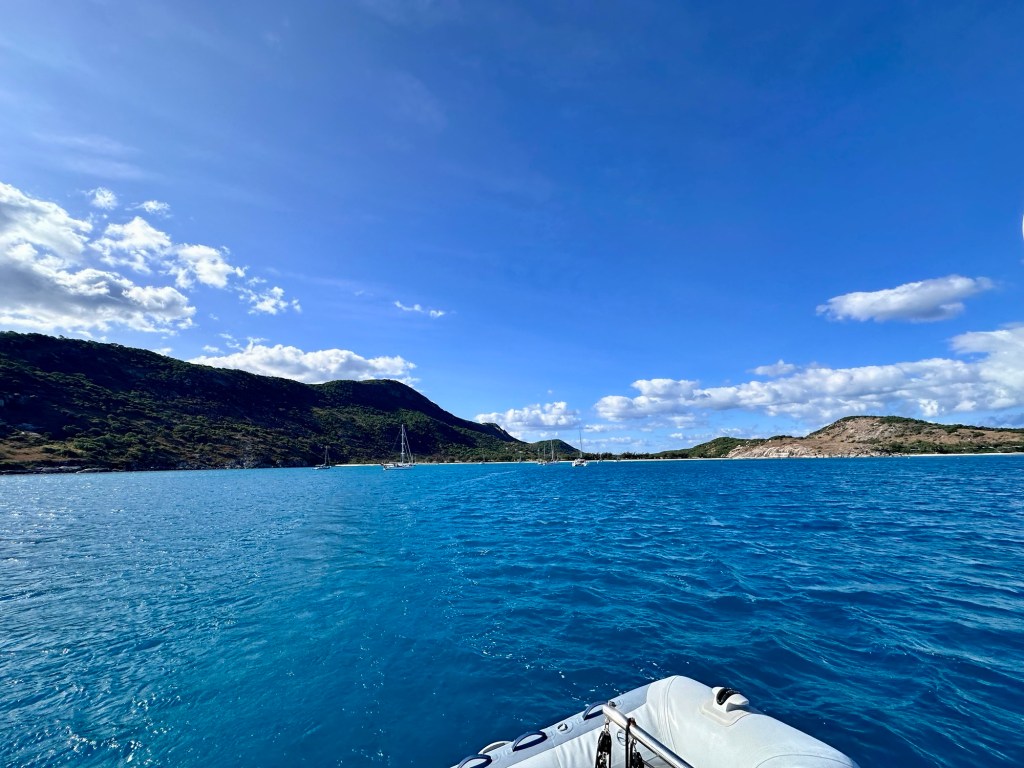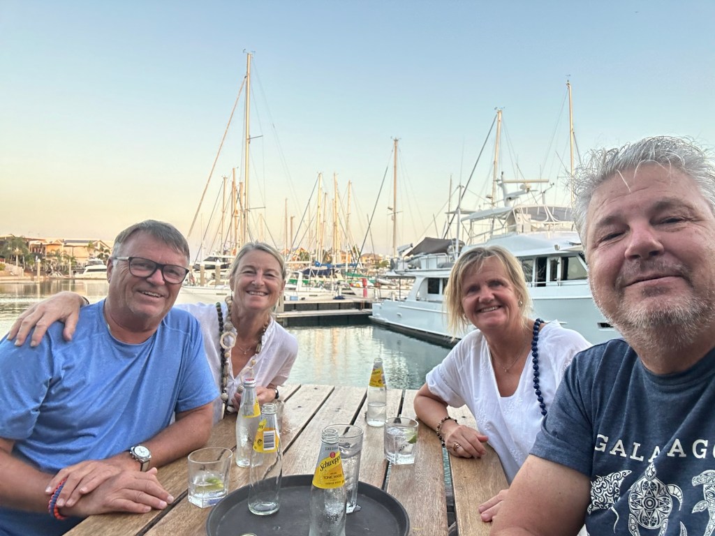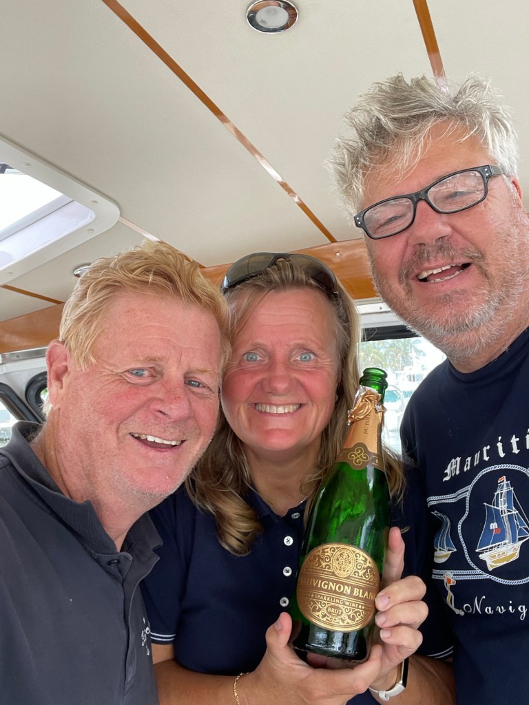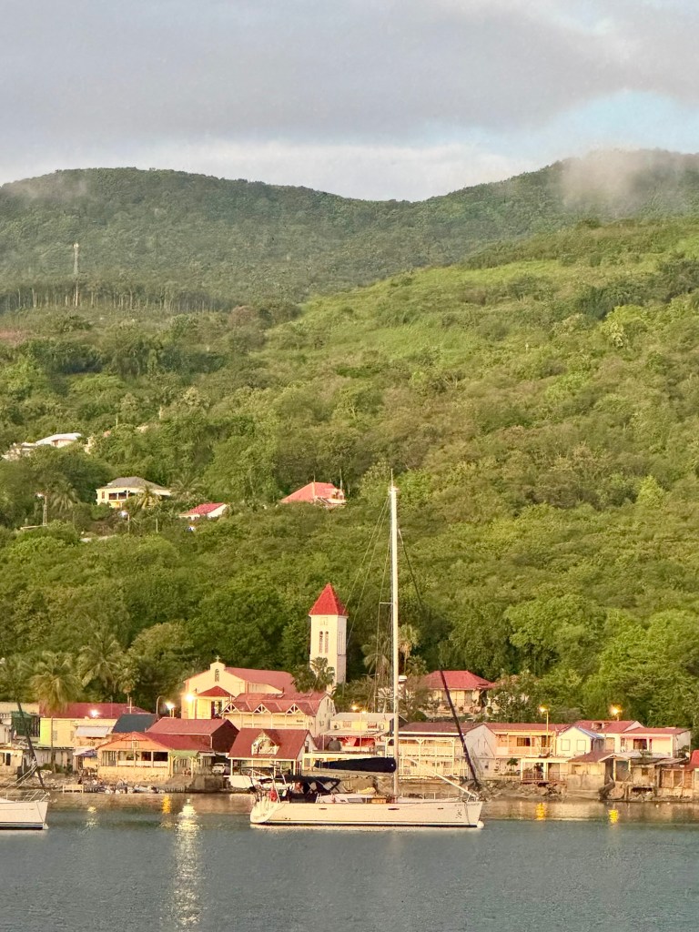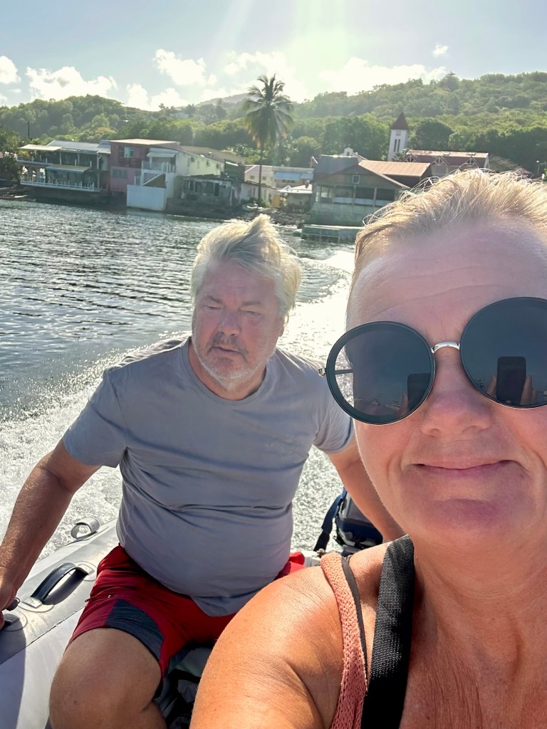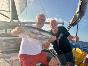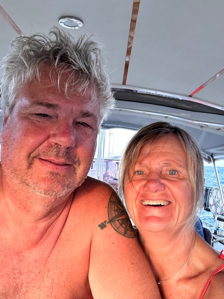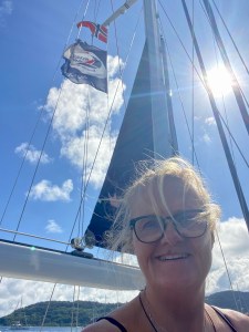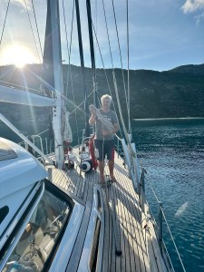 The gangway is put up, and the dinghy is hoisted. We detached the engine yesterday. Just after eleven, the marina staff comes to help us get away from the pilings, and we wave goodbye to Sien and Martin. Before we leave, we fill up with 140 liters of diesel, so now we have a full tank. We also prepare with seasickness patches, which I’m glad we did because as soon as we rounded Antigua, it started rolling, and we lean to port all the time. We’re not good at managing food; neither of us feels like being in the kitchen and cooking, not even going downstairs, so it’s crackers, pastries, and fruit.