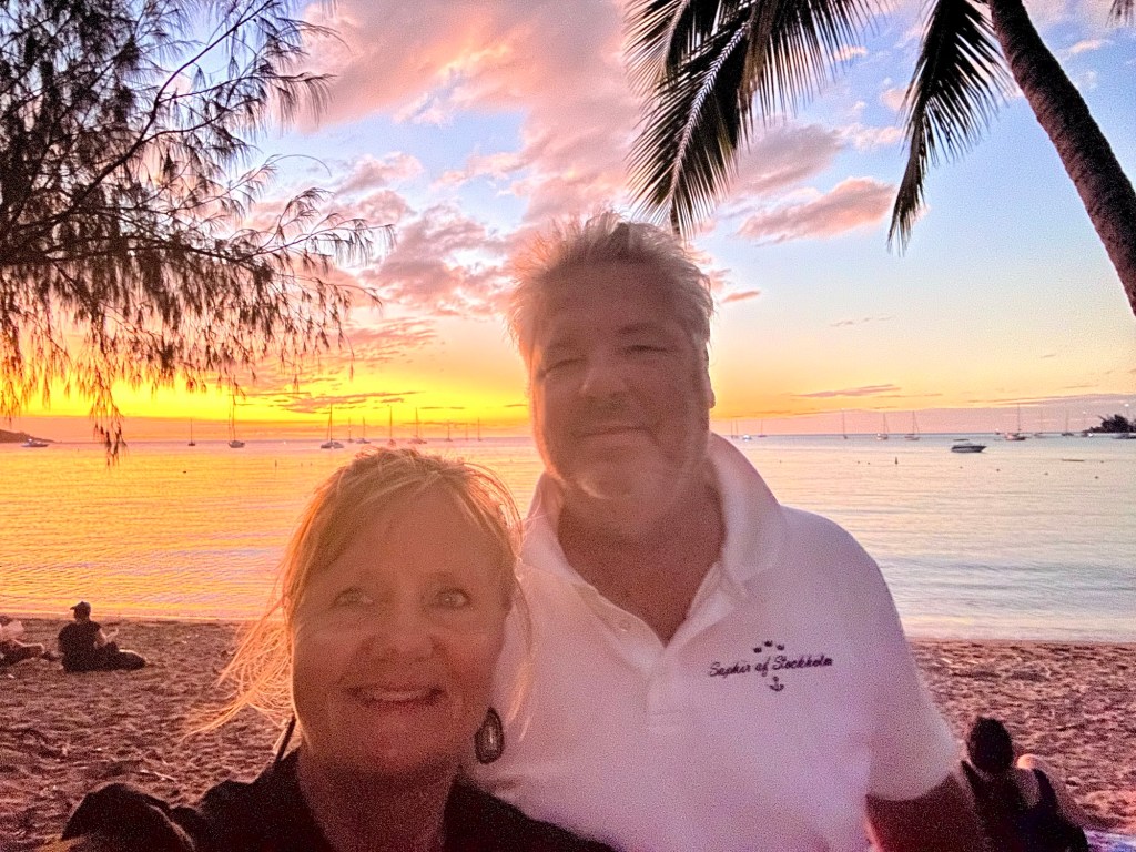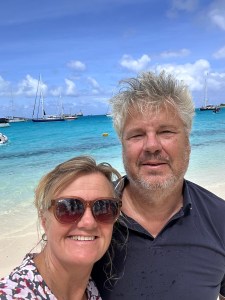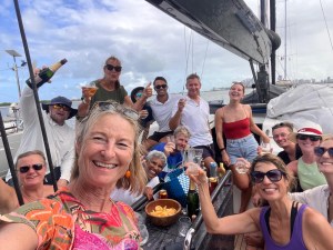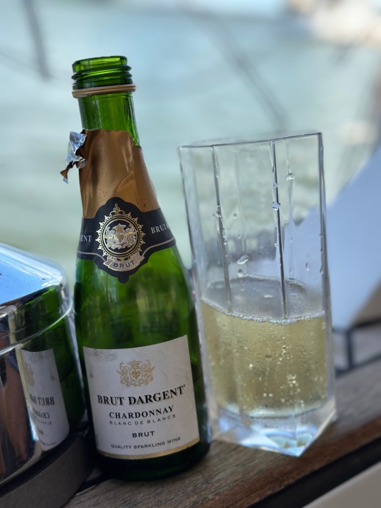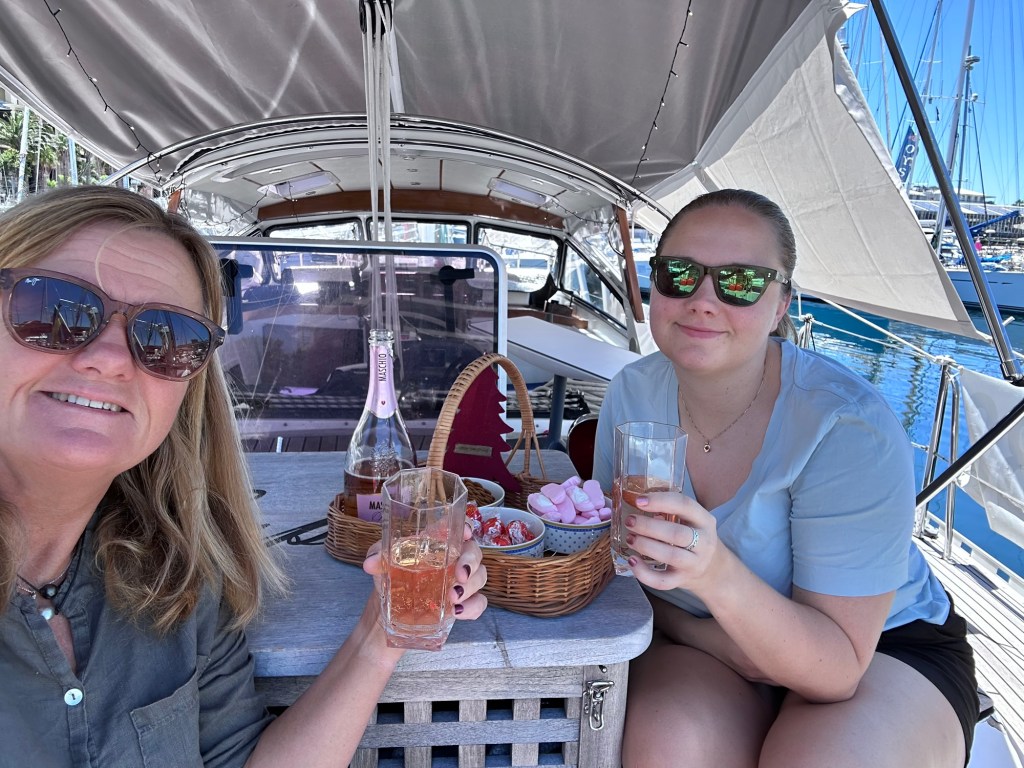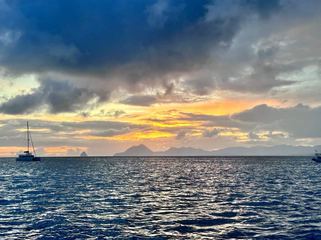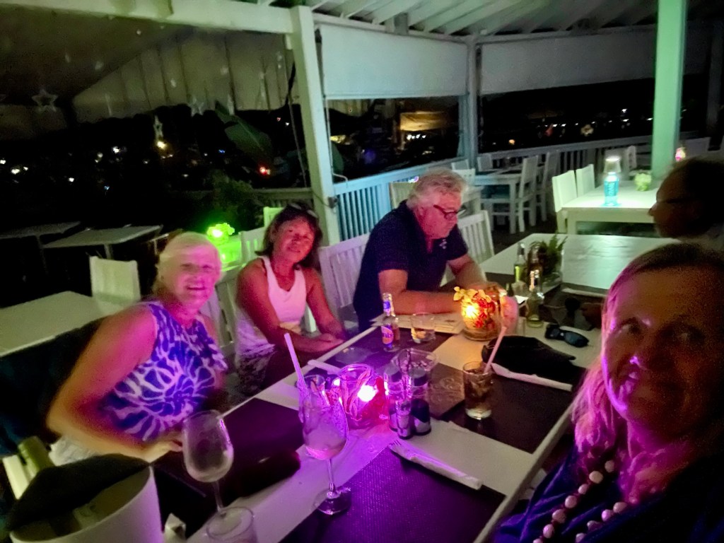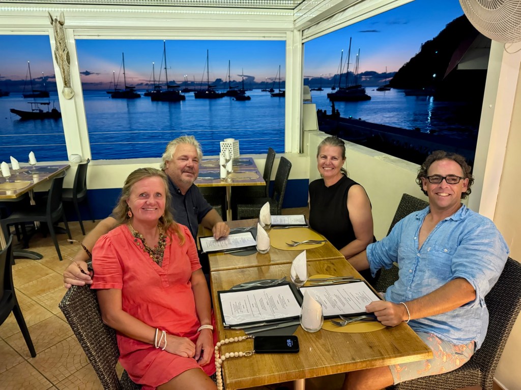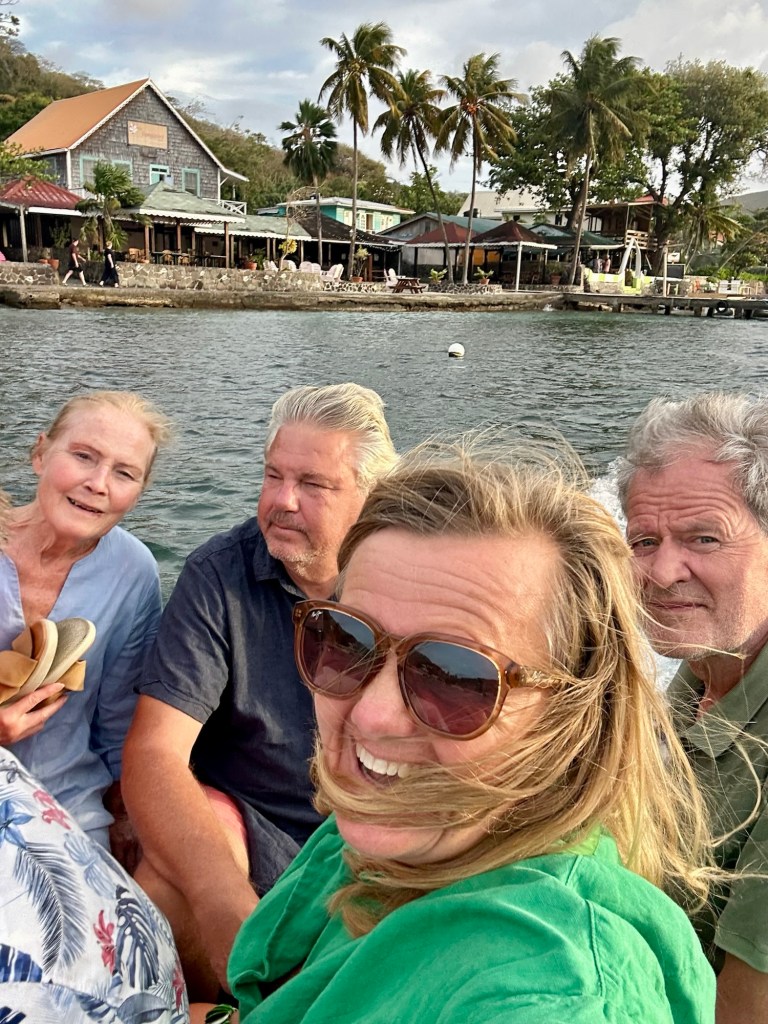 The gangway is put up, and the dinghy is hoisted. We detached the engine yesterday. Just after eleven, the marina staff comes to help us get away from the pilings, and we wave goodbye to Sien and Martin. Before we leave, we fill up with 140 liters of diesel, so now we have a full tank. We also prepare with seasickness patches, which I’m glad we did because as soon as we rounded Antigua, it started rolling, and we lean to port all the time. We’re not good at managing food; neither of us feels like being in the kitchen and cooking, not even going downstairs, so it’s crackers, pastries, and fruit.