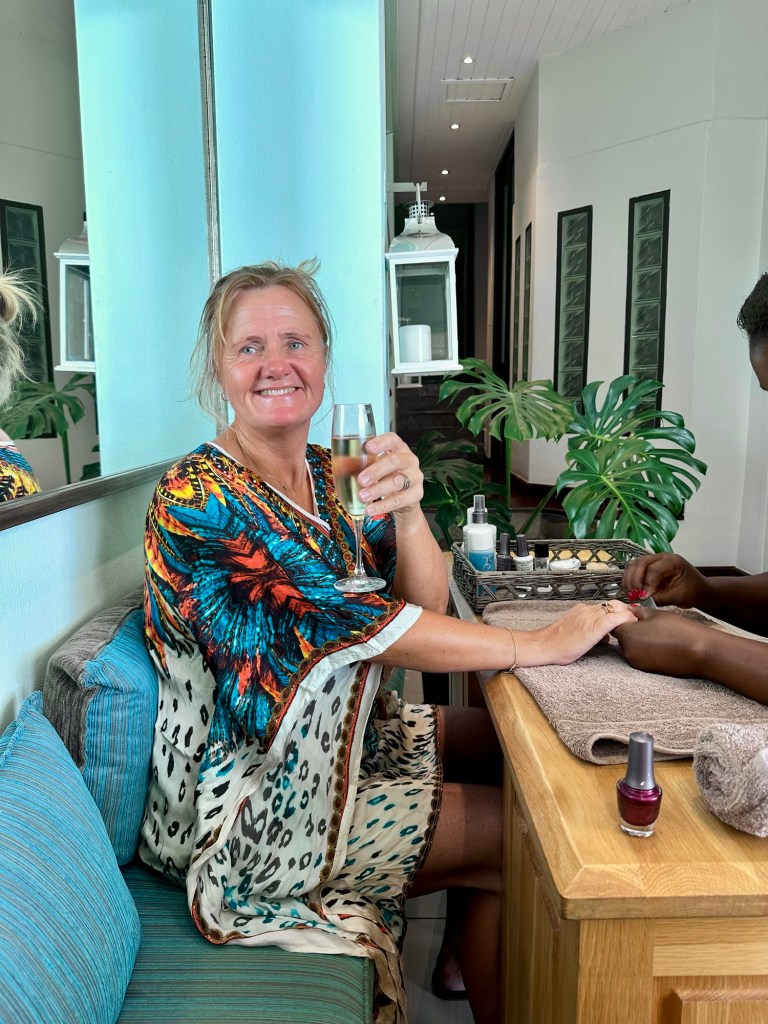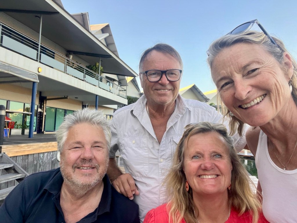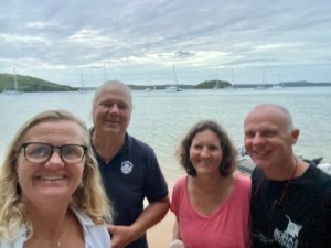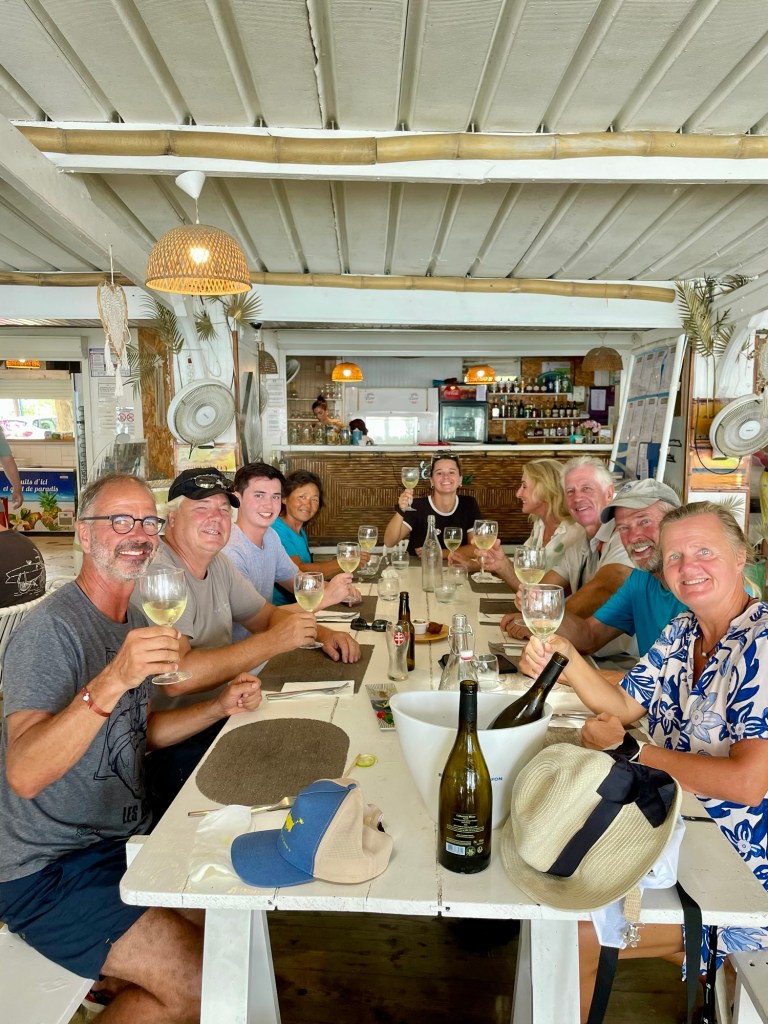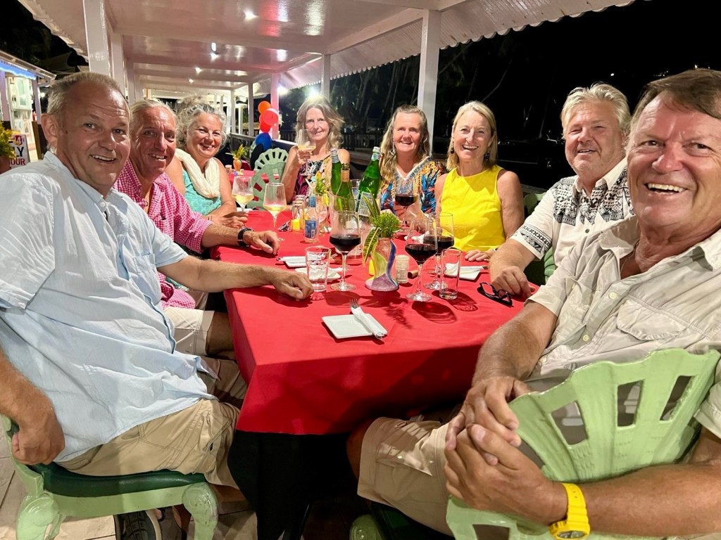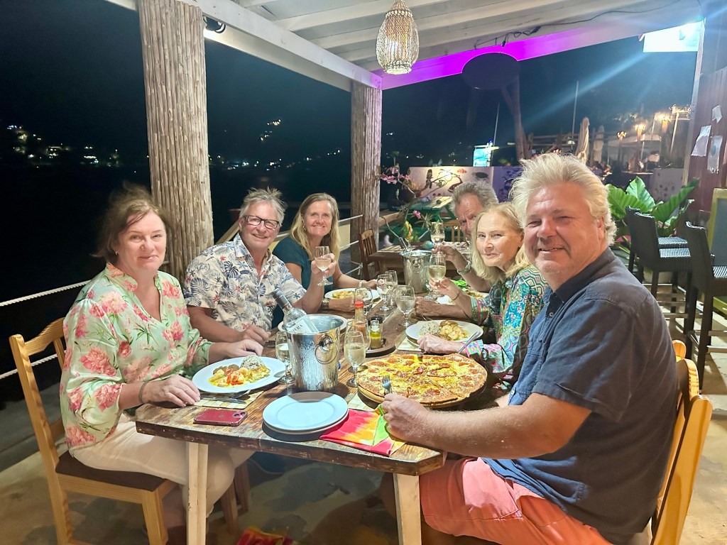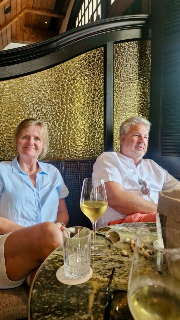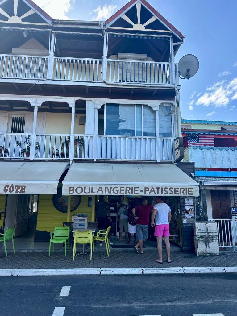 The gangway is put up, and the dinghy is hoisted. We detached the engine yesterday. Just after eleven, the marina staff comes to help us get away from the pilings, and we wave goodbye to Sien and Martin. Before we leave, we fill up with 140 liters of diesel, so now we have a full tank. We also prepare with seasickness patches, which I’m glad we did because as soon as we rounded Antigua, it started rolling, and we lean to port all the time. We’re not good at managing food; neither of us feels like being in the kitchen and cooking, not even going downstairs, so it’s crackers, pastries, and fruit.