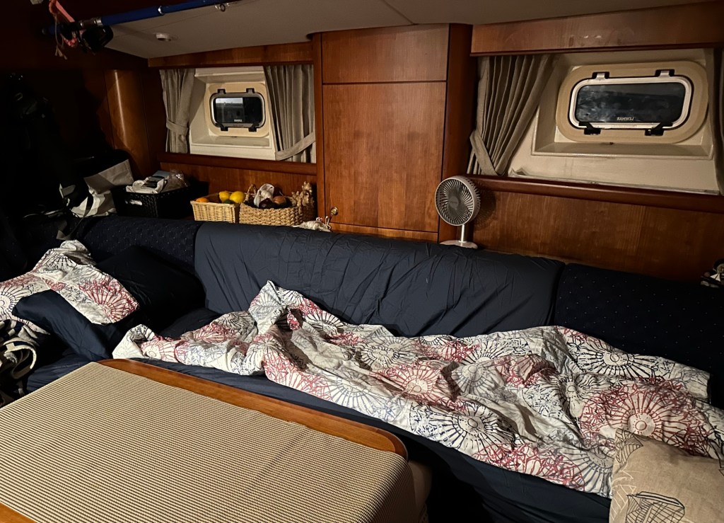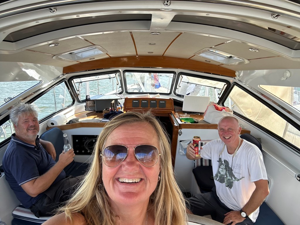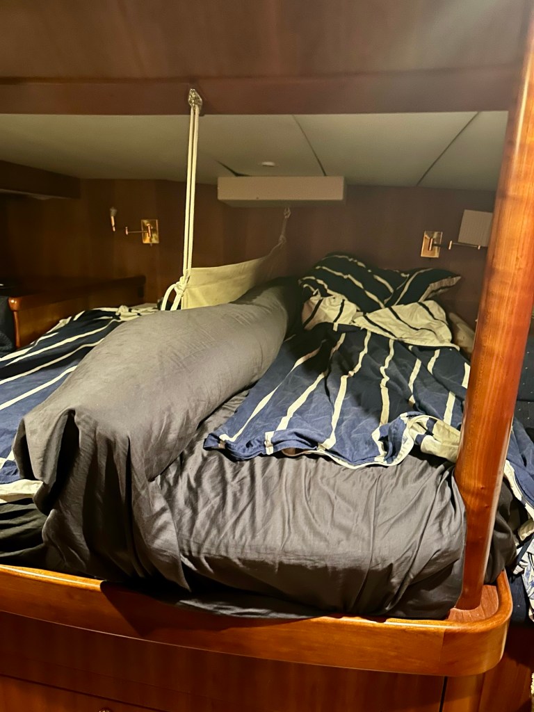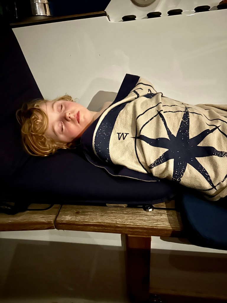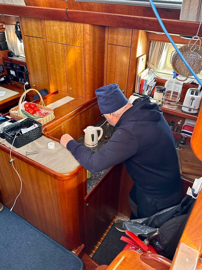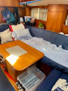 Day 3. I got a few hours of sleep from around midnight to 3:30 when it was Edgar’s turn. He went down to sleep on the couch until about 6. It was so nice to sleep in a bed. What a difference. Unfortunately, some water came in through the saloon window, but that’s nothing compared to how wet it was in the toilet in the bow. The rug was soaking wet, and there was a lot of water by the windows. Just had to clean it up and put towels in the windows.