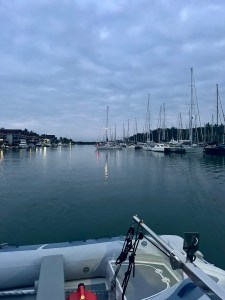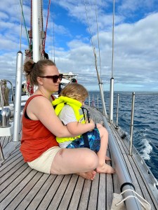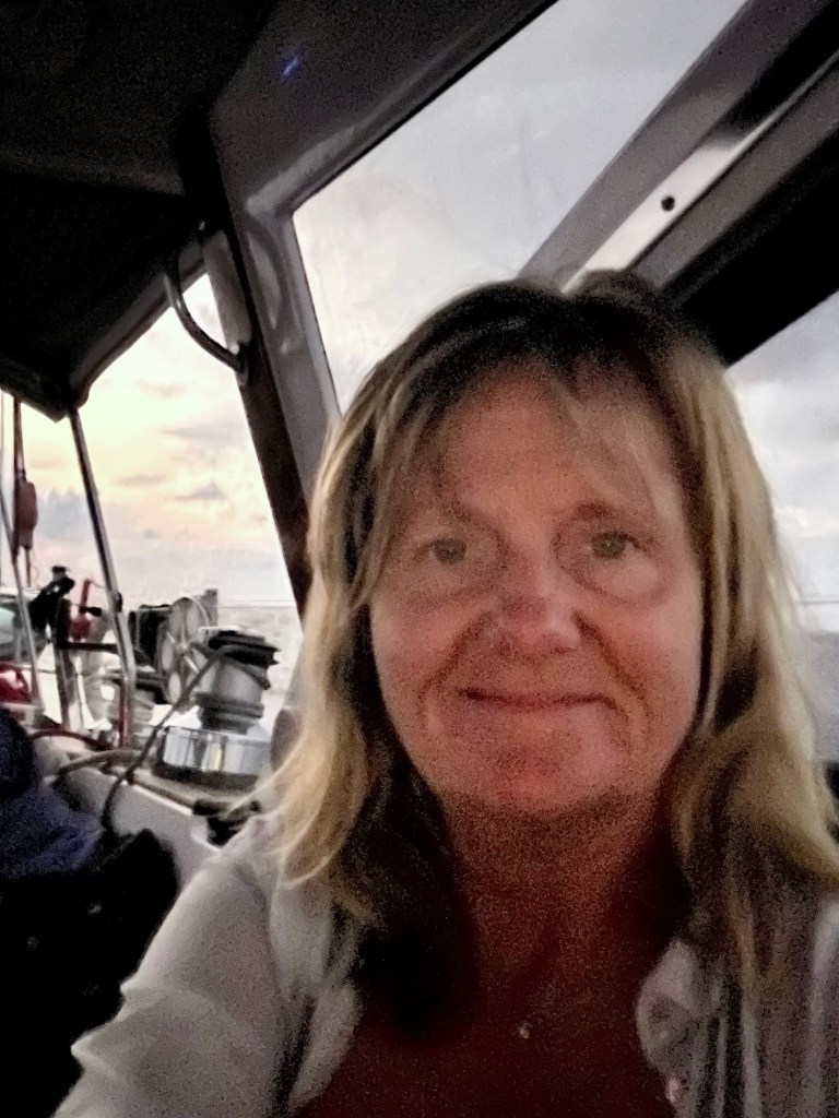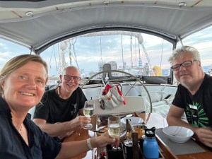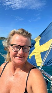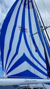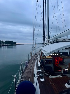 Day 2. Last night’s sleep was so-so. Even though I sea-bedded our beds, we both slept in the cockpit in shifts. It continues to be bumpy, and we reef or let out the sails depending on wind strength. We’re keeping a more northern course since the wind and waves would be straight ahead of us. I finish listening to “Smultron and Betrayal” and also manage to listen to “Anki Goes to Skummeslöv” by Anna-Lena Brundin and Jan Sigvardsson. No knitting as it’s too bumpy.