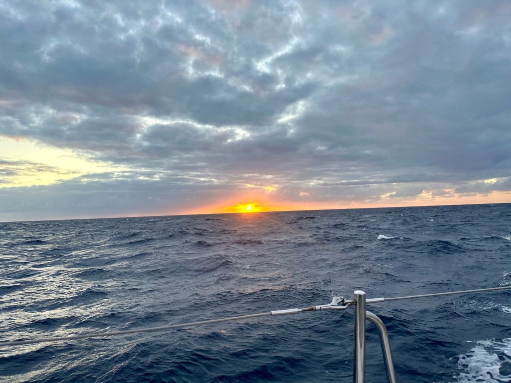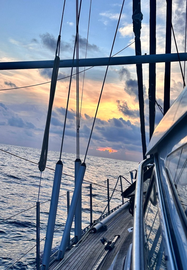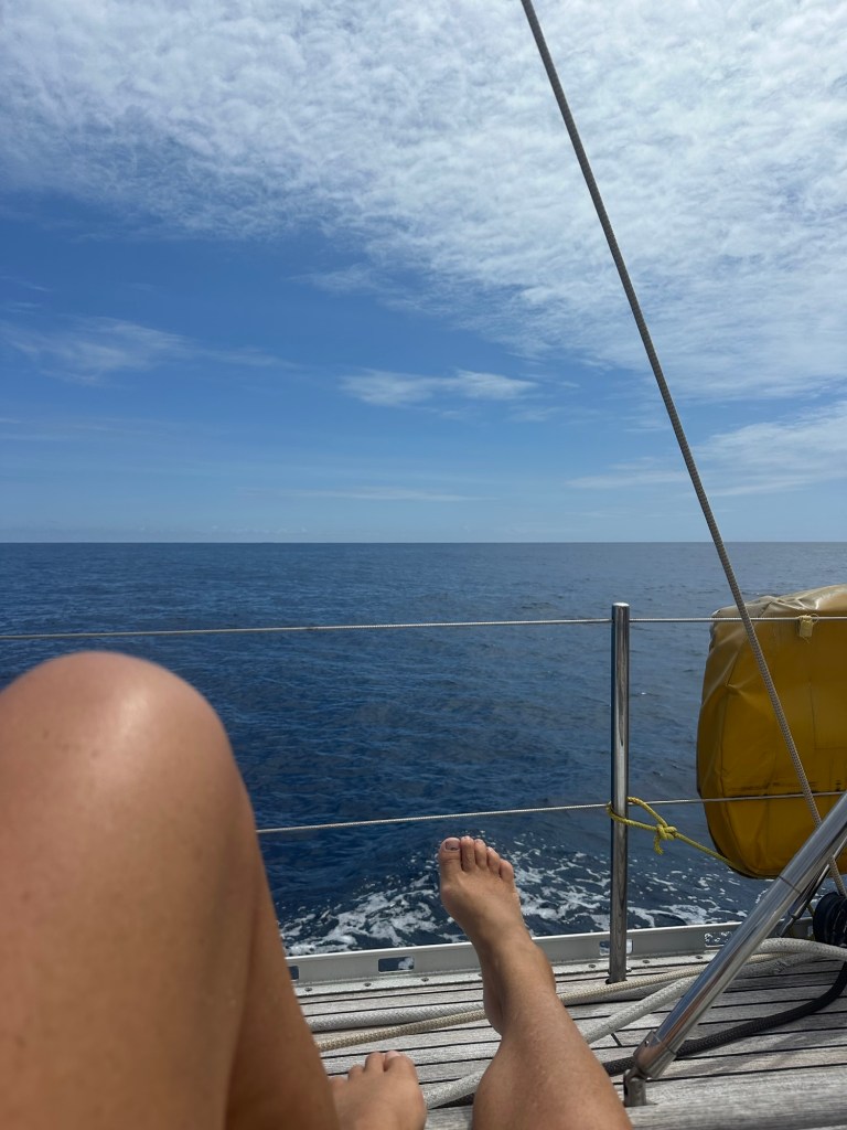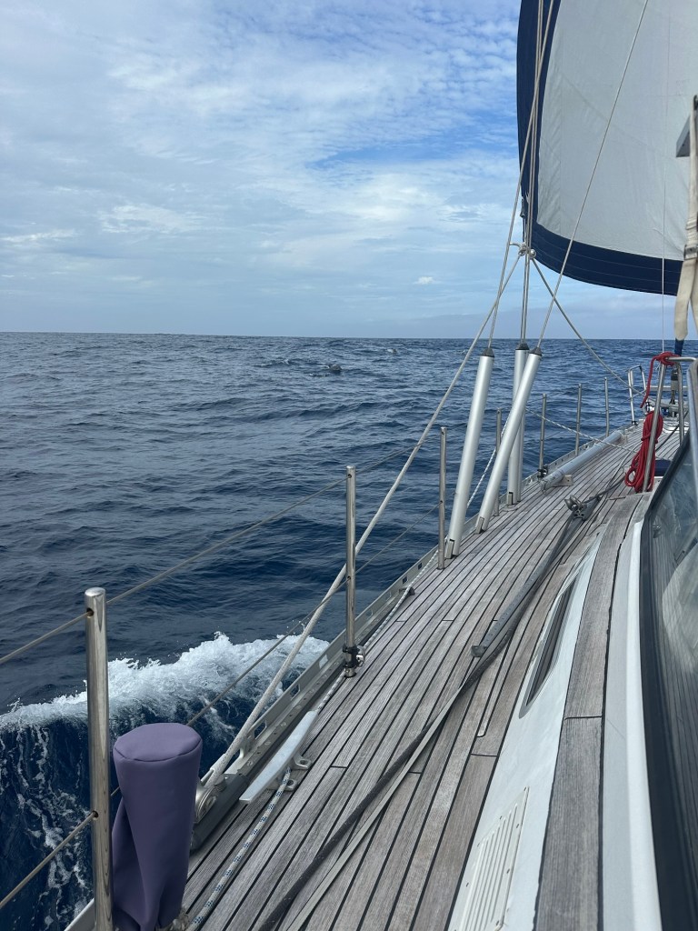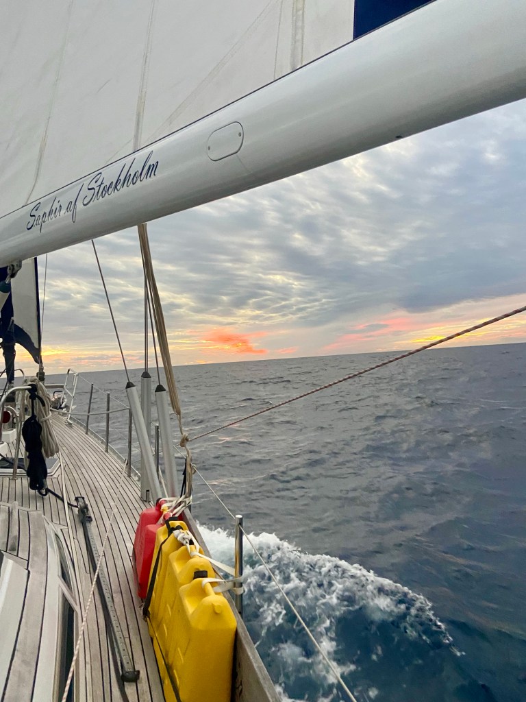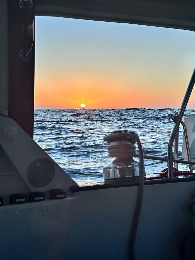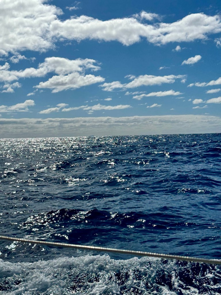 Day 7. I crawl down into the saloon sofa and use a blanket for the first time since we packed them away in Australia. I woke up to Edgar talking to a vessel that didn’t have functioning lights. I fell back asleep and was woken up at 4:30. It’s still moonlit. We’re finally steering more towards the Azores, only 20 degrees off compared to 40 degrees before. At the moment of writing, 1390 nautical miles left. A good distance to go. I watch a movie during my watch, listen to podcasts and audiobooks, and knit. Not all at the same time, of course. It’s pleasant sailing, making between 4 and 6 knots depending on the wind.