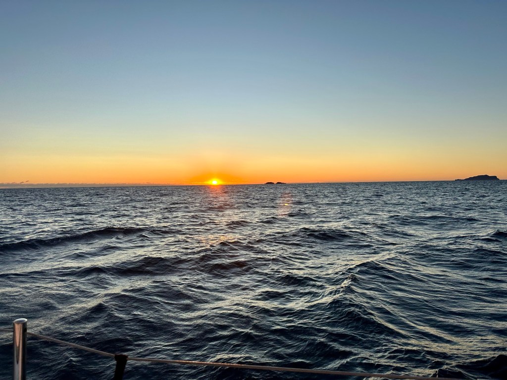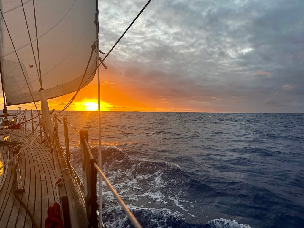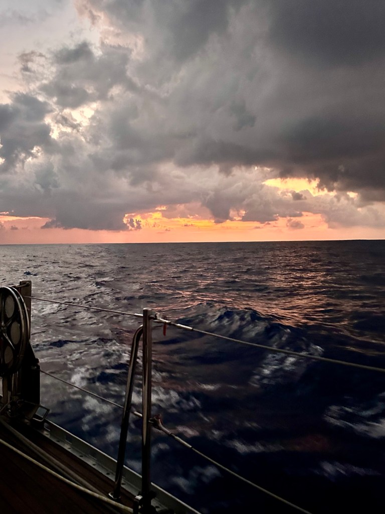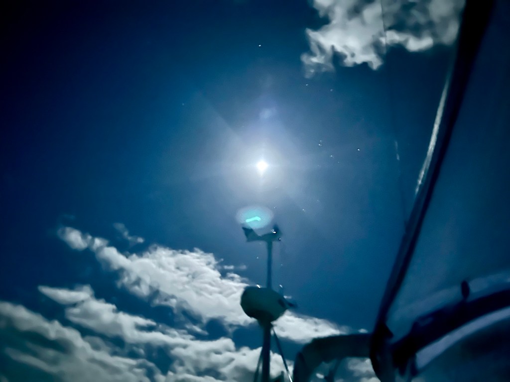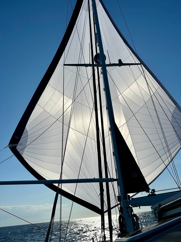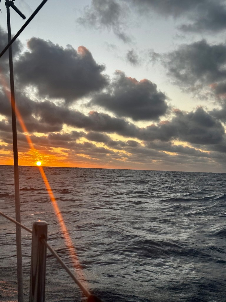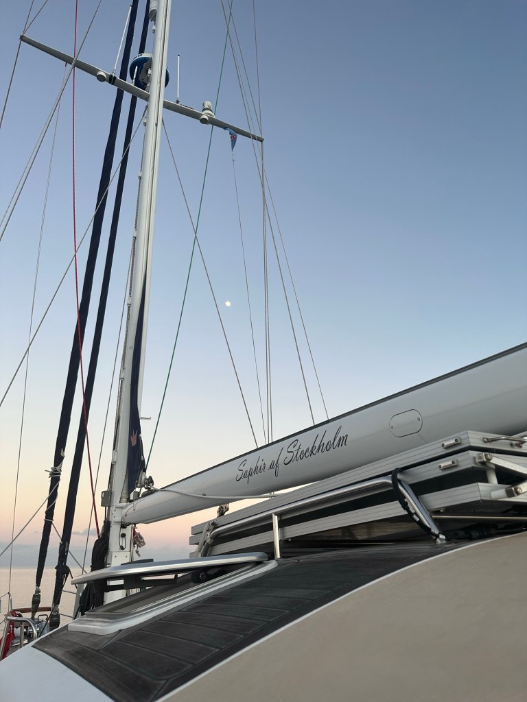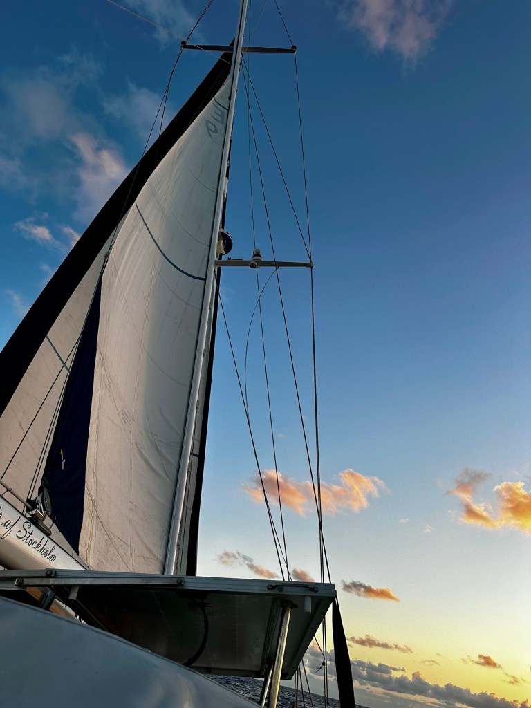 Day 7. I crawl down into the saloon sofa and use a blanket for the first time since we packed them away in Australia. I woke up to Edgar talking to a vessel that didn’t have functioning lights. I fell back asleep and was woken up at 4:30. It’s still moonlit. We’re finally steering more towards the Azores, only 20 degrees off compared to 40 degrees before. At the moment of writing, 1390 nautical miles left. A good distance to go. I watch a movie during my watch, listen to podcasts and audiobooks, and knit. Not all at the same time, of course. It’s pleasant sailing, making between 4 and 6 knots depending on the wind.