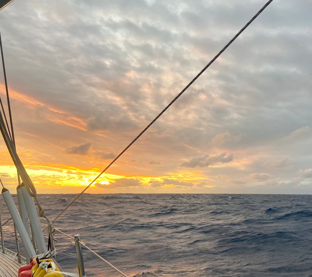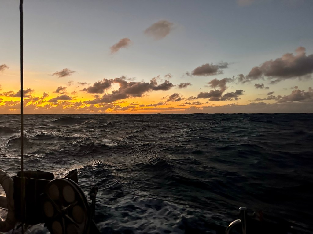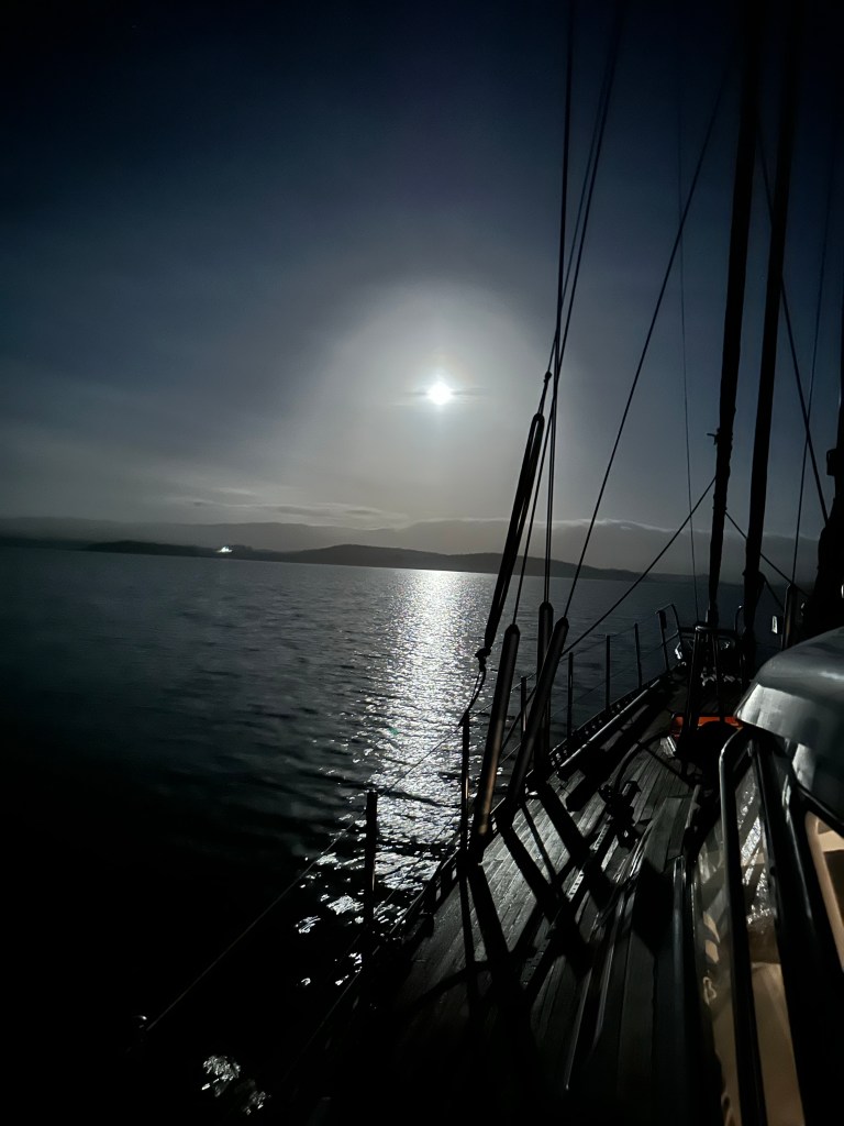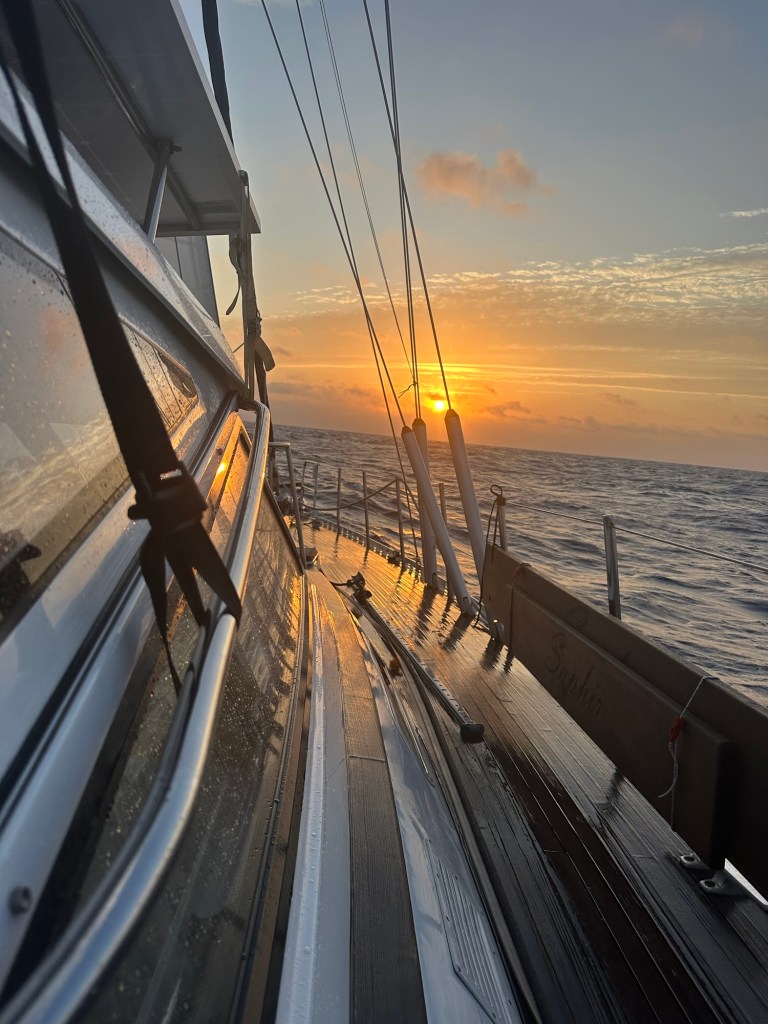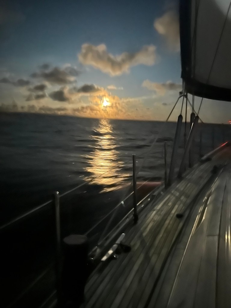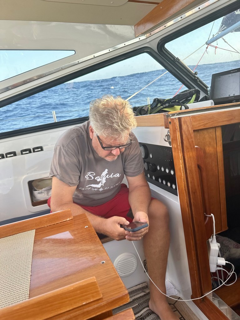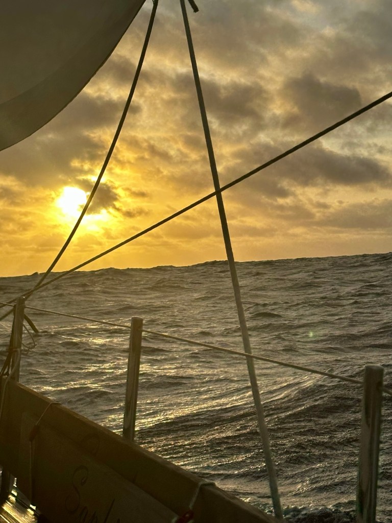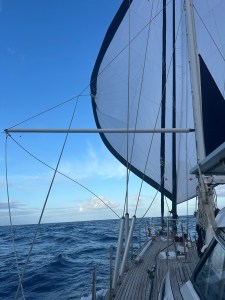 Day 7. I crawl down into the saloon sofa and use a blanket for the first time since we packed them away in Australia. I woke up to Edgar talking to a vessel that didn’t have functioning lights. I fell back asleep and was woken up at 4:30. It’s still moonlit. We’re finally steering more towards the Azores, only 20 degrees off compared to 40 degrees before. At the moment of writing, 1390 nautical miles left. A good distance to go. I watch a movie during my watch, listen to podcasts and audiobooks, and knit. Not all at the same time, of course. It’s pleasant sailing, making between 4 and 6 knots depending on the wind.