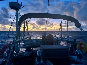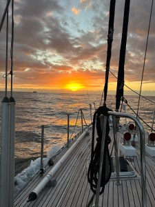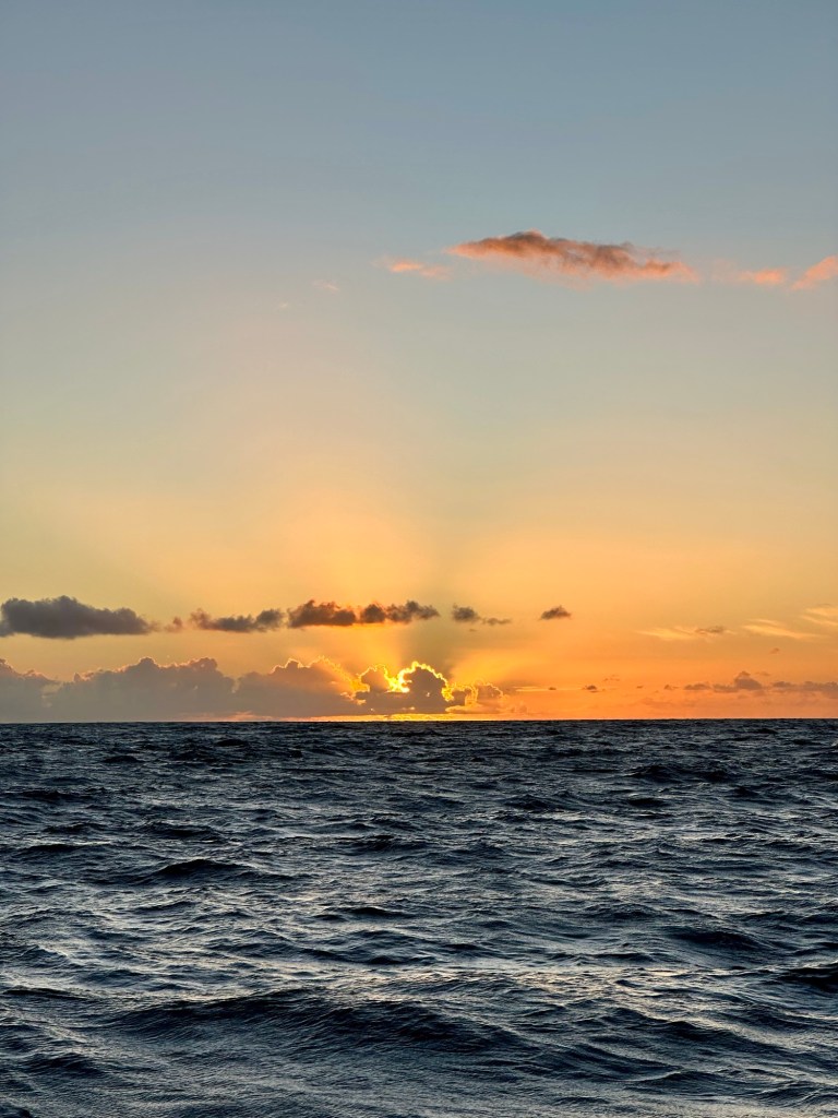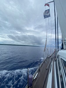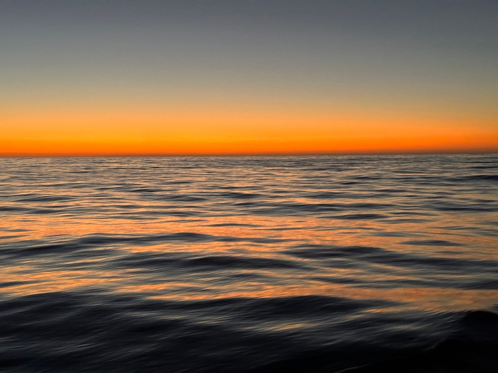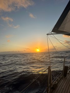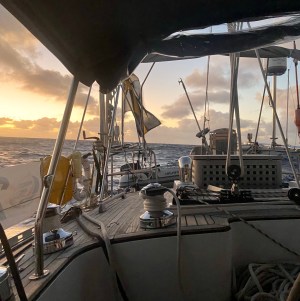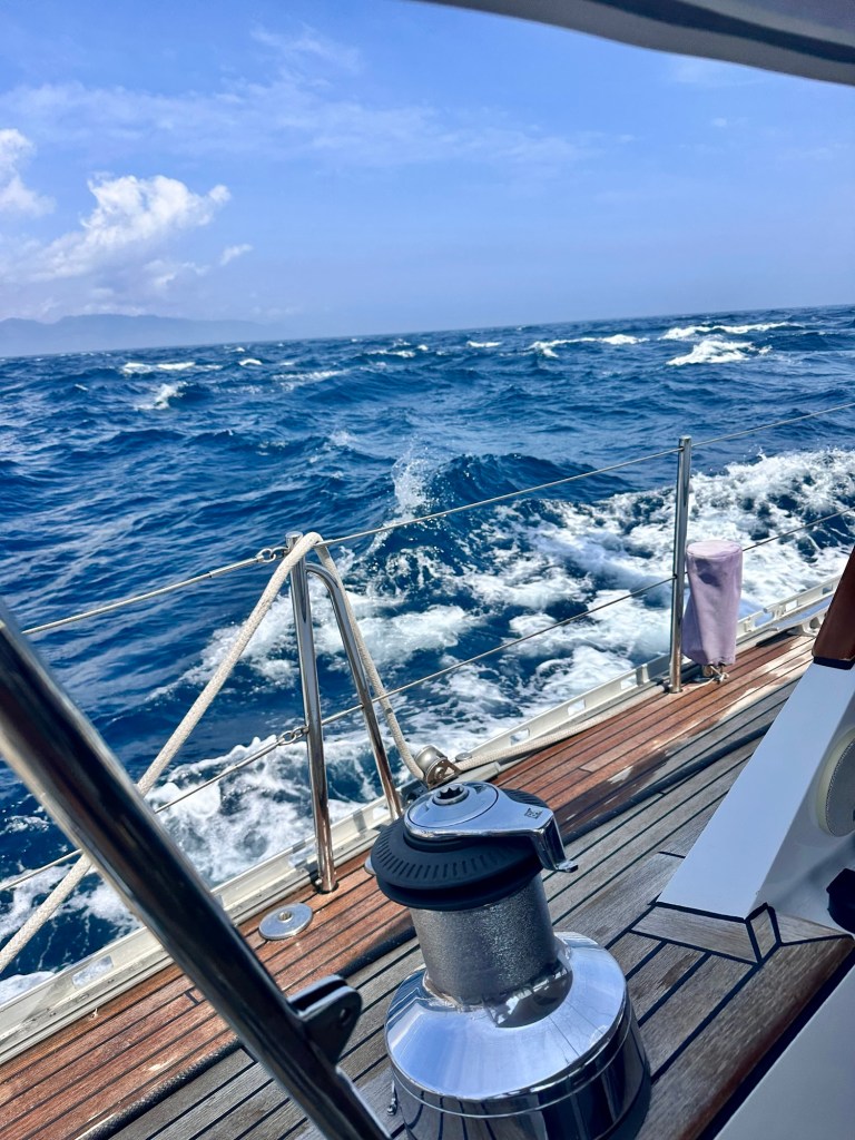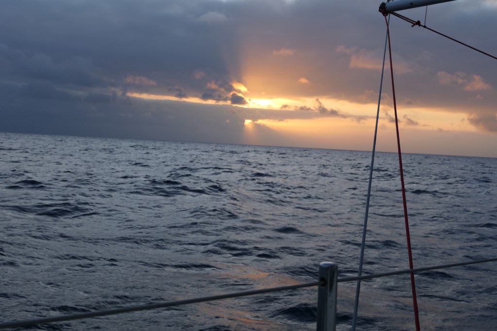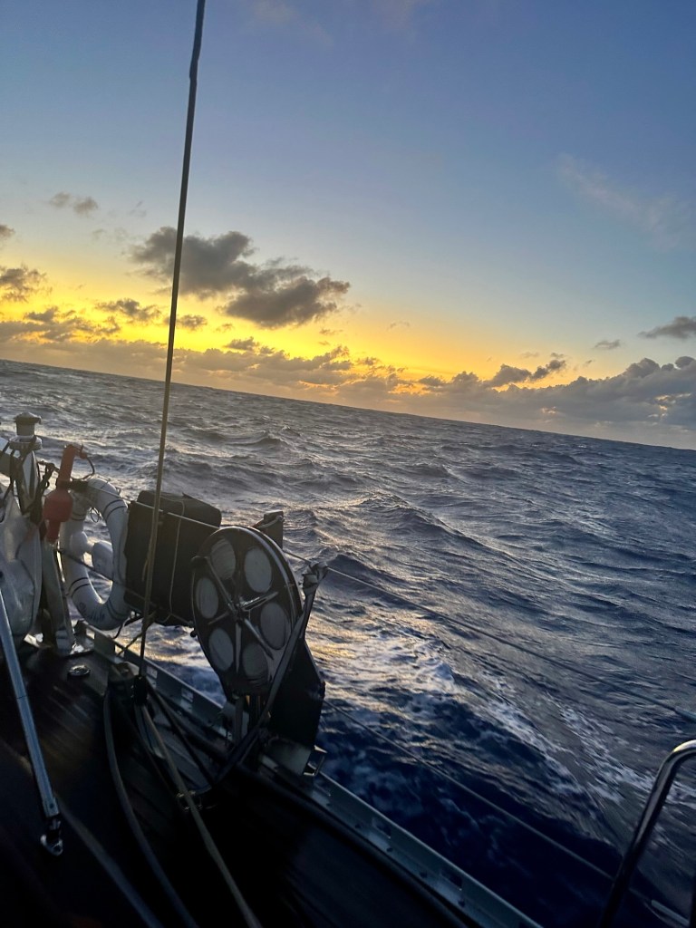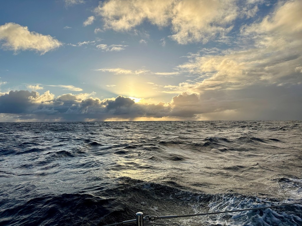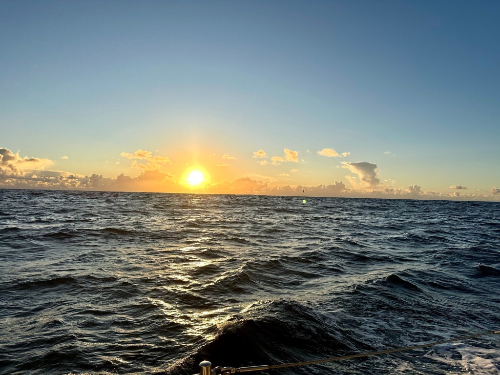 Day 7. I crawl down into the saloon sofa and use a blanket for the first time since we packed them away in Australia. I woke up to Edgar talking to a vessel that didn’t have functioning lights. I fell back asleep and was woken up at 4:30. It’s still moonlit. We’re finally steering more towards the Azores, only 20 degrees off compared to 40 degrees before. At the moment of writing, 1390 nautical miles left. A good distance to go. I watch a movie during my watch, listen to podcasts and audiobooks, and knit. Not all at the same time, of course. It’s pleasant sailing, making between 4 and 6 knots depending on the wind.