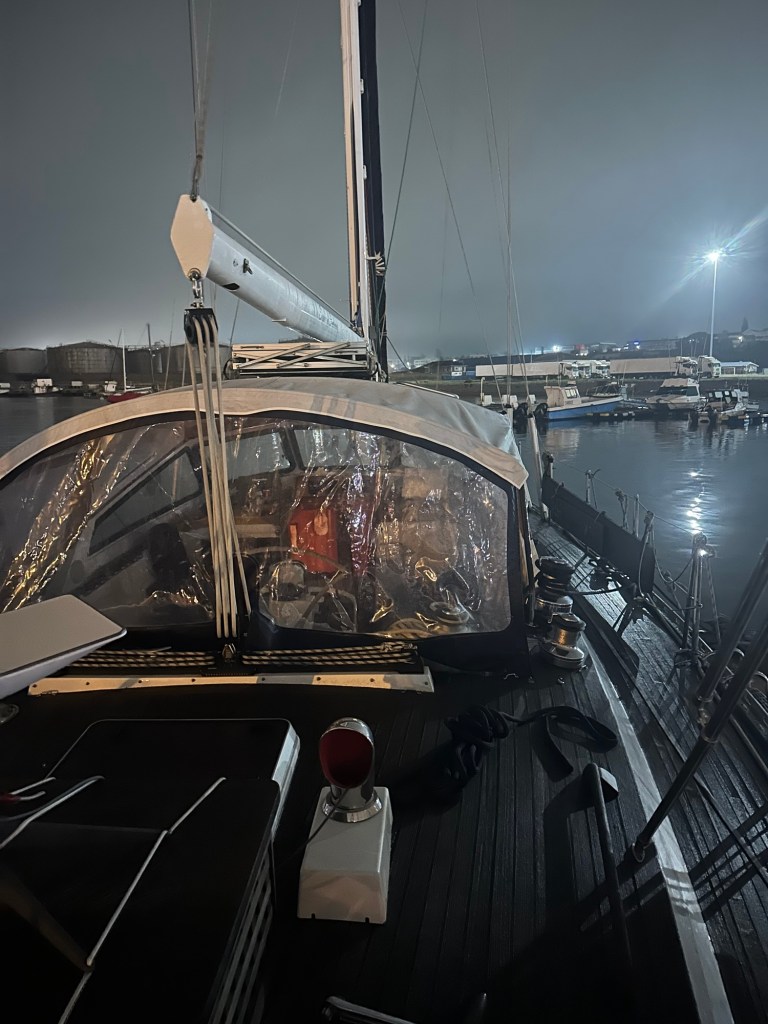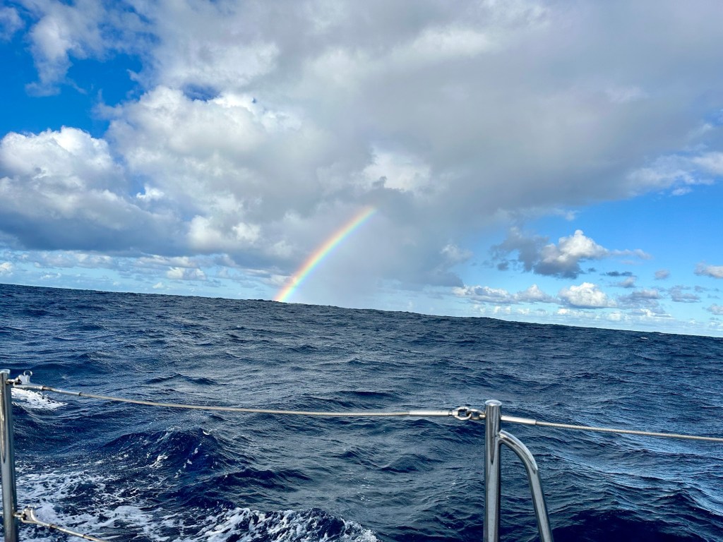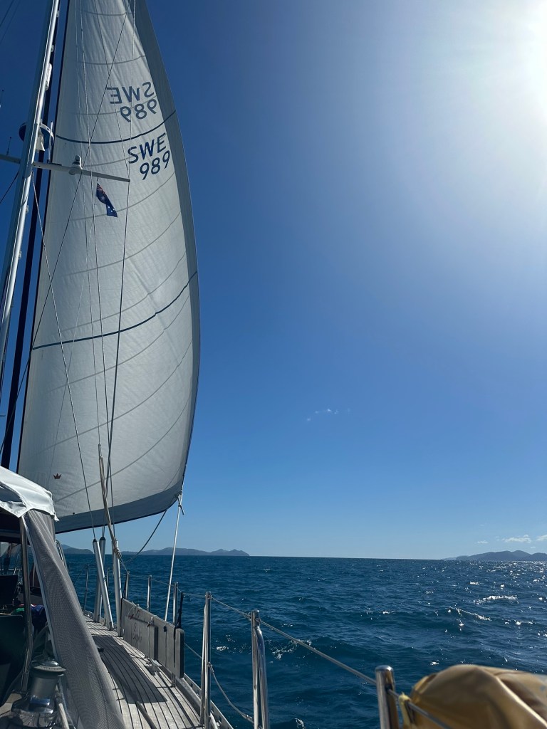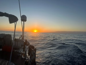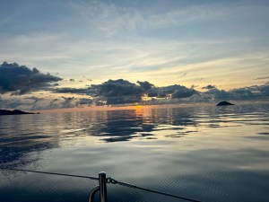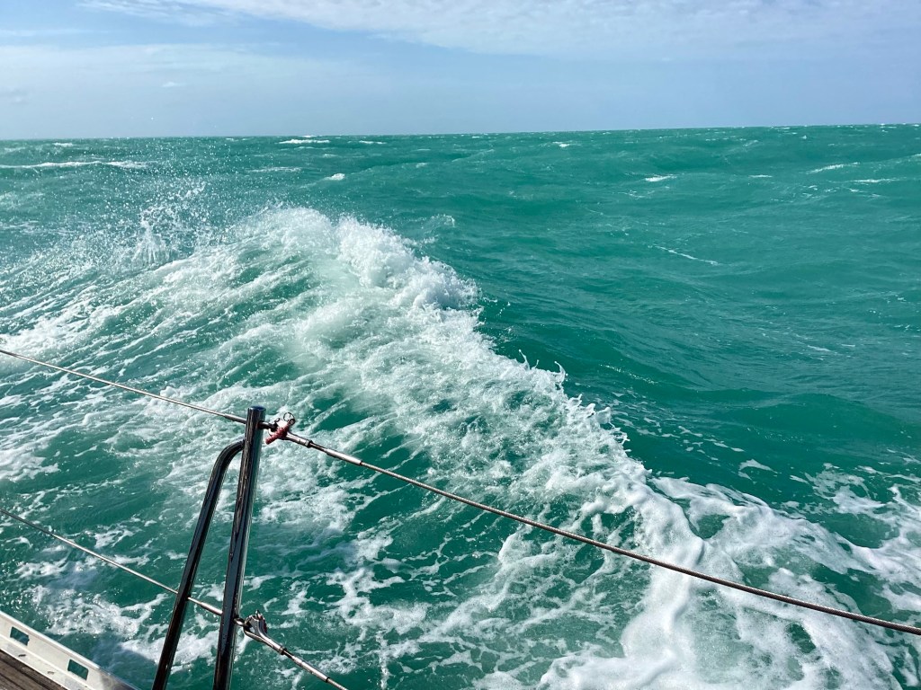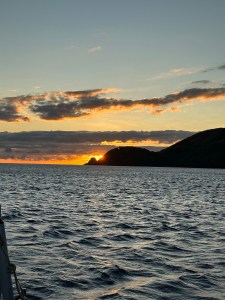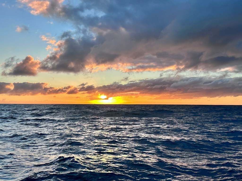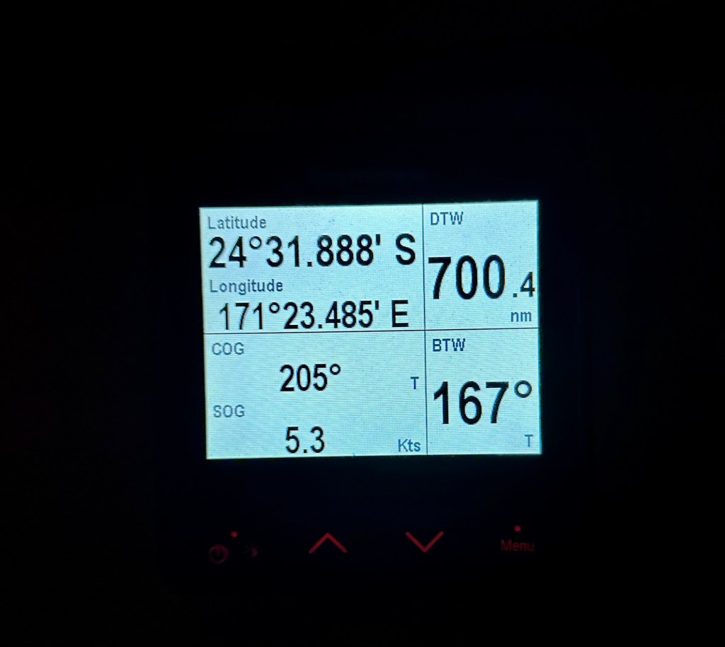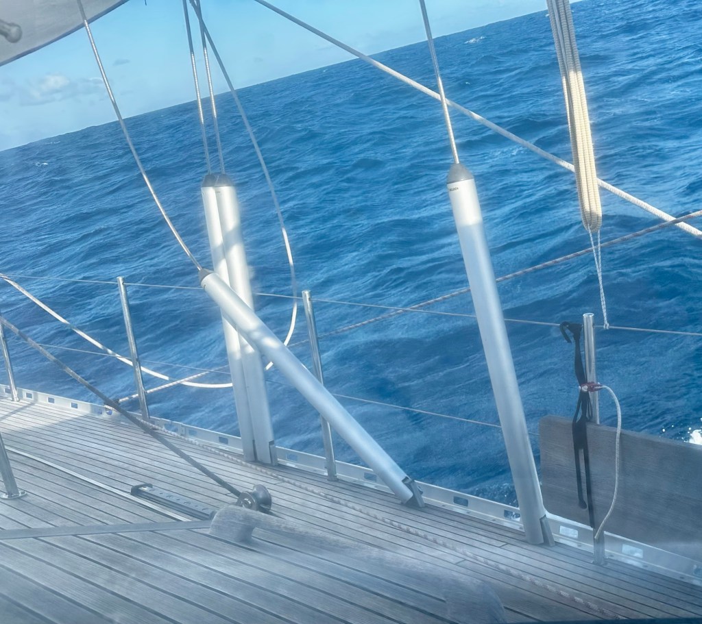 Day 7. I crawl down into the saloon sofa and use a blanket for the first time since we packed them away in Australia. I woke up to Edgar talking to a vessel that didn’t have functioning lights. I fell back asleep and was woken up at 4:30. It’s still moonlit. We’re finally steering more towards the Azores, only 20 degrees off compared to 40 degrees before. At the moment of writing, 1390 nautical miles left. A good distance to go. I watch a movie during my watch, listen to podcasts and audiobooks, and knit. Not all at the same time, of course. It’s pleasant sailing, making between 4 and 6 knots depending on the wind.