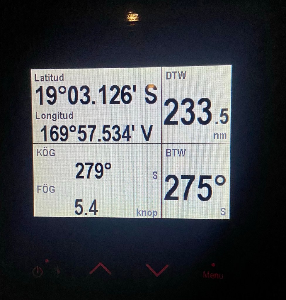 Our plotter has really gone haywire. It works, but we can no longer read the names of the boats we see. The names are covered with a colored bar code. When you share the radar with a regular one, the bright parts on the radar got confusing, so I turned off the sharing and switched instead. It was nice to be able to turn off the radar when it started to get light around half-past four. Now I can see the clouds that lie like a curtain in front of us until the sun comes up and they dissolve.
