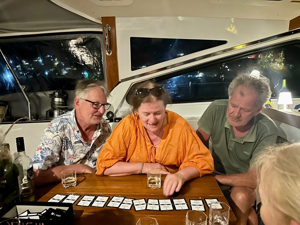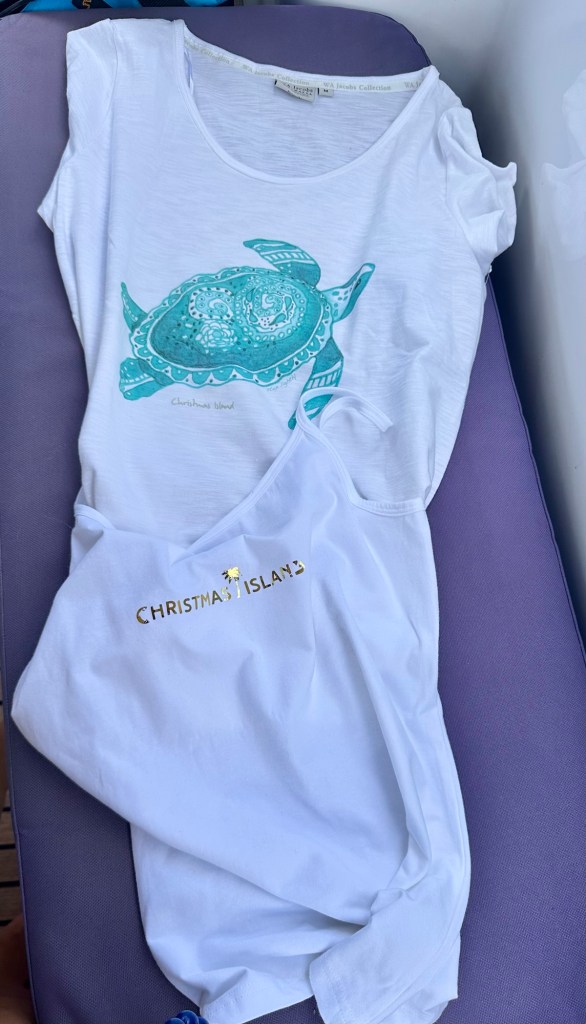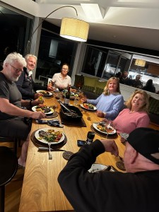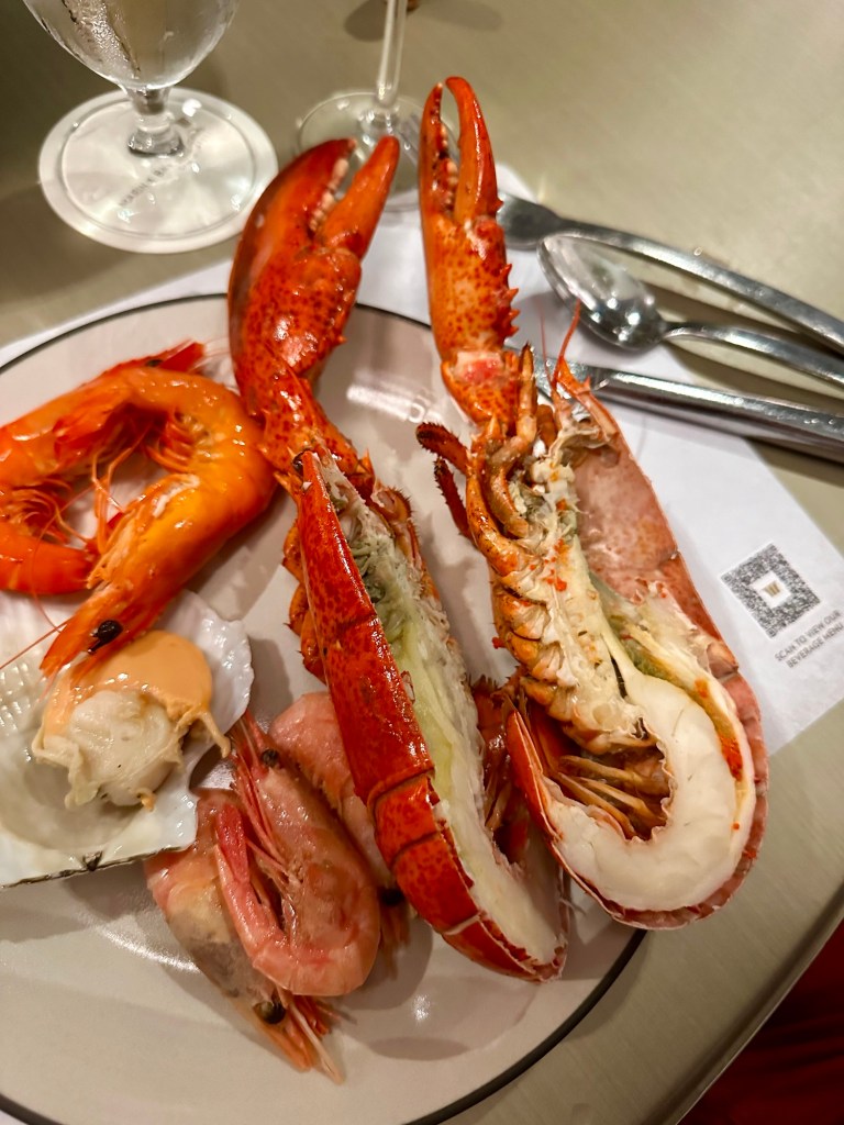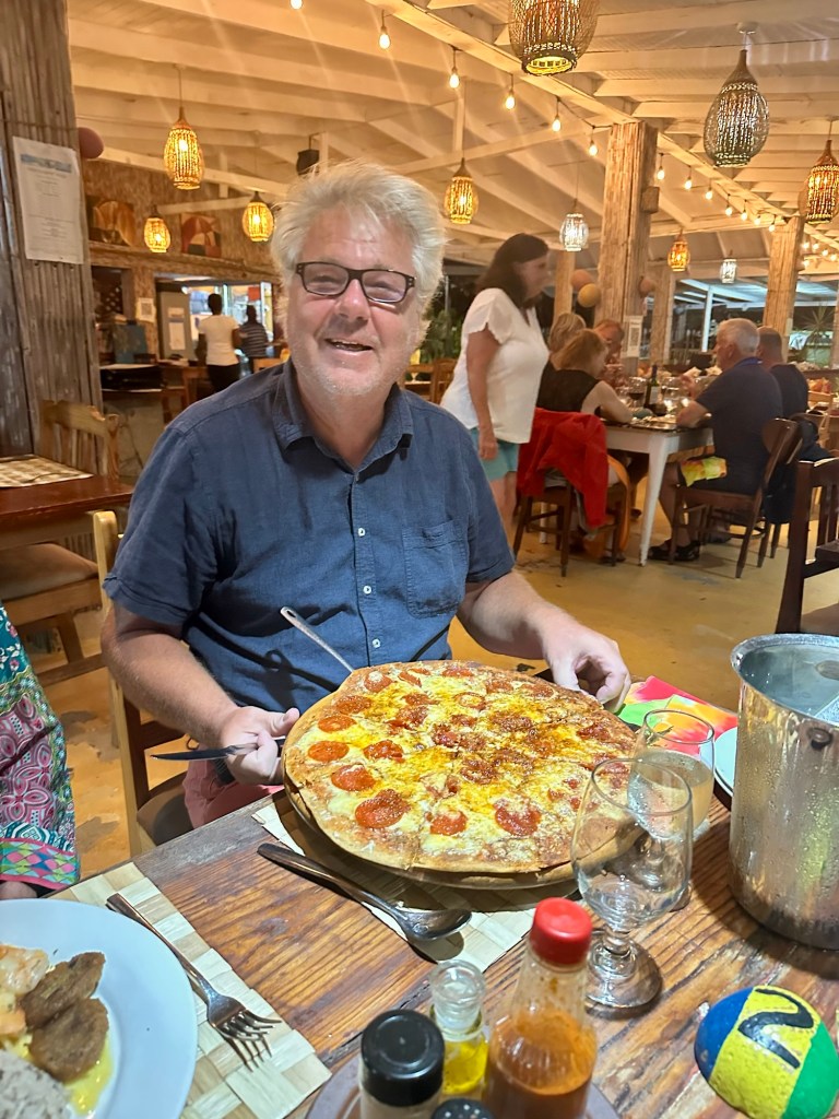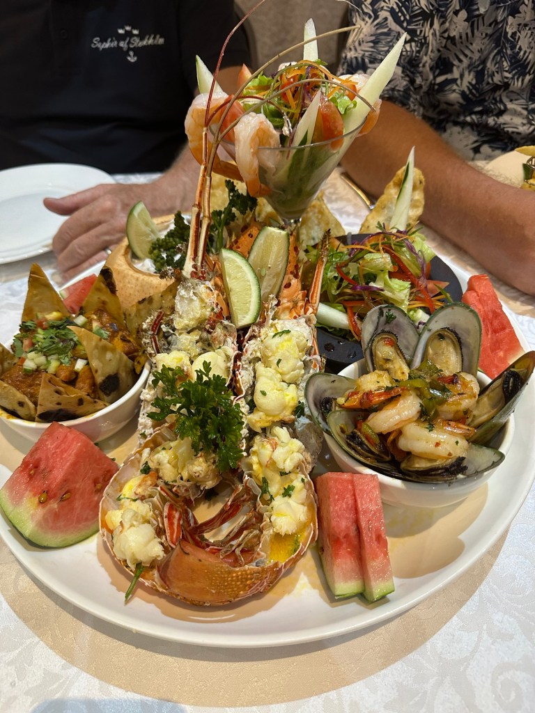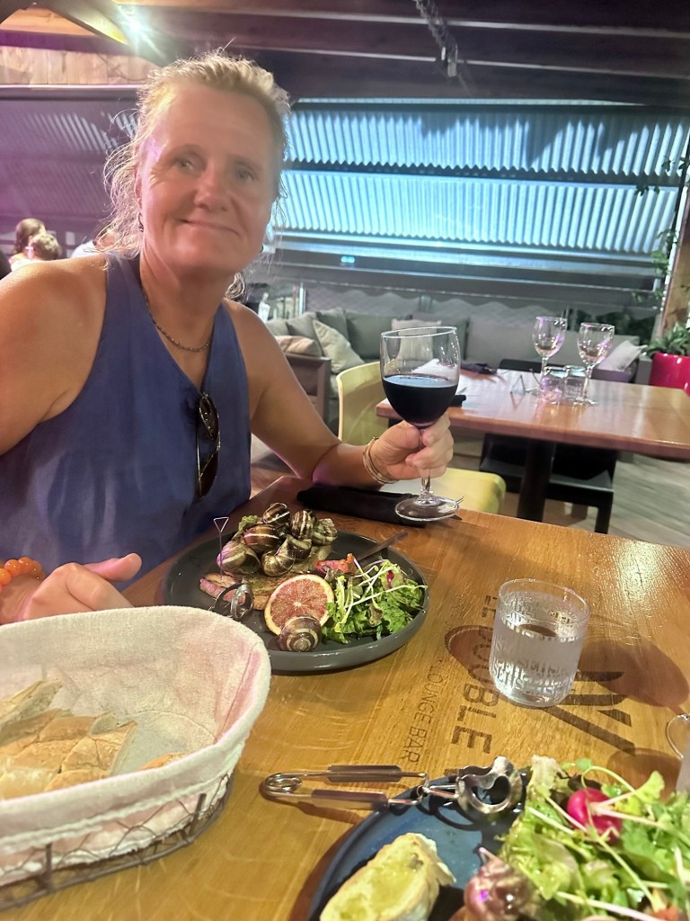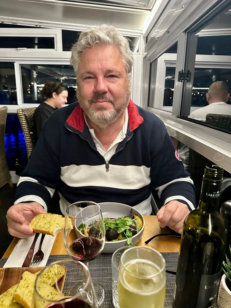 It was overcast all day; the water was at 22 degrees, and the air maybe at 24. I finished knitting one sleeve of the cardigan but not the finish. I’m considering whether to have a pink or blue edge. For dinner, we had tomato and mozzarella for starters and a pizza that we shared for the main course. I finished listening to “Death Gets the Blues.” Part seven about Hercules who goes on a cruise and solves crimes. A light listen that’s good during my watch. I went to bed at 22:00 and was woken shortly before 4. It’s great to have so many hours of sleep, or at least rest since I wake up occasionally as it rolls quite a bit.