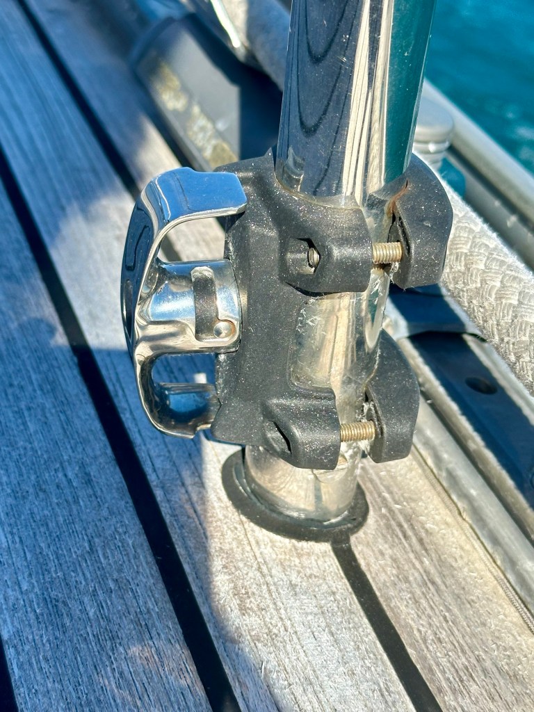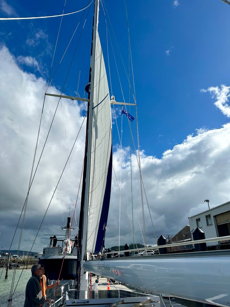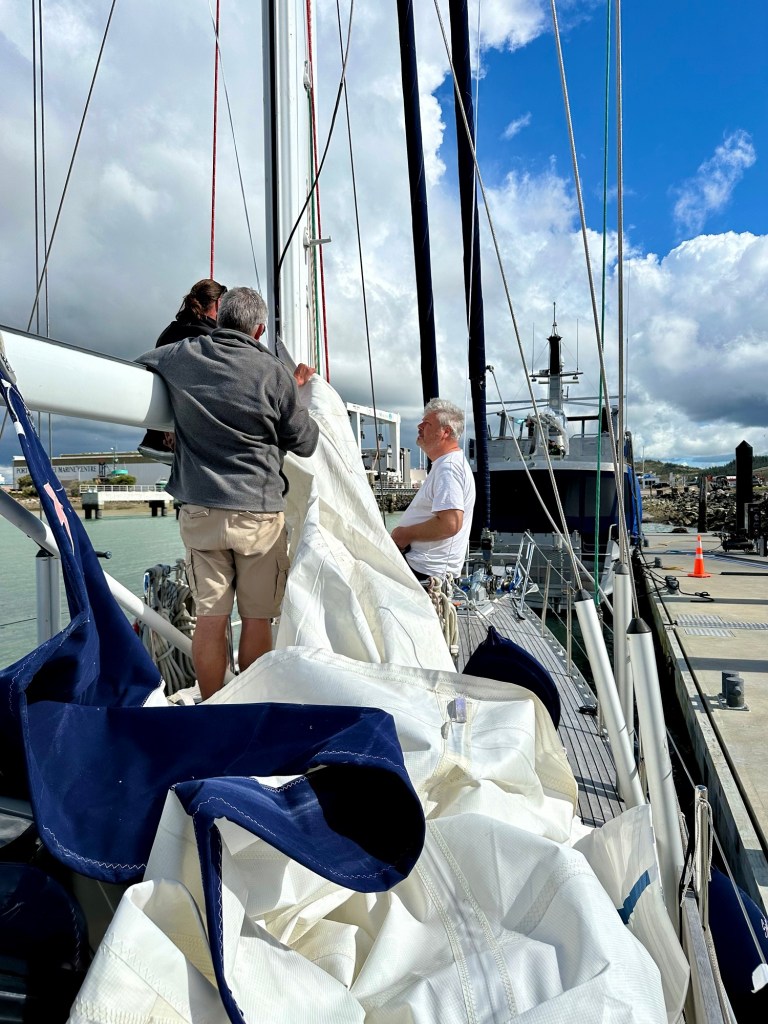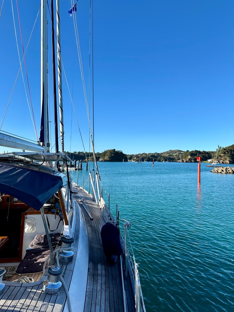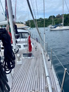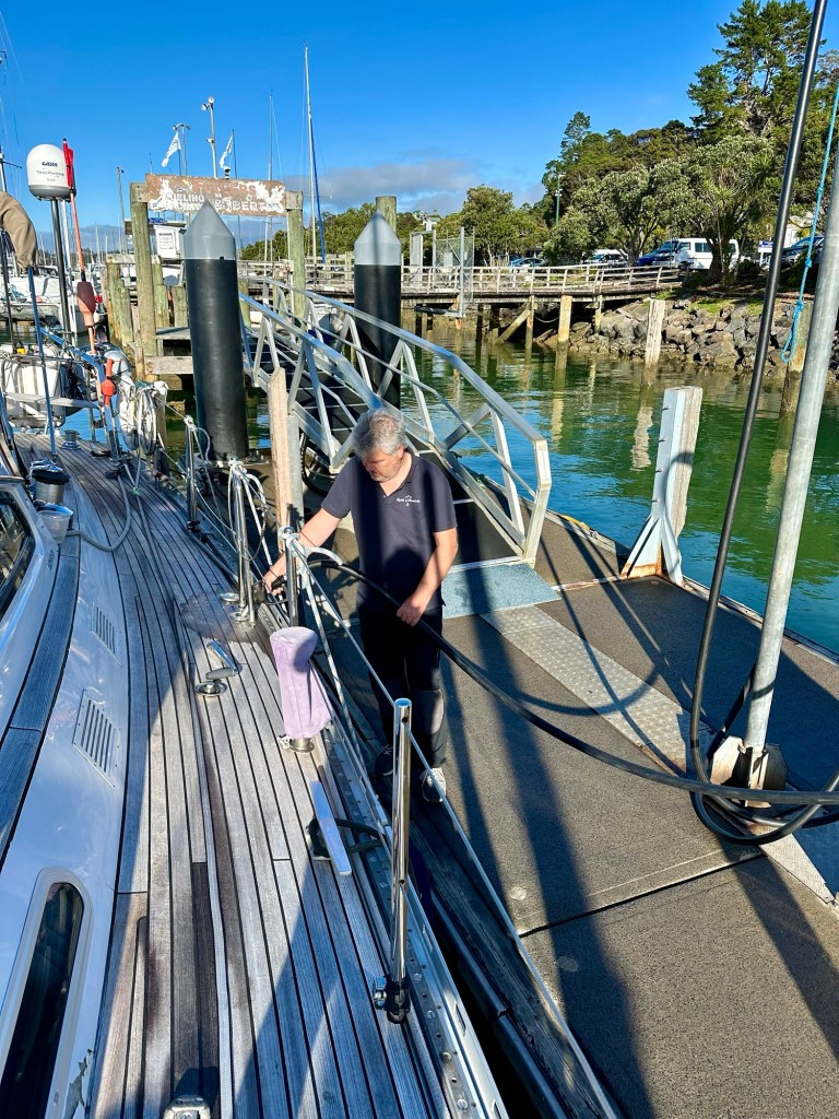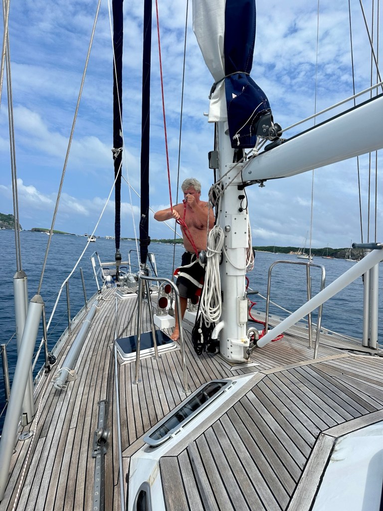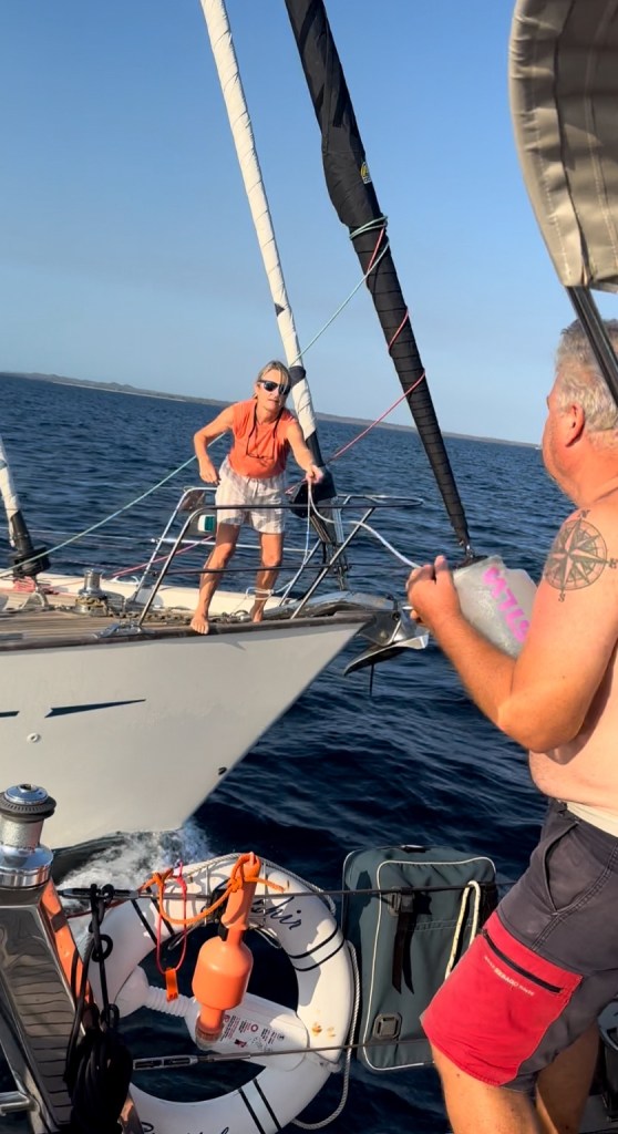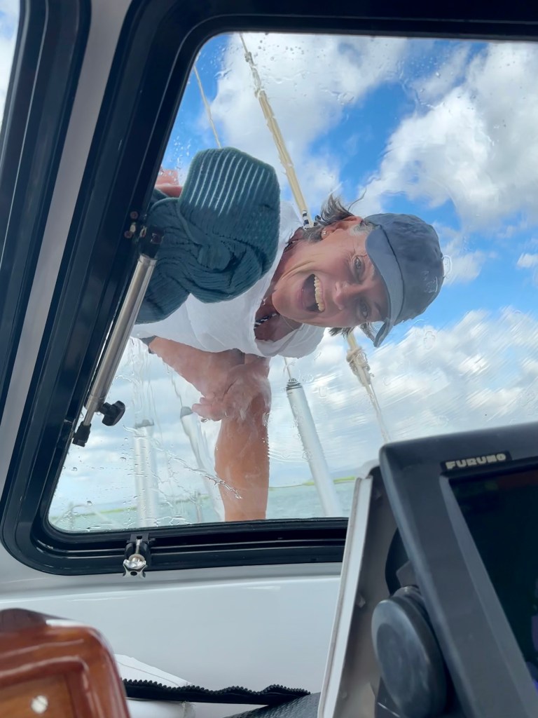 When Edgar wakes up properly, we go forward to fasten the boom to the small sail on the starboard side. I take the opportunity to wash off the salt from our windows since it’s rolling less. The easiest way to remove salt is vinegar and water.