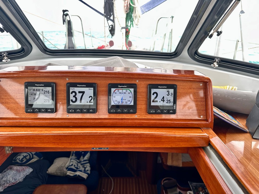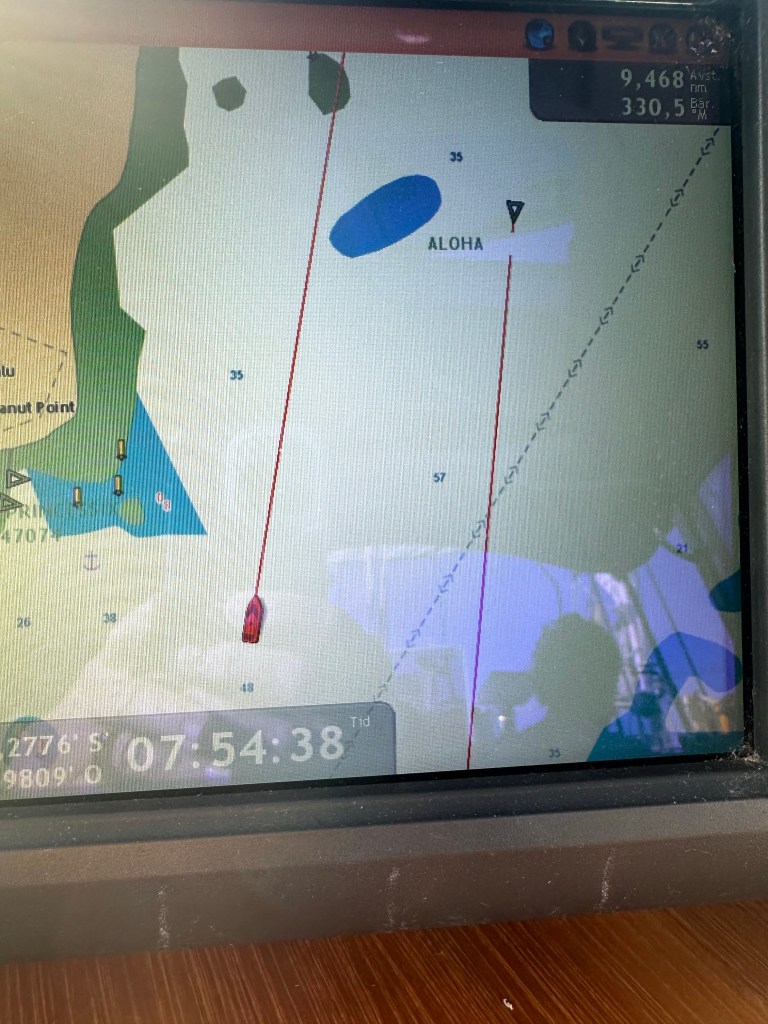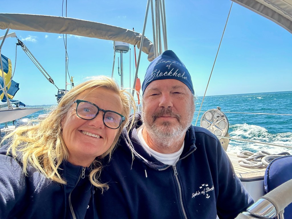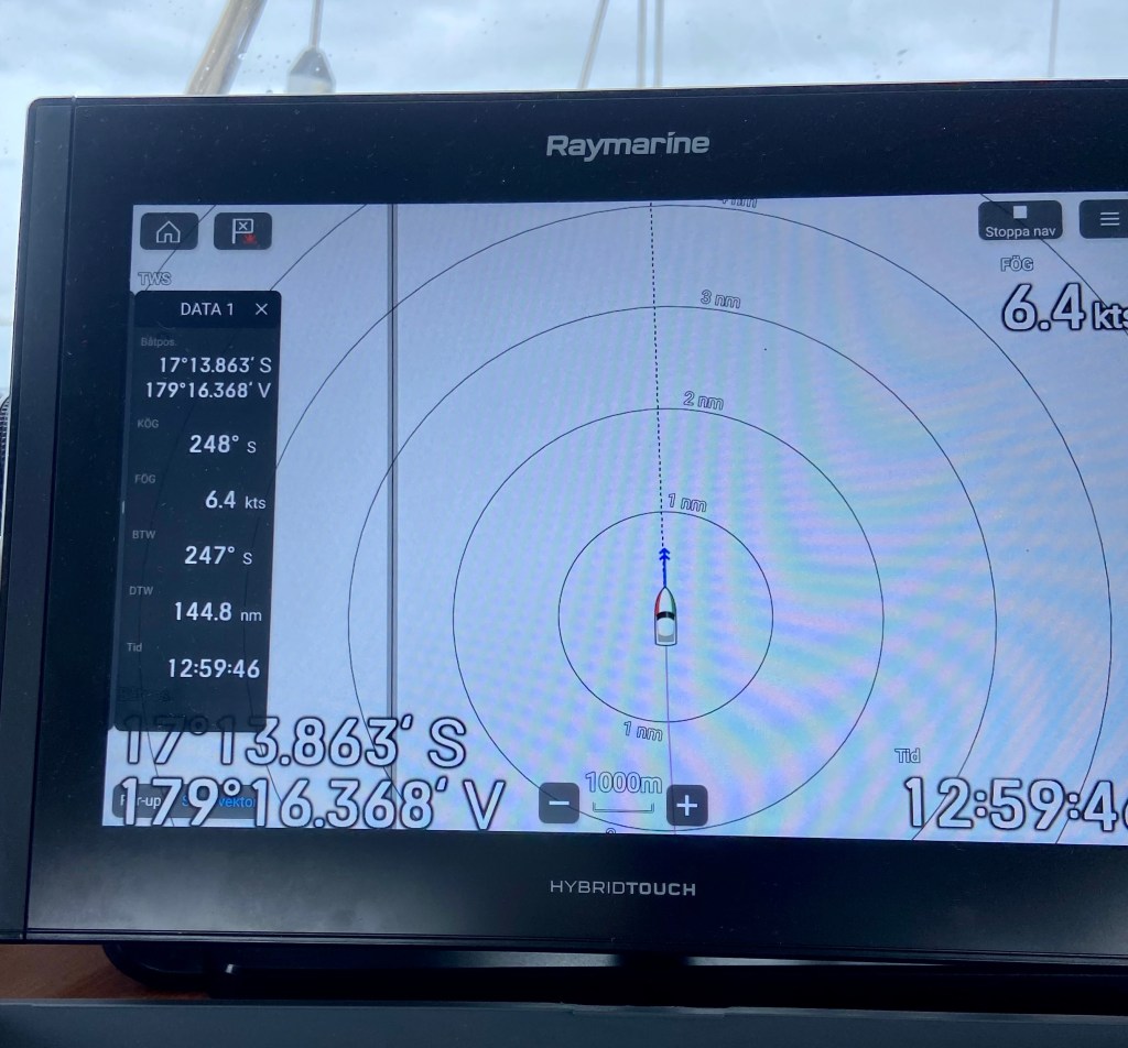 I get up, and the wind is coming more from the side, and we have crossed north of the rhumb line, so we go up and take down the boom. Now we can maintain a better course and steer towards our destination. The best part is that we also got a better sea state and more speed. We need the speed since we’re behind. Another sailboat has caught up with us. This one is called Maja and is 2.5 nautical miles off our starboard side. They apparently changed course right before I got up; otherwise, they would have sailed right into us. The plotter is working again after a we did a Norwegian reset (turn of the plotter and started it again).