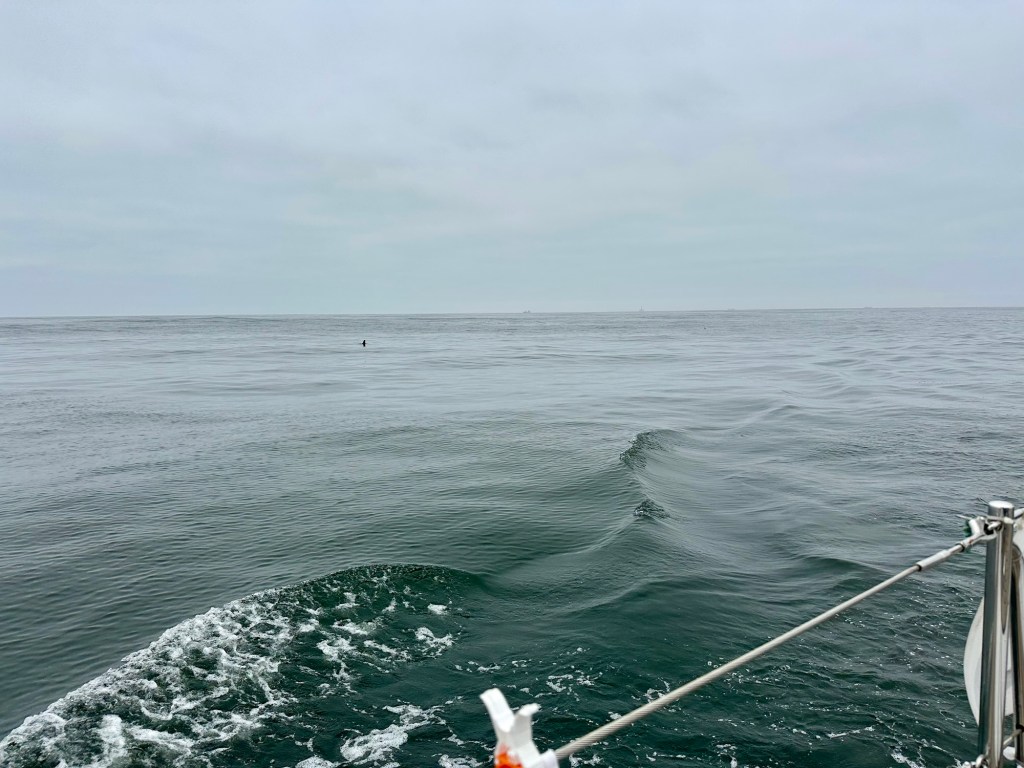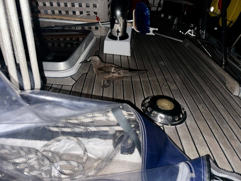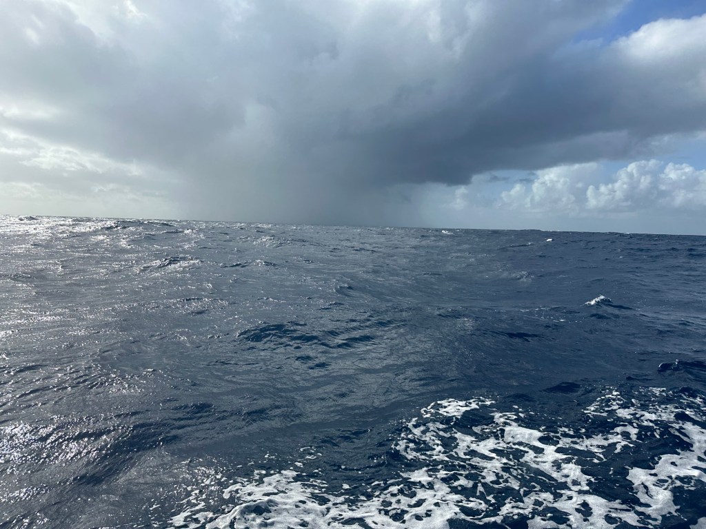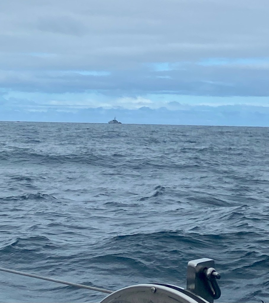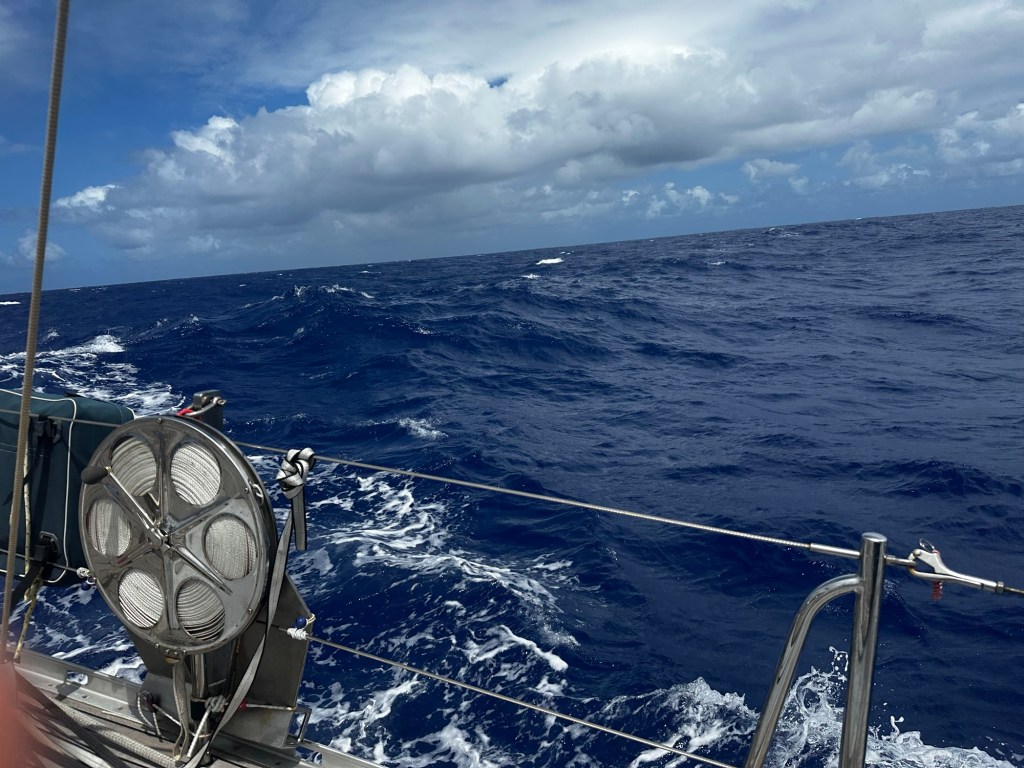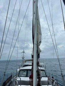 The small sail was out pretty much all day. This allows us to reach a maximum of 5 knots. If we have the genoa out, it gets a knot faster, but it’s an uncomfortable sail. It still rolls quite a bit, with some dips. The sun is trying to shine through the haze, and sometimes it succeeds. I slept on the sofa last night since it was rolling more than on the other nights. I got 4 hours and then another 3 in the morning. Edgar has been sleeping one to two hours at a time all day.