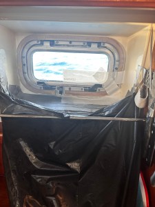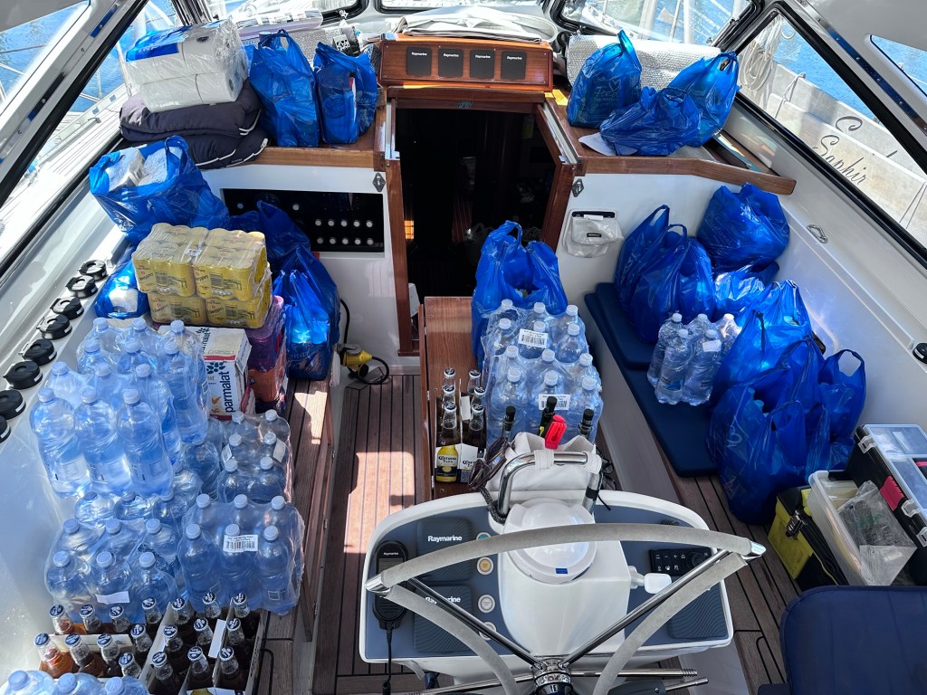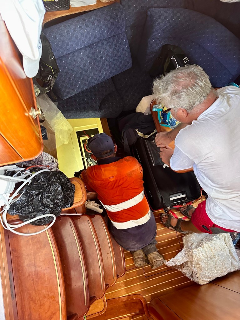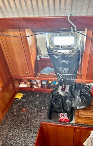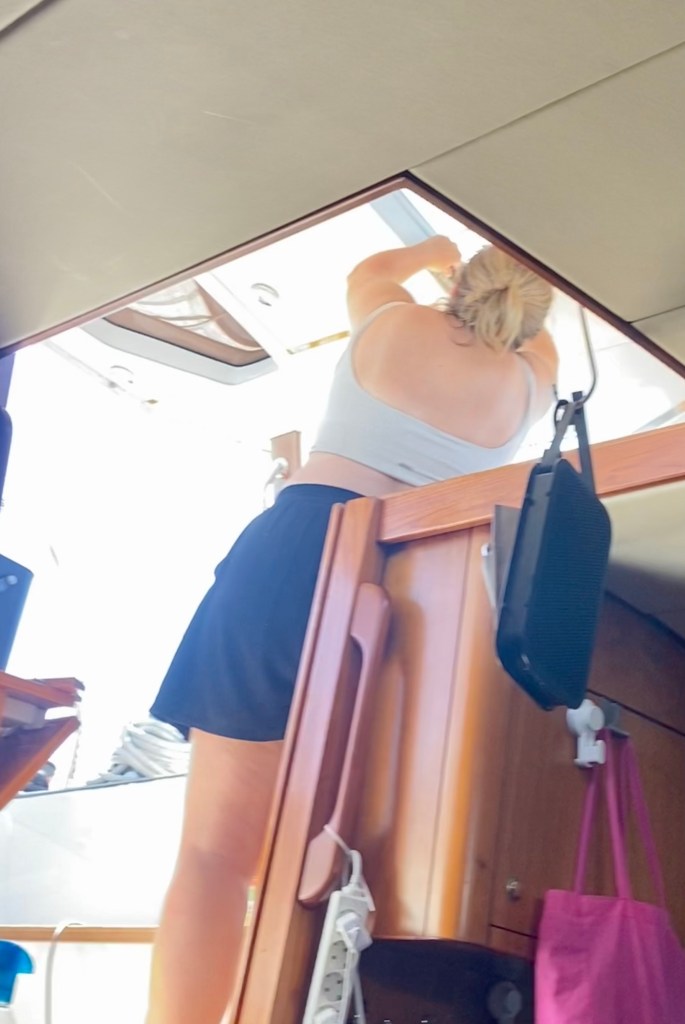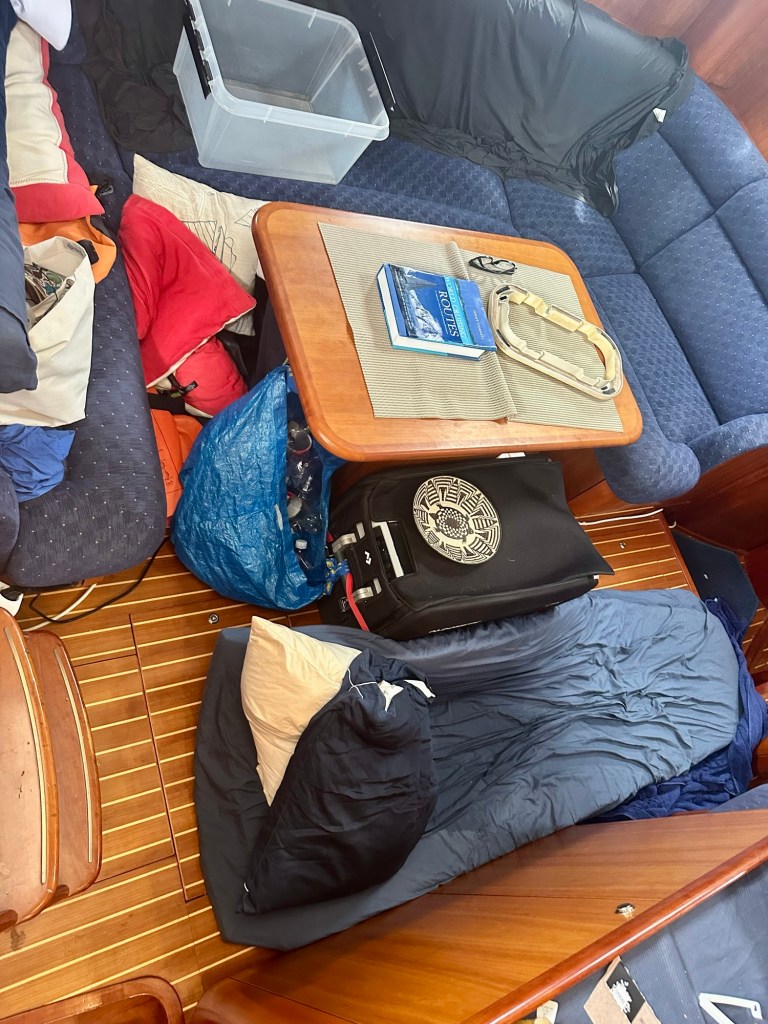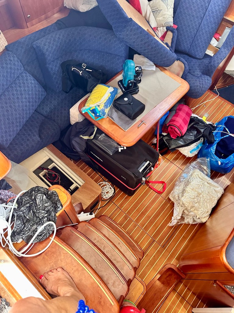 More water in the boat. The toilet was completely fine now in the evening, but there was a lot of water in the port side window box. We scooped out probably 3-4 liters. I discovered this when I needed to secure a box that was sliding around after it flew out of its place under the bed on the starboard side. The loose cushion I took from the port side turned out to be wet. So another thing to dry out.