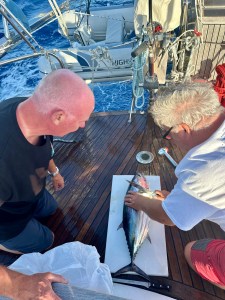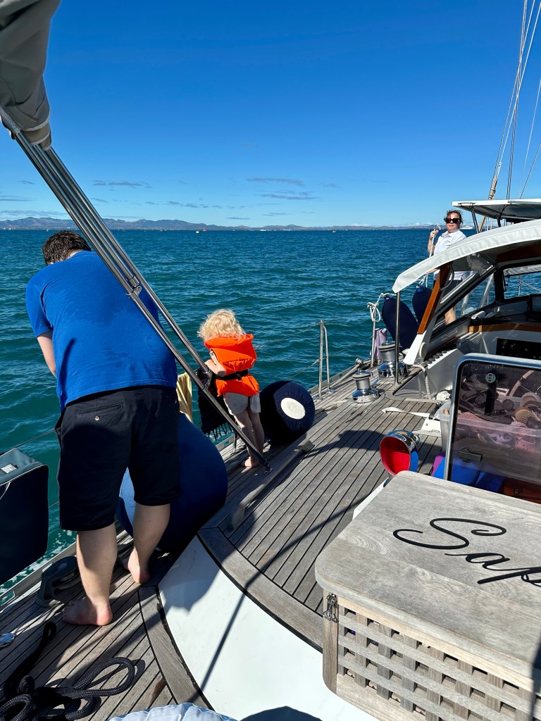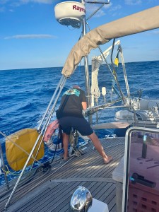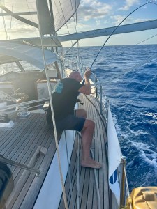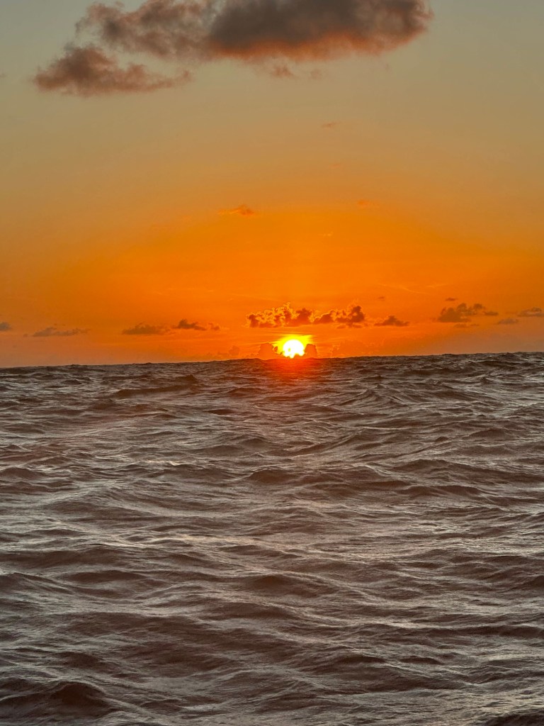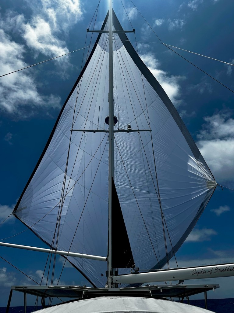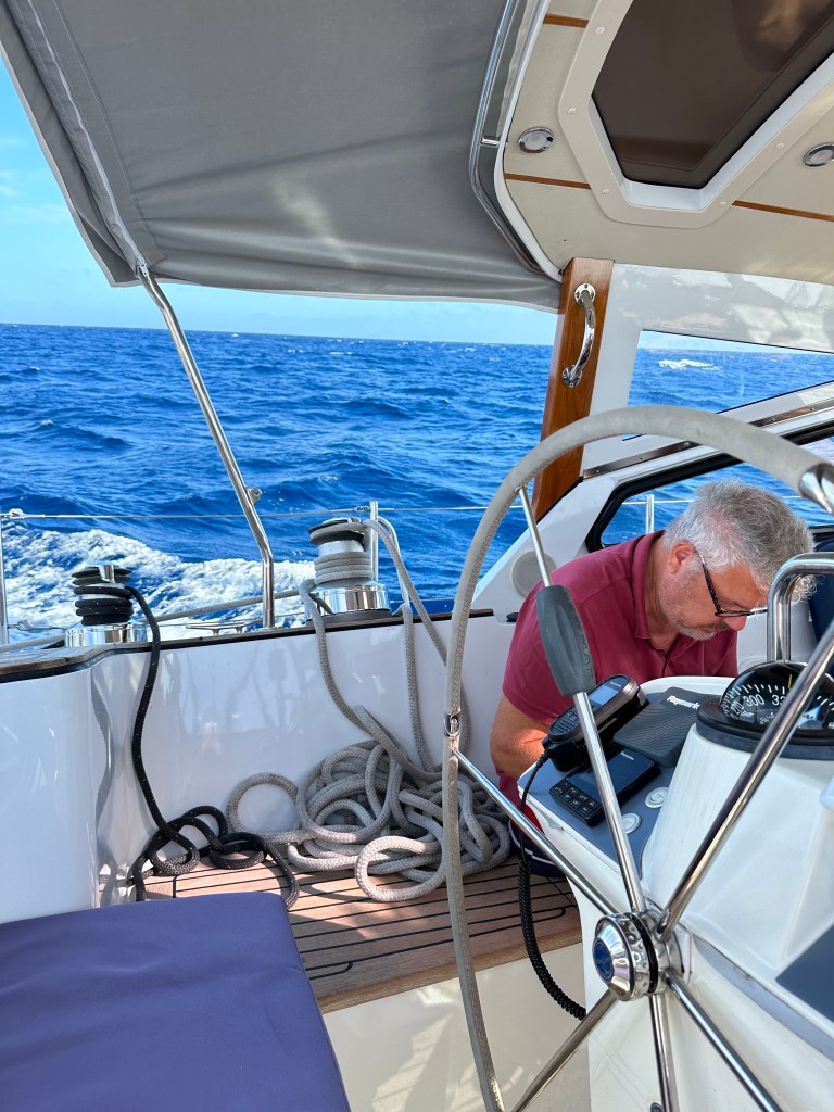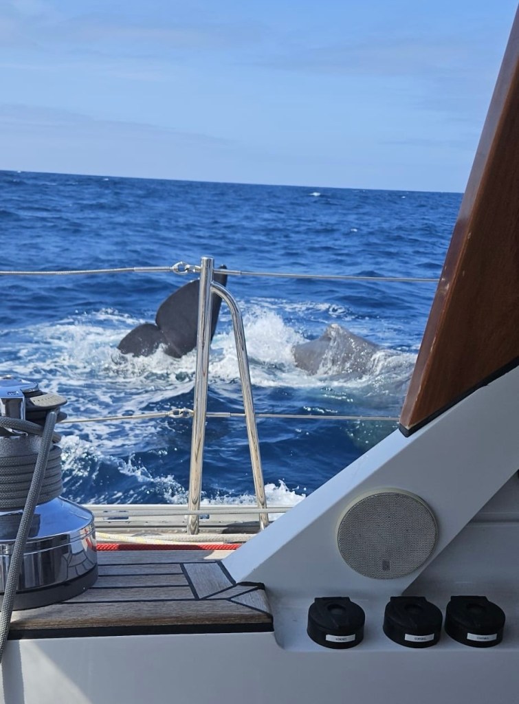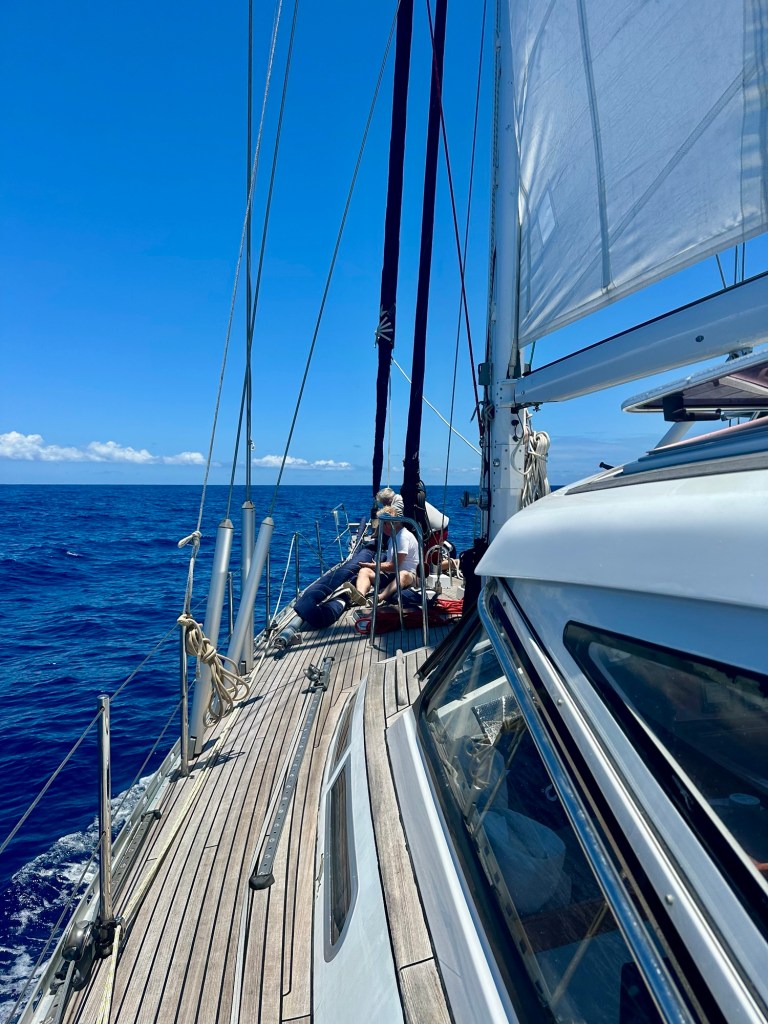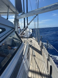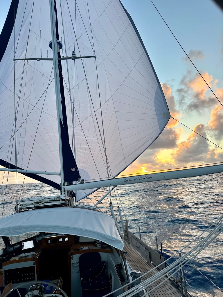 We have sailed all night at 3.5 knots! It’s been a very pleasant night’s sleep for me. Edgar slept from 9 to 12 and again from 6 to 8. He’s finally sleeping a bit longer, which feels great. Now the temperature has dropped on the boat, making a huge difference as well. The water temperature is 25°C compared to 29°C that we’ve had for the past few months. The engine was started at 5, and we attempted to sail at 8:30, but after 30 minutes, the engine was back on. A new attempt at 9:30 to sail. I want to sail as much as possible since it looks like we will have calm waters when we approach the Azores.