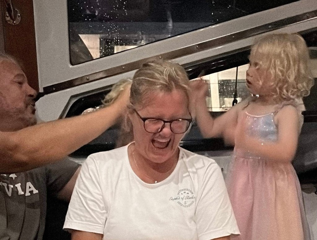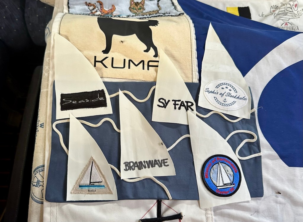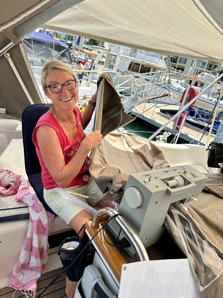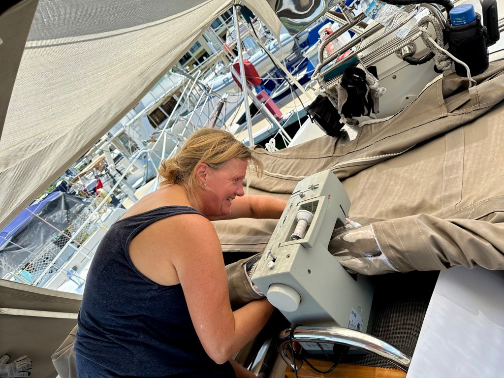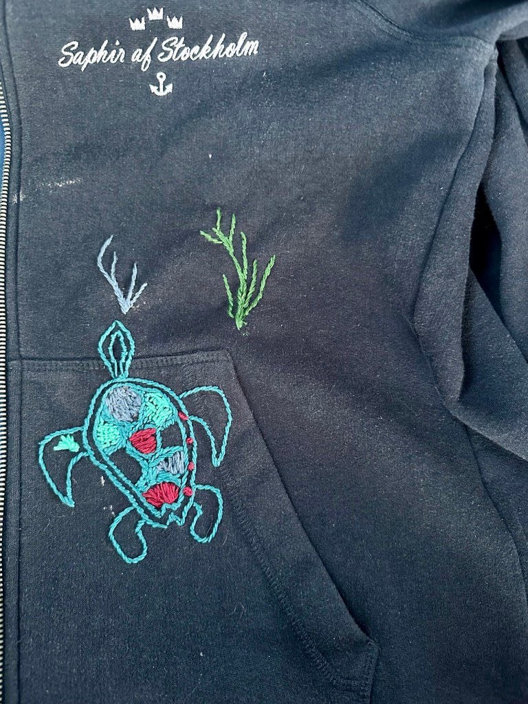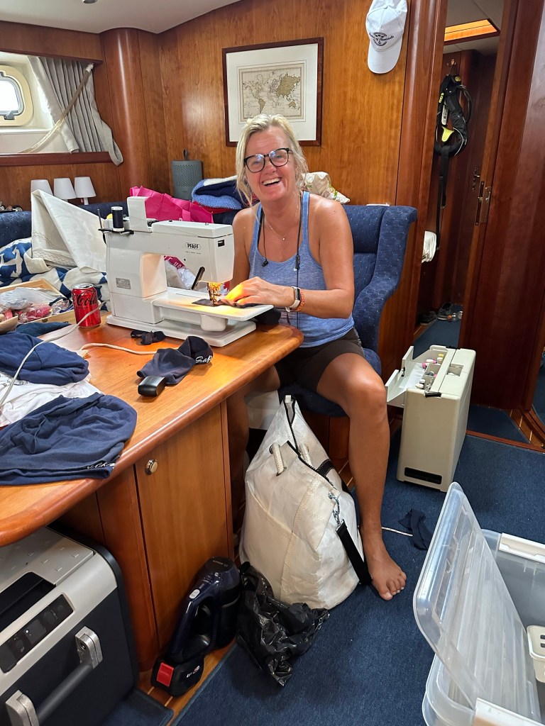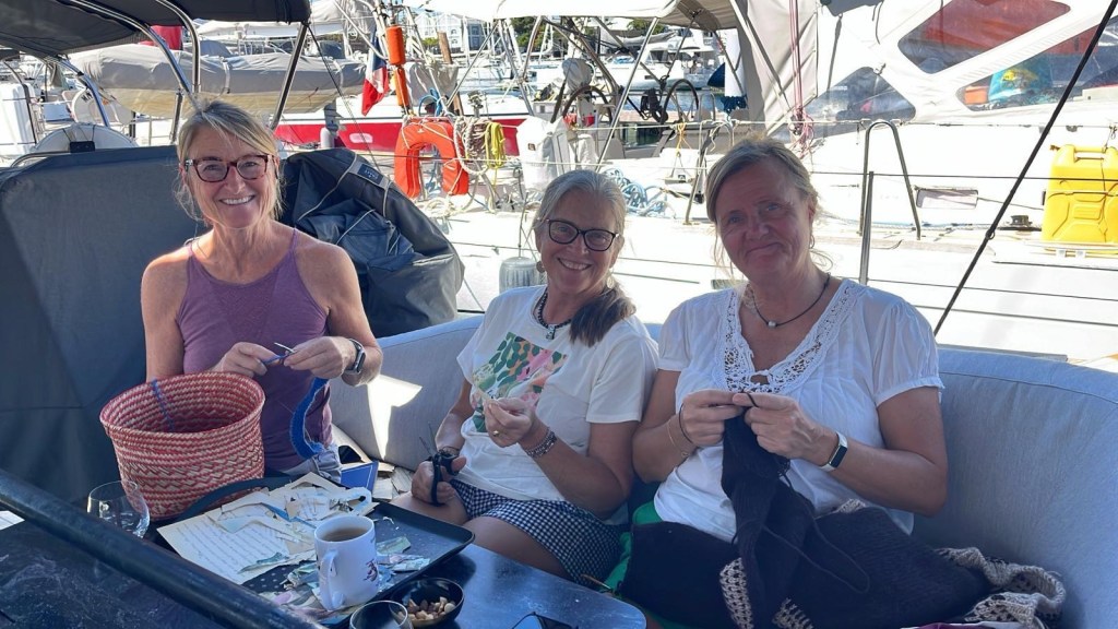 Continuing with the engine running. We are approaching the Azores. This morning when I woke up around 4, we had 100 nautical miles left. Edgar sleeps until 9, gets up to have breakfast, and at 11, he goes back to bed again. I’m knitting a poncho for Barbie dolls and embroidering on my Saphir hoodie, which I’ve managed to get bleach stains on.