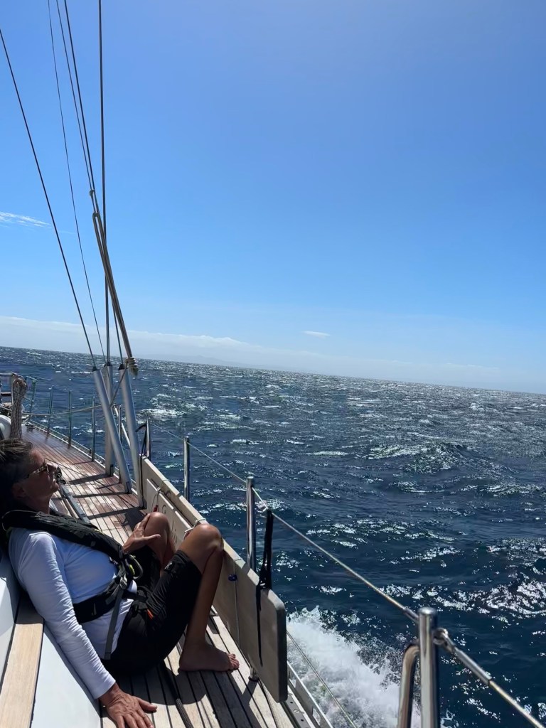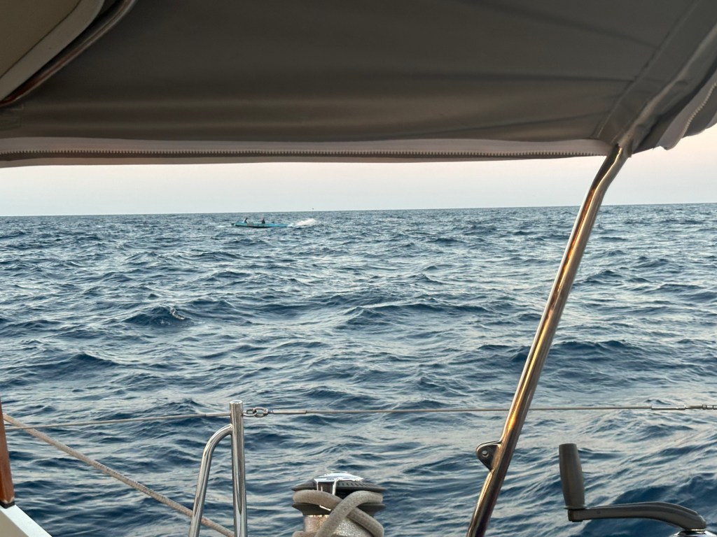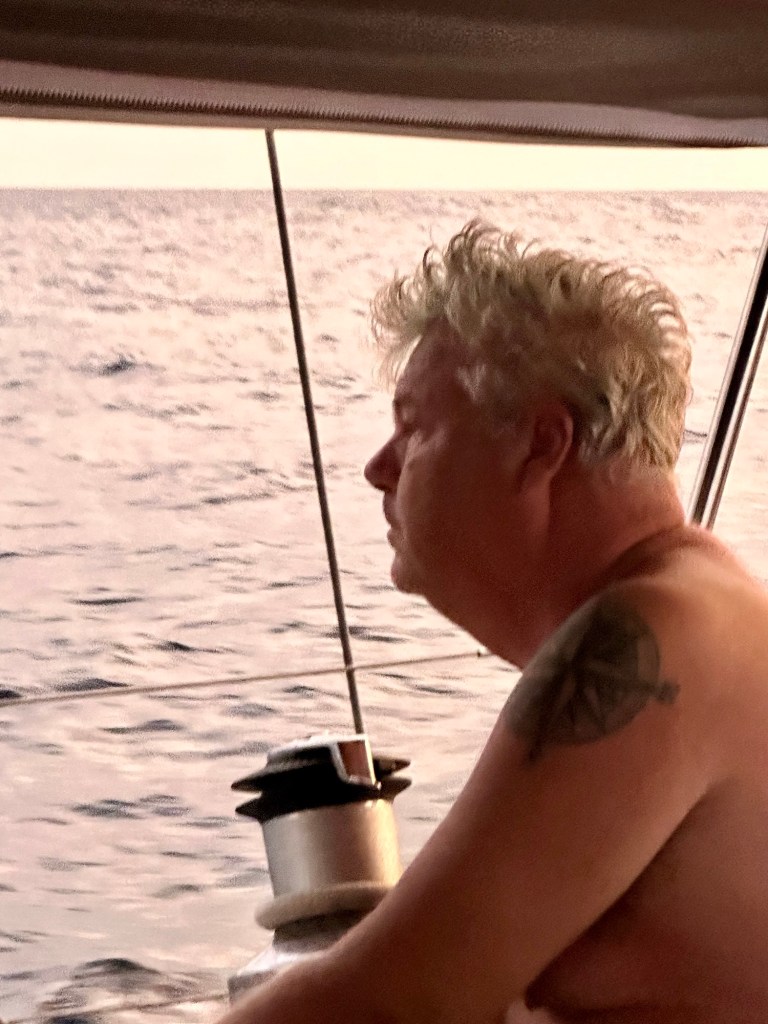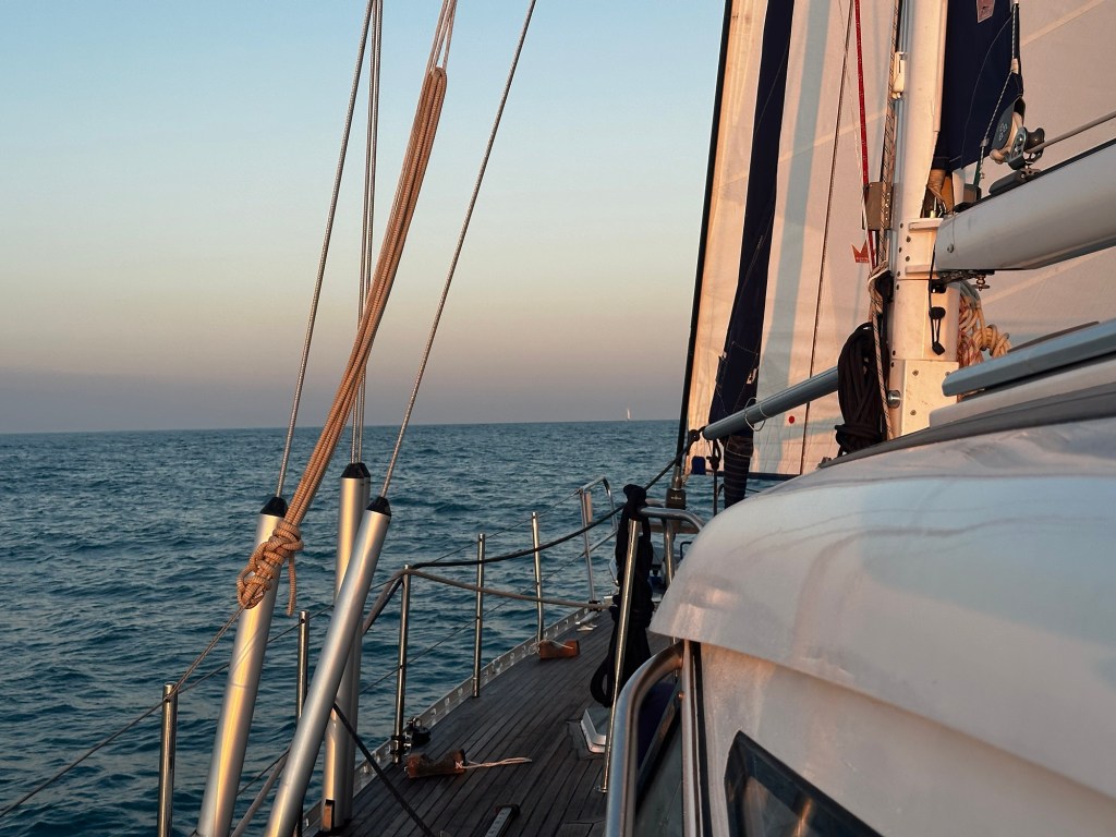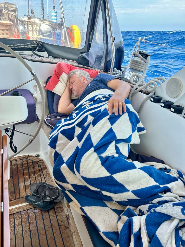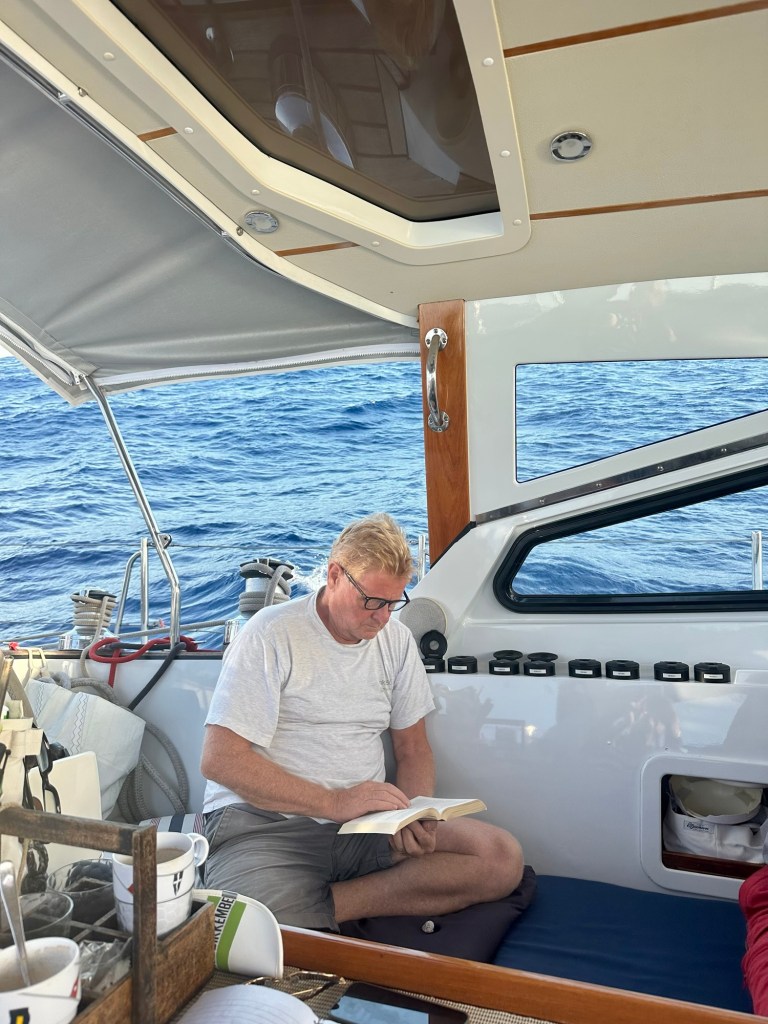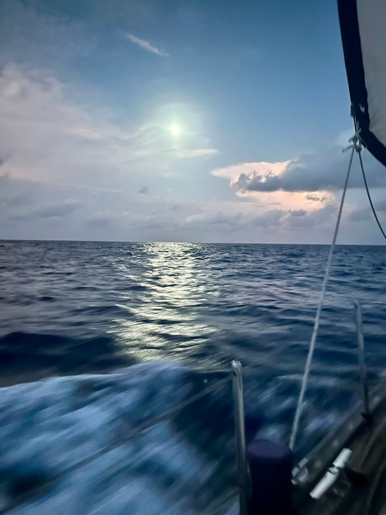 Day 4. I Slept until 3. I got 5 hours of sleep, but was up twice because Edgar needed help. It has been a calm day, and we’ve been able to maintain 4–6 knots. We’re steering northward but not directly toward our destination. We’re maintaining about 40 degrees off course; unfortunately, at some point, we managed to steer only 10-20 degrees off. Energy remains low since we haven’t eaten much. In the evening, it gets better because today we had boiled eggs and sandwiches for breakfast, yogurt for lunch, and lasagna with salad for dinner. I’ve binge-watched several episodes of “Parenthood” and started watching “Four Seasons.” Time goes a bit faster with Netflix.
