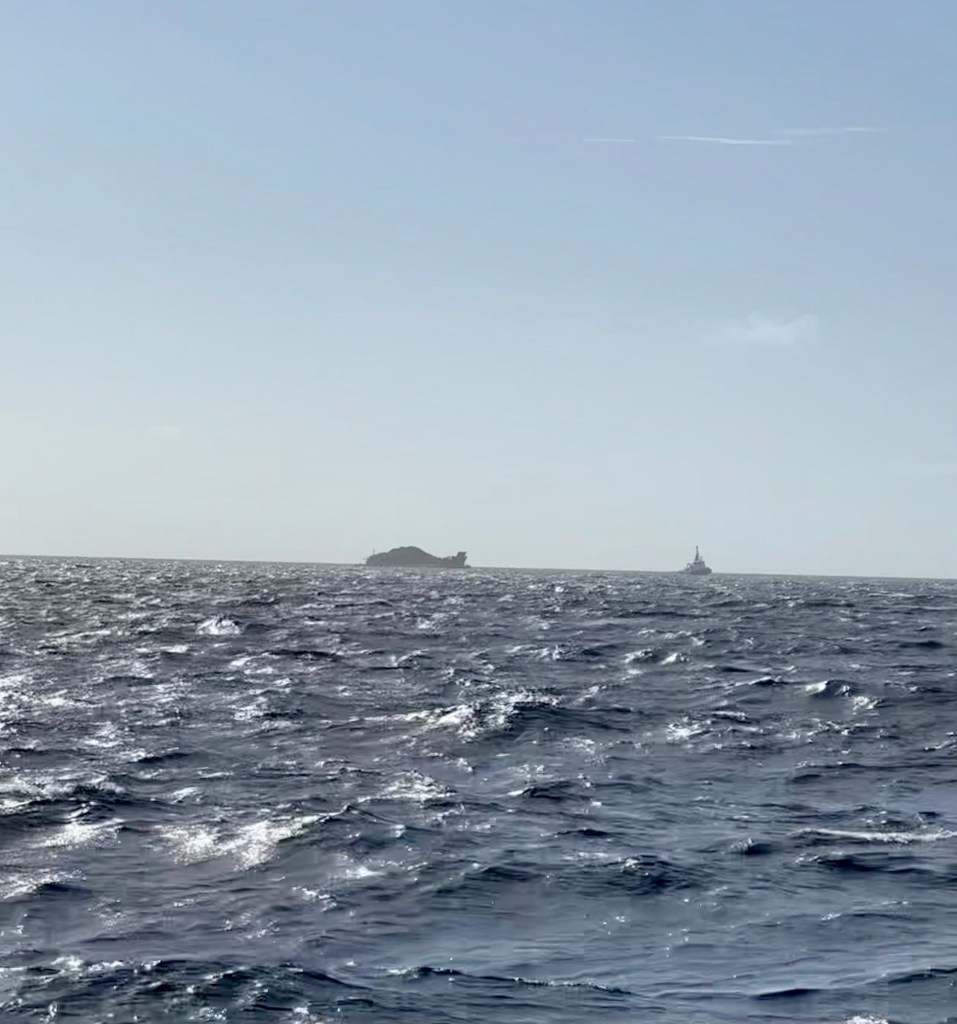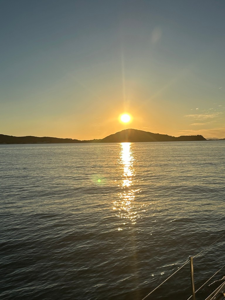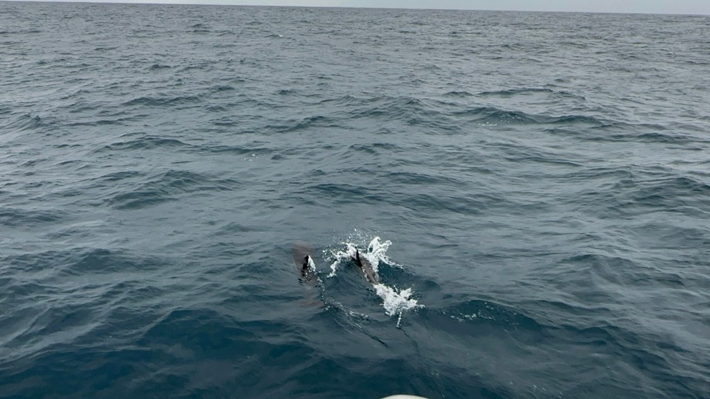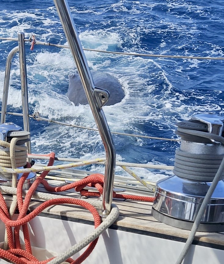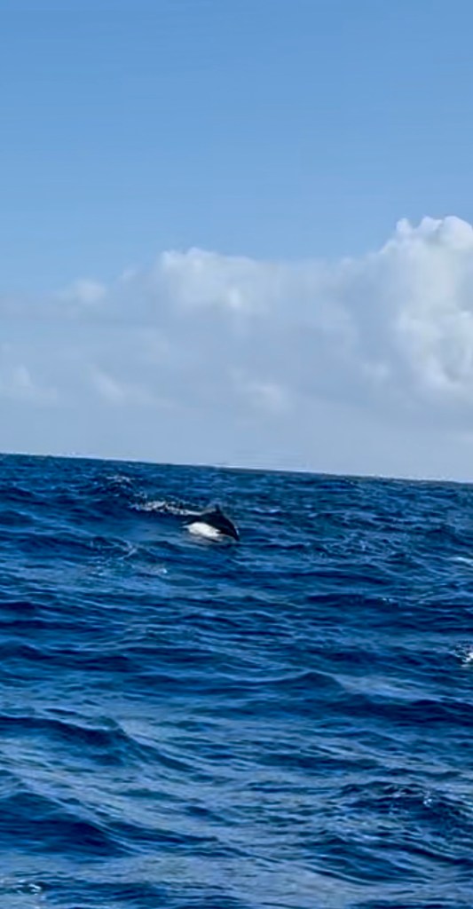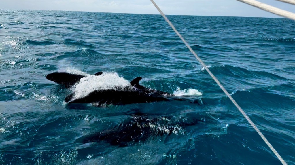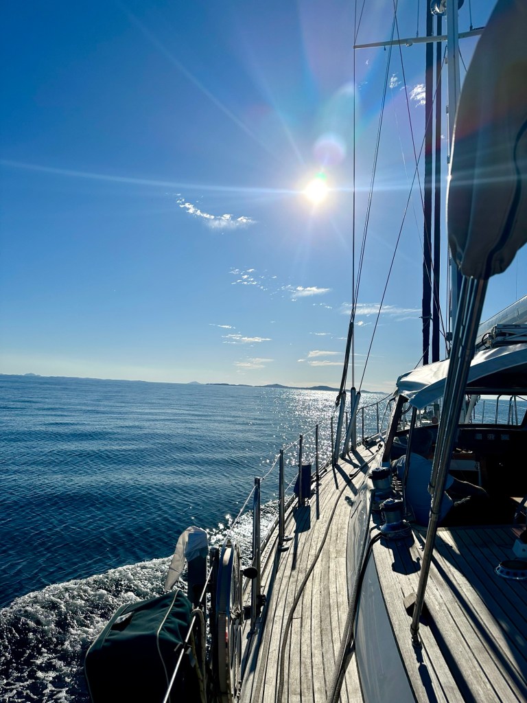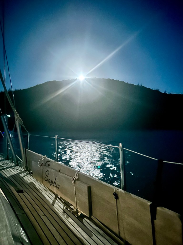We only sailed for an hour as the wind died again. The best part is that when we’re running on the engine, we can steer towards our destination because when we sail, we obviously steer north but not much westward. It makes for a detour when sailing. We got a very short glimpse of some dolphins, which were in a hurry.