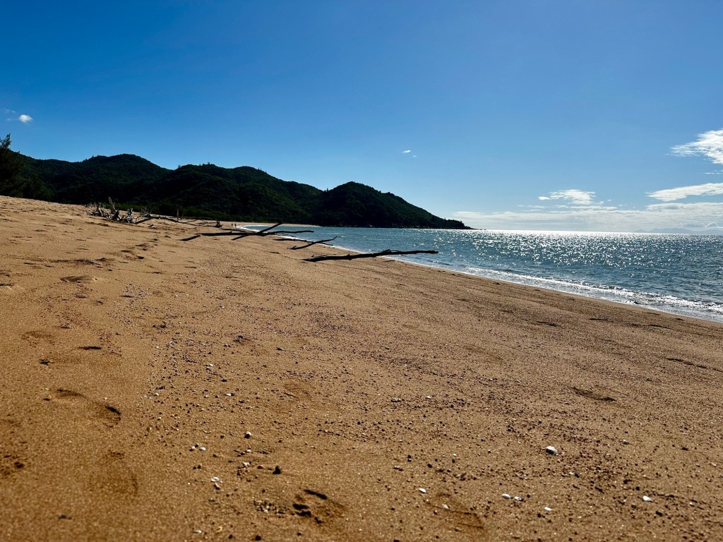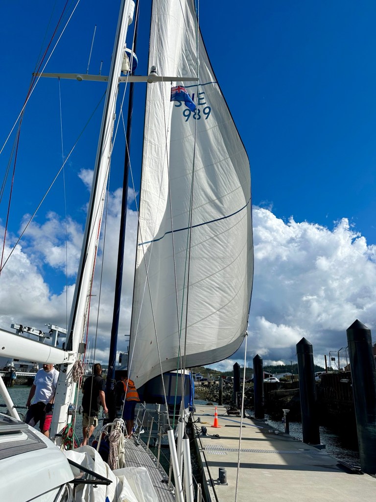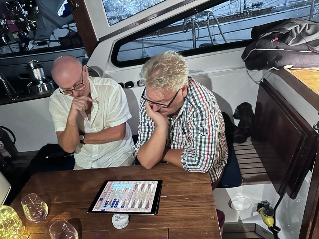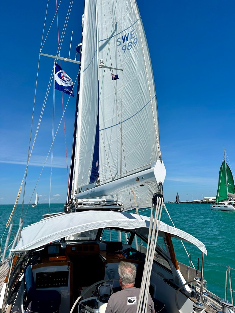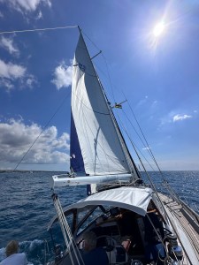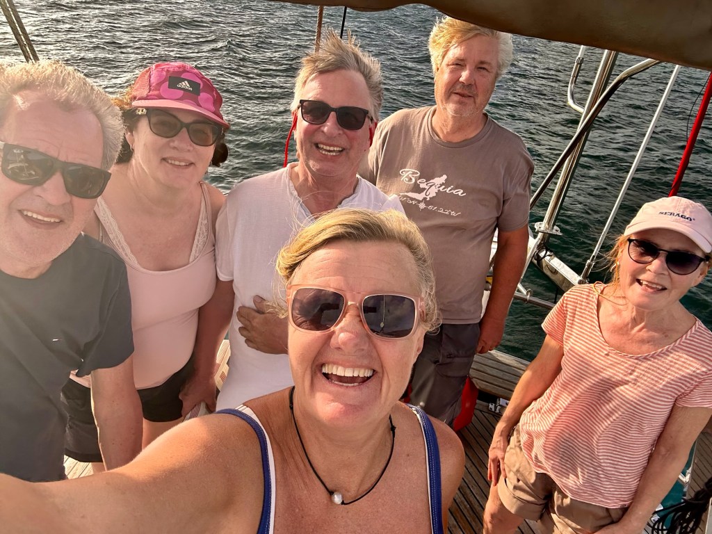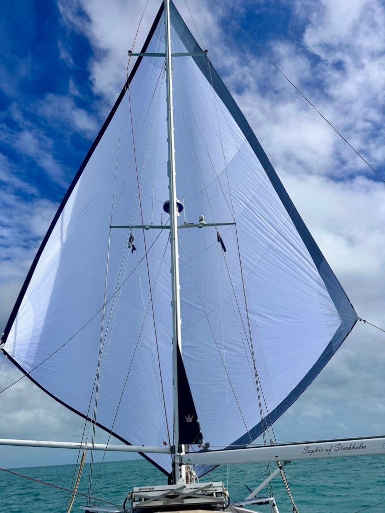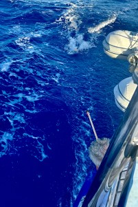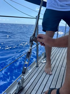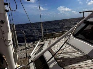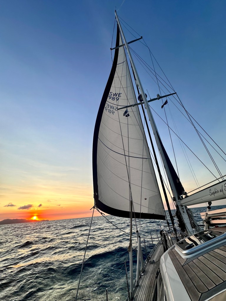 After a little while, we set the boom for the genoa on the port side. We’re sailing more comfortably now. This lasts until late afternoon when we take in the small sail and sail only on the genoa for an hour until we remove the boom and use the small sail on the port side as well. But that gets furled too.