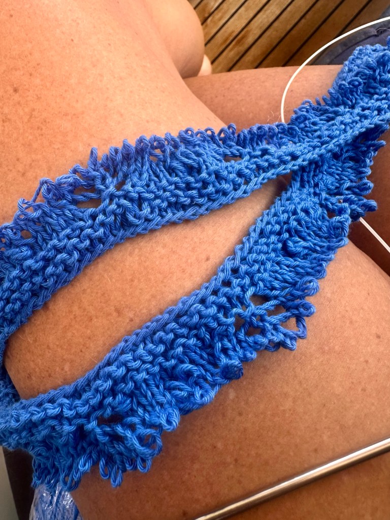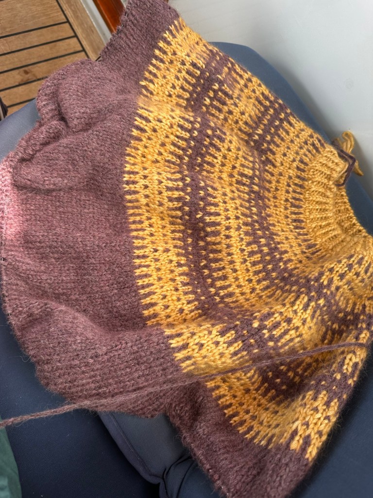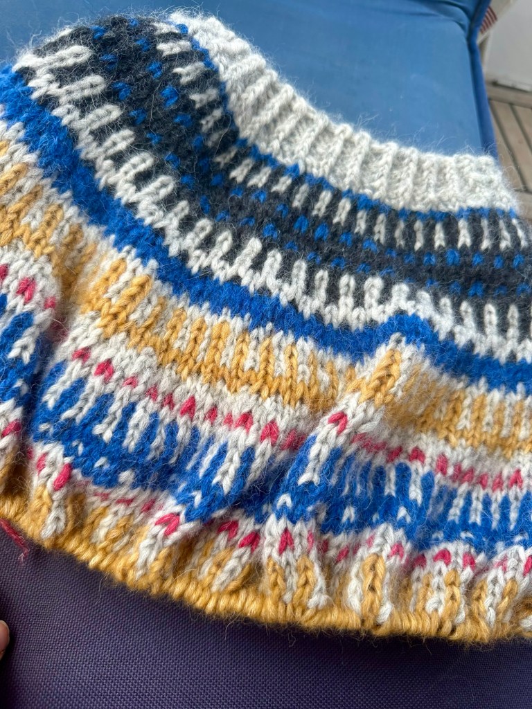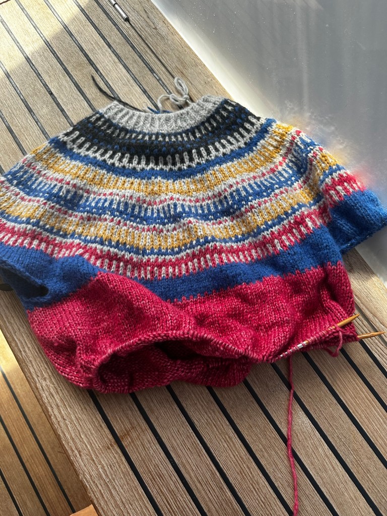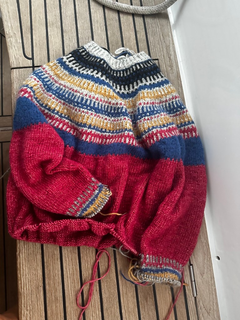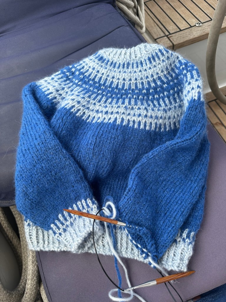 We were overtaken by a boat that was going 9 knots, probably a relatively large sailboat. Finally, I have finished my cardigan, but I’m not sure if I’m completely satisfied. I made an O-Cord blue edge around the entire cardigan. I will block it, as I think that will make a difference. Maybe I should have gone for a pink edge instead.
