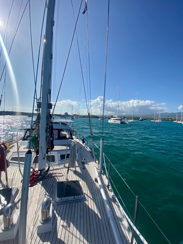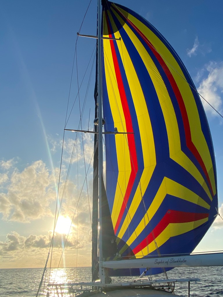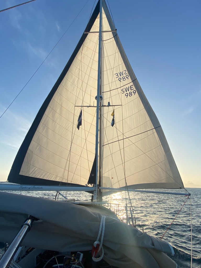 After many days on sea and needed to change sails we are getting better and better in changing the different sails settings and I do feel more comfortable doing it know. It is quit heavy, hard and tricky to take down the spinnaker and then take the spinnakerboom out as a preventer for the genua and the main boom for the other genua. Our wing by wing sail.