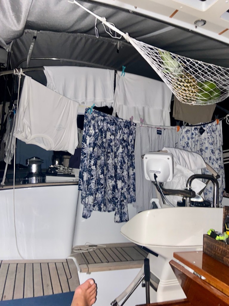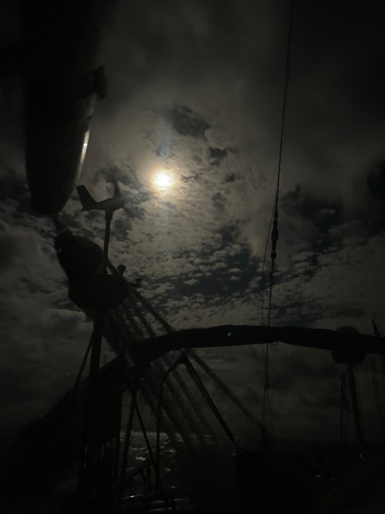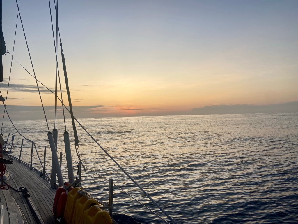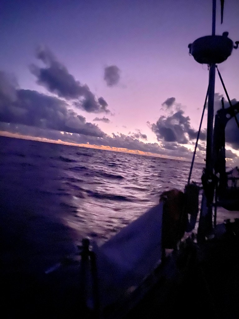 On the 6th night Edgar woke me up since we needed to take down our gennaker due to all the squalls around us. The weather got more tens and soon we saw thunder. Suddenly we have Hoka hey near us and we kept in contact during the hole night and steered around to avoid the thunder. It felt very good to have one boat close to us during those hours. Early in the morning we could relax. The sun was getting up and cleared the sky. That morning when I took the net call Edgar slept trough it all. It can be quit noisy and lots of schhrr and shhh sounds from the radio. In the middle of this is where we sleep. We can’t sleep in our cabin due to all the rolling so we take turns on the couch which we have put an extra mattress from the bow cabin.