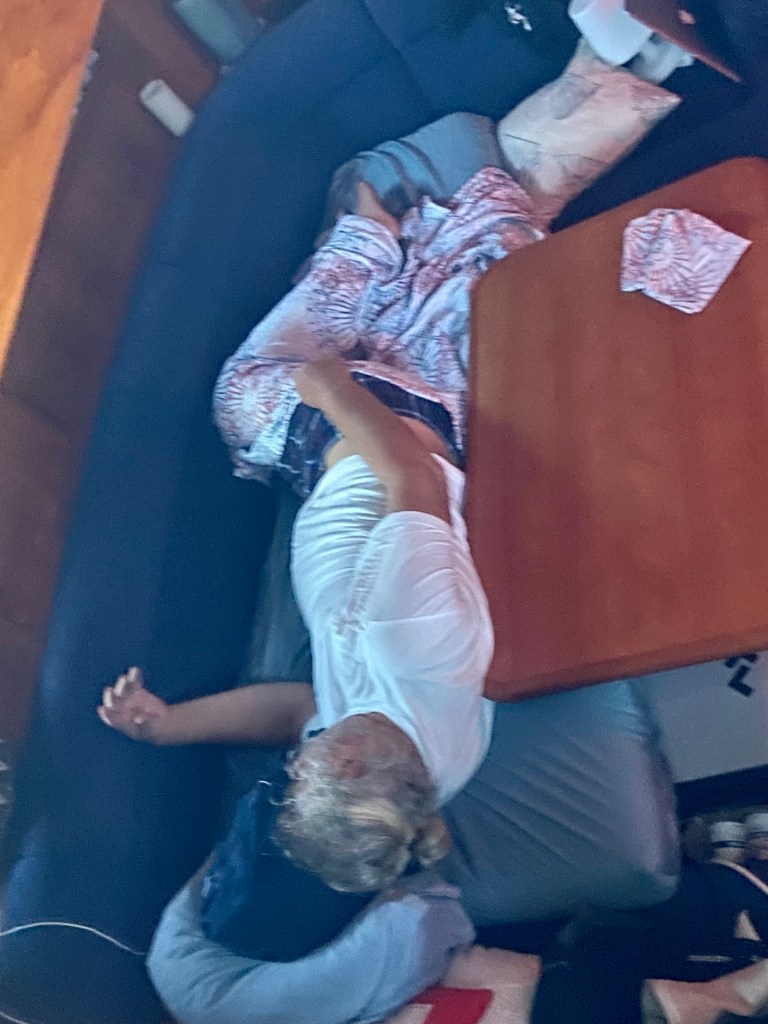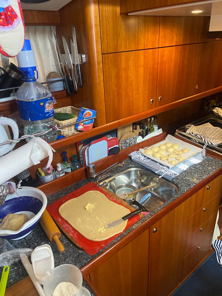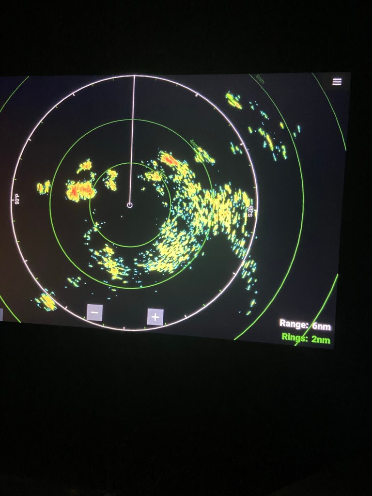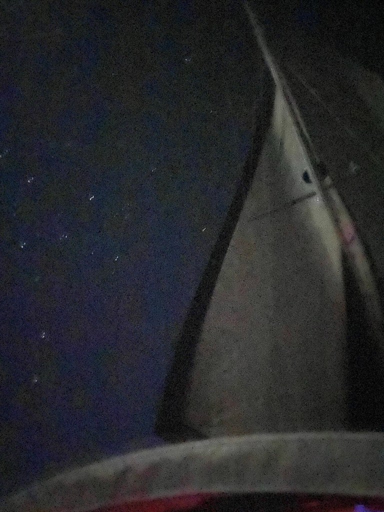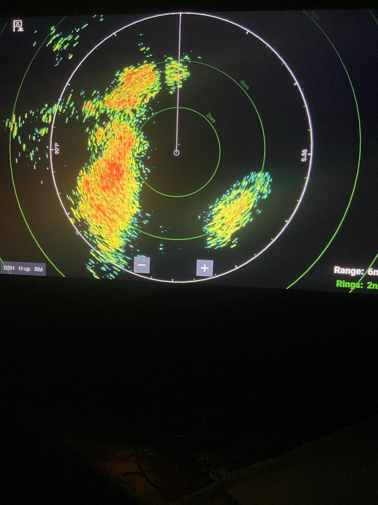 On the 6th night Edgar woke me up since we needed to take down our gennaker due to all the squalls around us. The weather got more tens and soon we saw thunder. Suddenly we have Hoka hey near us and we kept in contact during the hole night and steered around to avoid the thunder. It felt very good to have one boat close to us during those hours. Early in the morning we could relax. The sun was getting up and cleared the sky. That morning when I took the net call Edgar slept trough it all. It can be quit noisy and lots of schhrr and shhh sounds from the radio. In the middle of this is where we sleep. We can’t sleep in our cabin due to all the rolling so we take turns on the couch which we have put an extra mattress from the bow cabin.