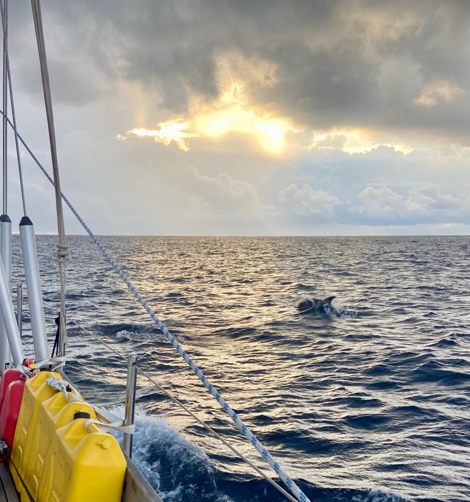 On the third night sitting and watching the sun set and taking some photos we suddenly get company by lots of dolphins. The played around our bow for 10 minutes before they move on.