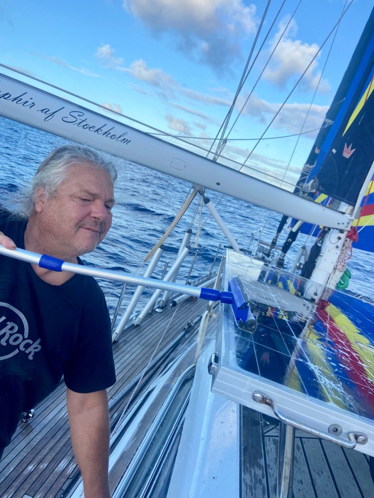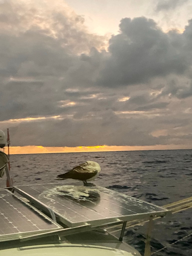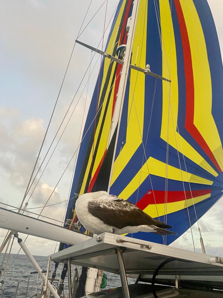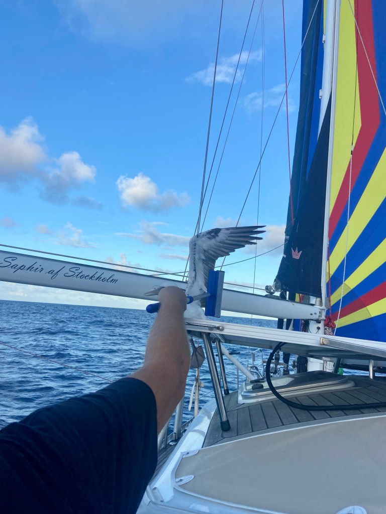 12 Mars at 04.00 we have done halfway which we celebrated with a glass of bubbles the next evening. We also discovered that we had got company on the boat. A grey feted booby had sleepy on our sun panels. In the morning Edgar manage to get him of the boat so we could clean the sun panels. It was not that easy but lots off water , holding tight on to boat that is rolling we got it cleaned. Now we just needed to keep the boby away from the boat. That’s why Edgar have the stick next to him. Took us the hole day until the booby gave up.