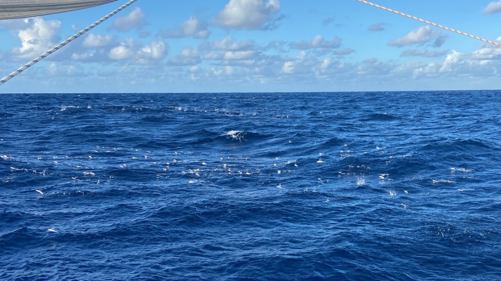 One afternoon it suddenly flew hundreds and hundreds of flying fishes on the ocean . I saw them near and far away from the boat and in between I saw some medium sizes fishes jumping around. Think it was tuna but not sure. I did catch the flying fish on film.