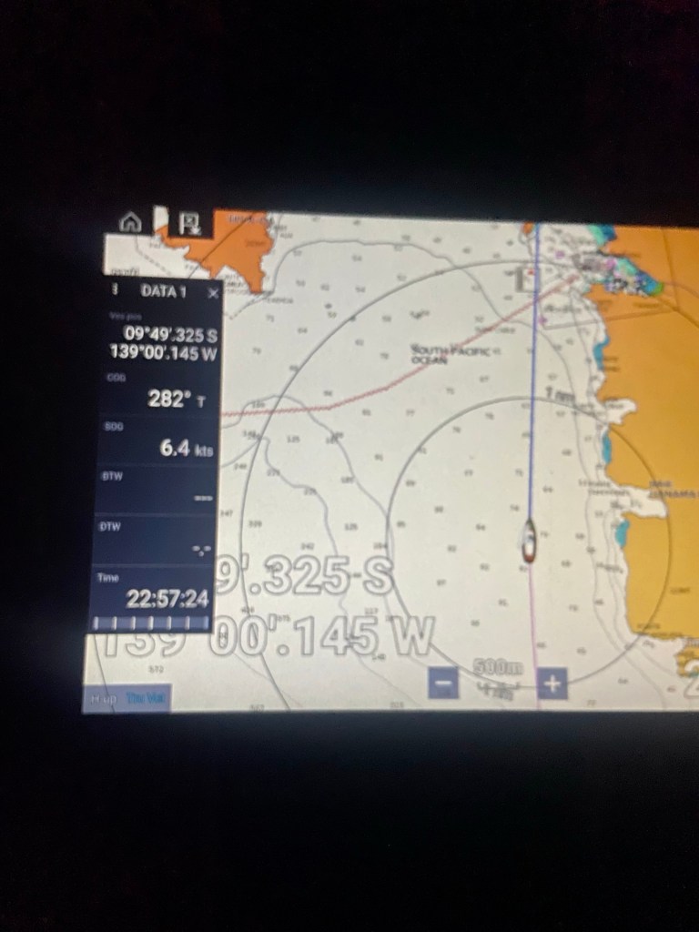 We will cross some timelines during this sailing, It will be in total -3,5 hours (-9.5H UTC)when we get to Marquesas. The boat clock will follow the Galapagos time (-6Hour UTC)until we are anchored in Hiva-Oa Marquesas.