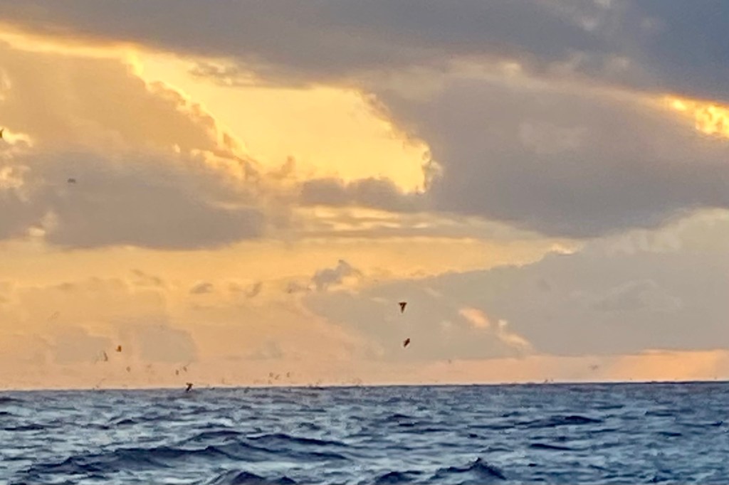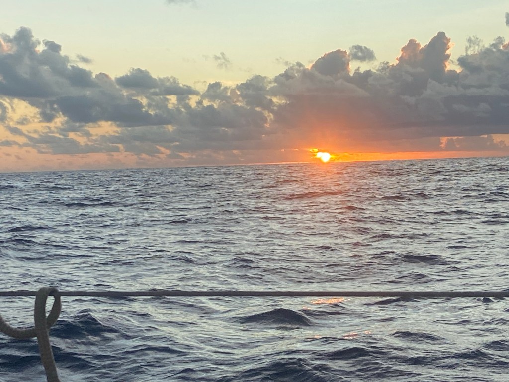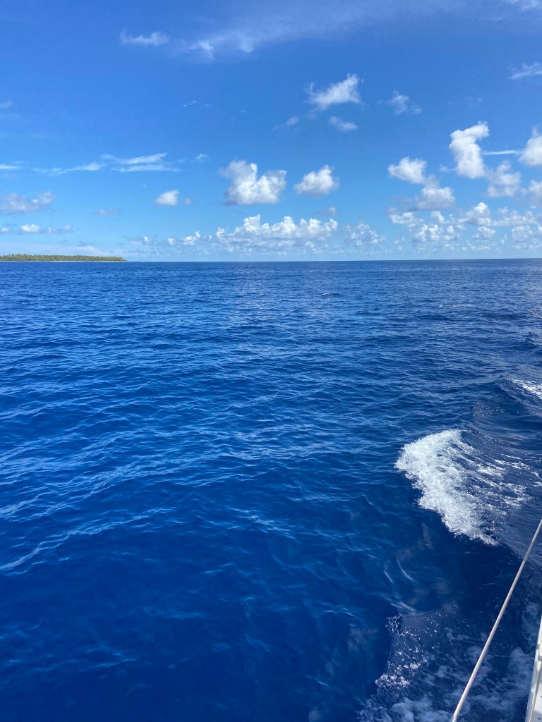 My night was was between 01.00-04.00. It was a good sailing but we was going a bit to much north. In the morning the guys took of the bom and we could take the right course straight to Raroia. Now we only have 30 hours to be there in time so we could get in to the reef due to sight and current. So far so good. Keeping a speed between 6.5-7,2. The fishing gear is in the water and after an hour we see a lot of birds flying around and some fish jumping and it took 15 min and we hear bang. Our fishing line went of. Good that we bought two new tassels. Chris made a new ending so let’s see if we can catch a fish….