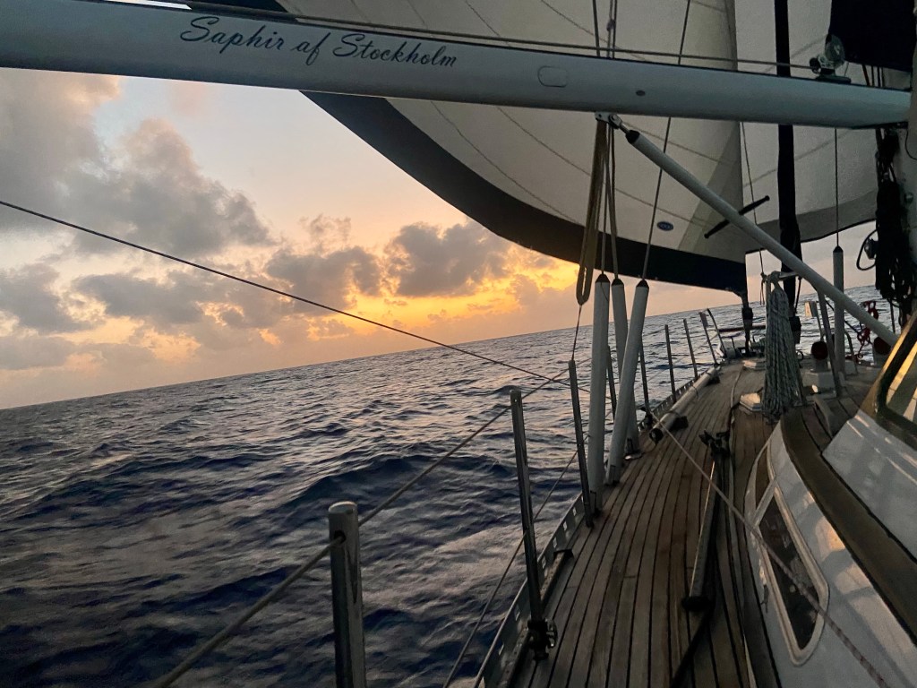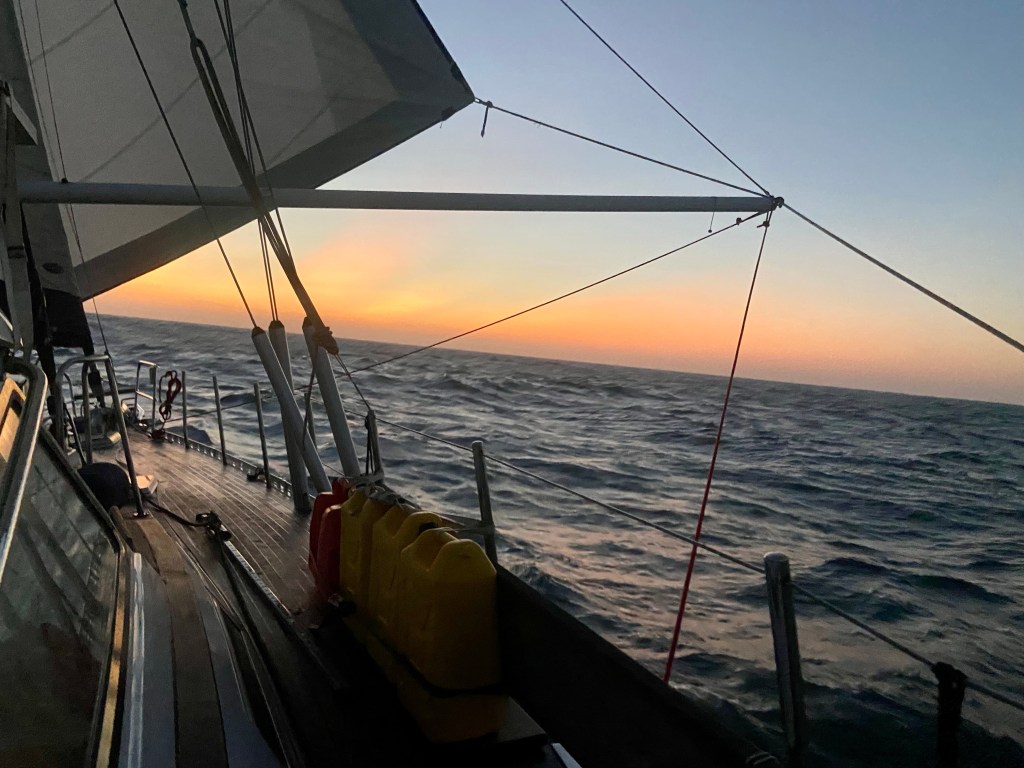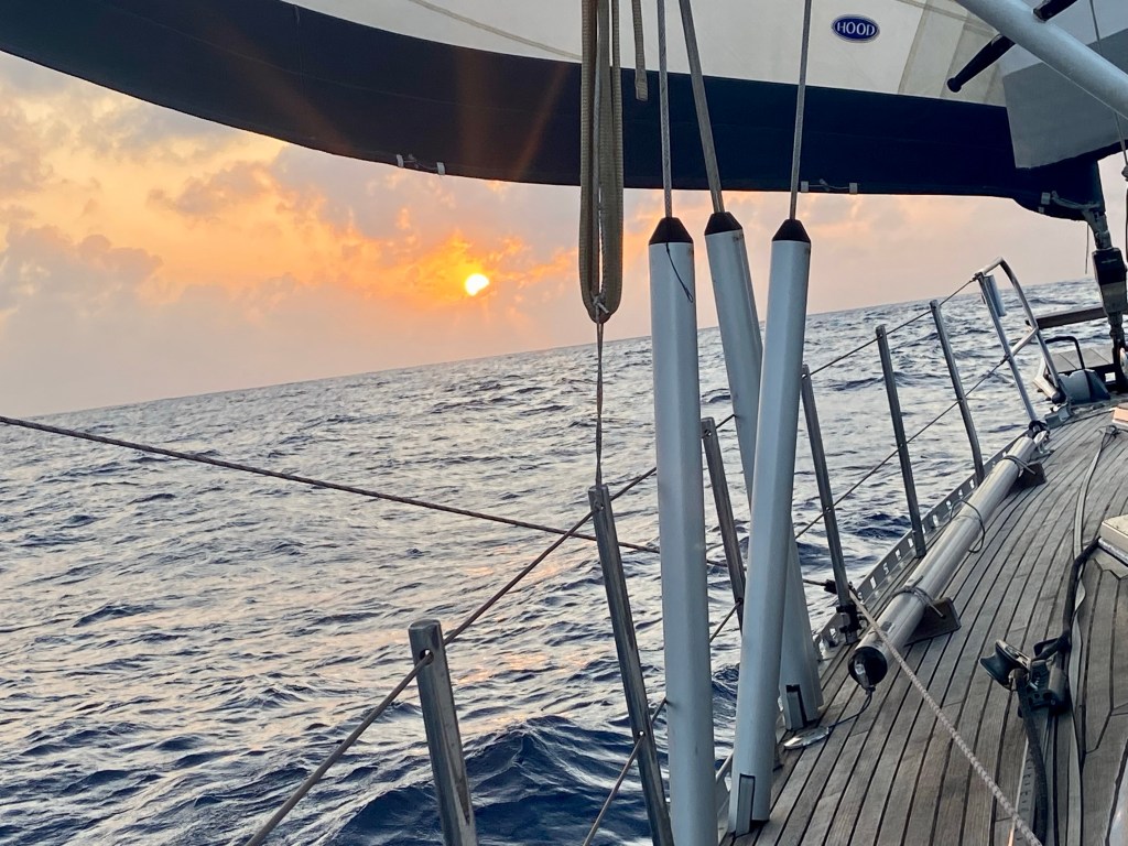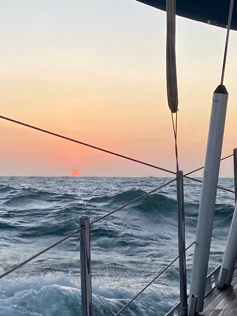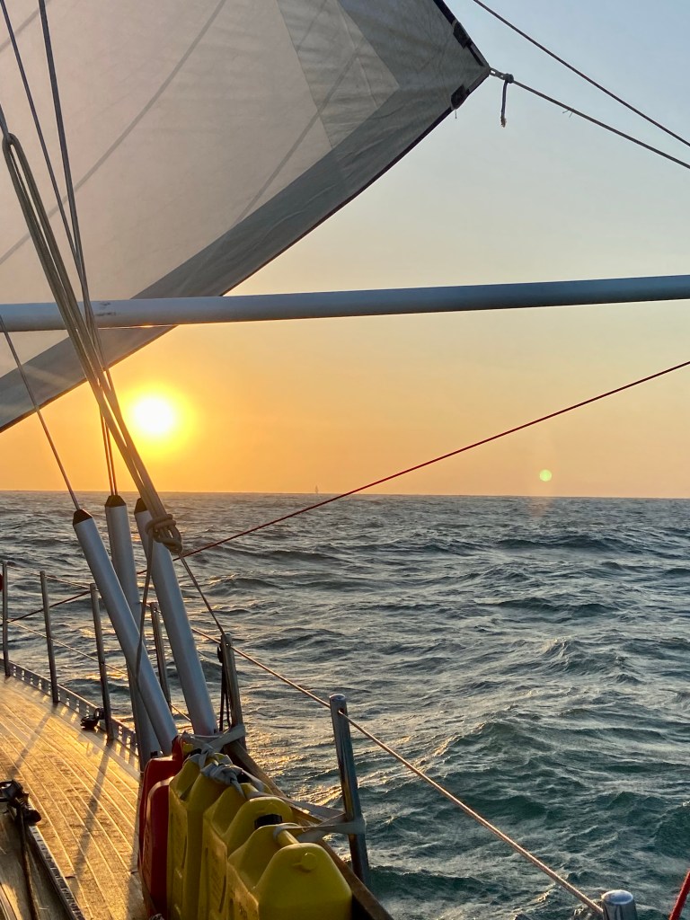 Lovely sunsets and sunrise. Love them and continue pinching my arm to realise that we are hear and doing this fantastic adventure. We didn’t see many other boats with our eyes ther came a ship and also our friend boat Enalia suddenly cross just in front of us.