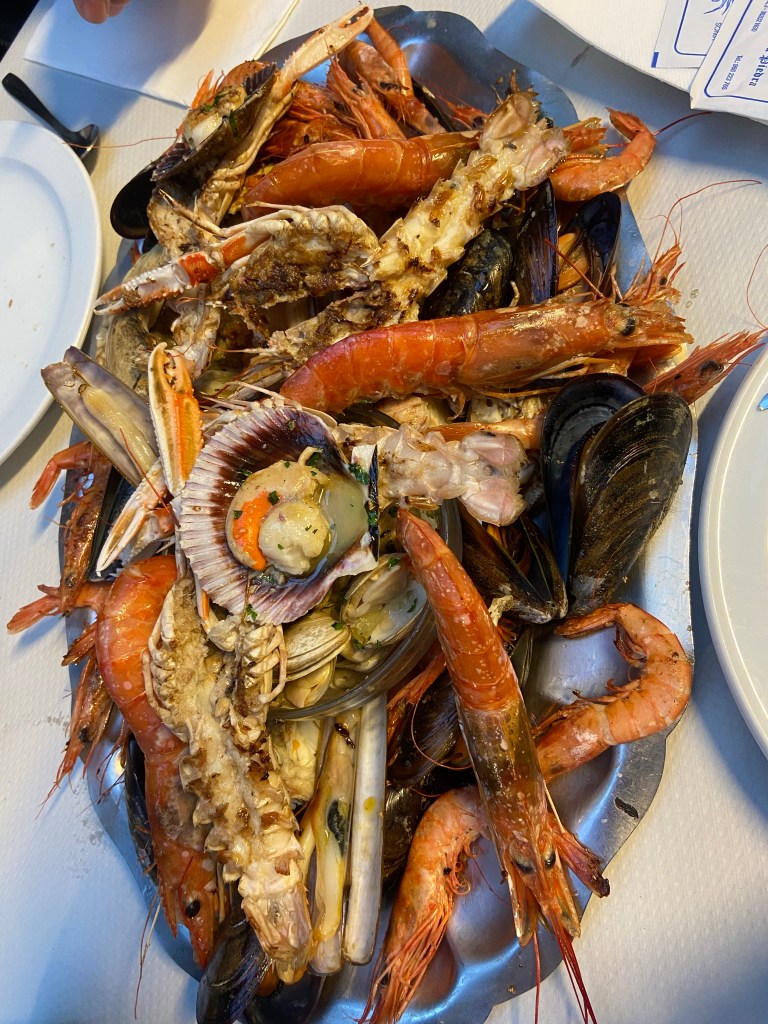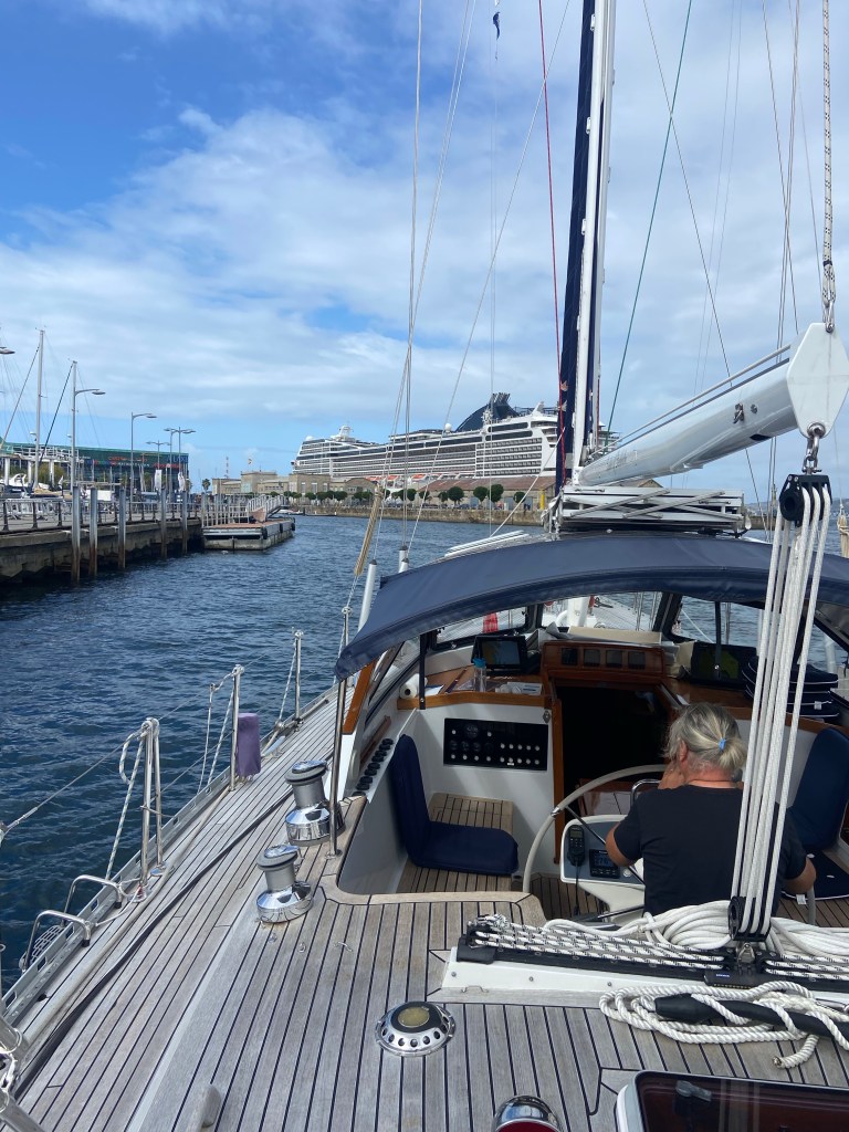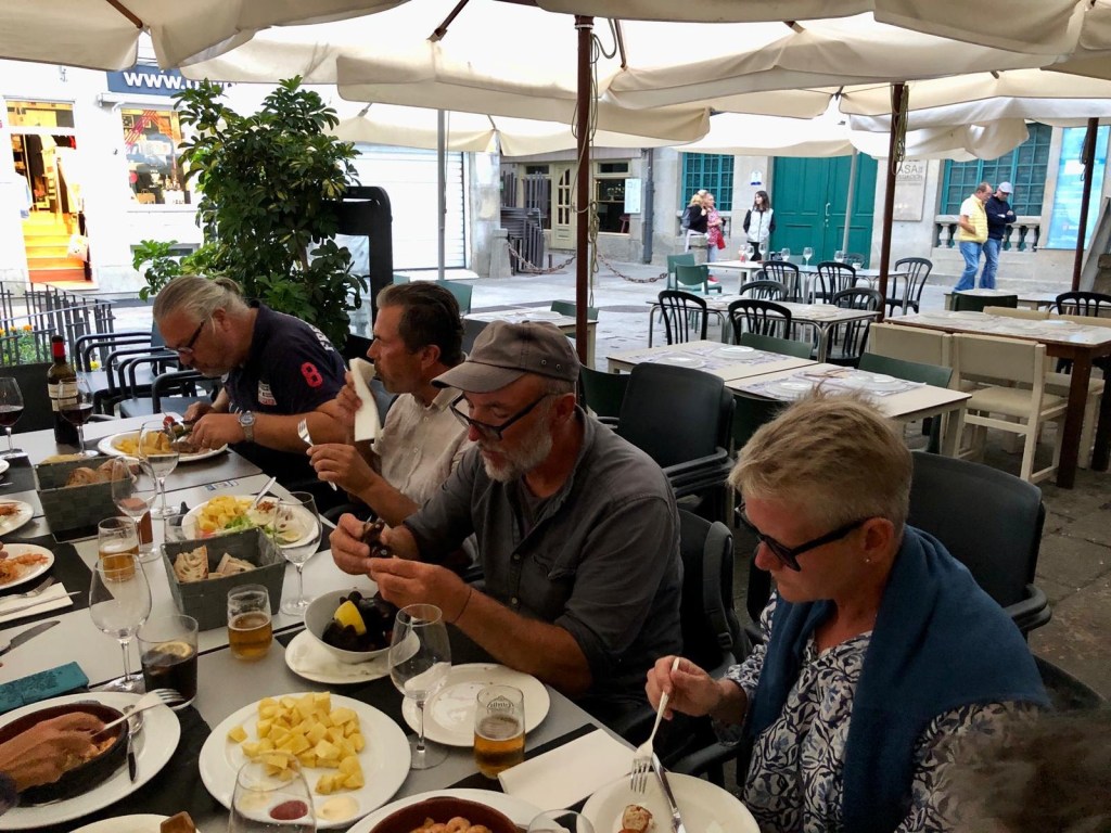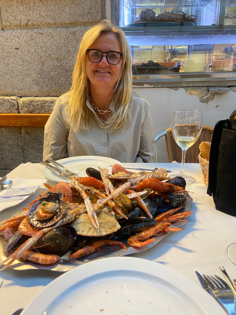 Luckily Edgar had called up the harbour in Vigo and got us the last place. Maybe not the best one just inside the pier and next to the gas station that was closed. Sadly we had a lot of clucking when we were sleeping or trying to… But happy we didn’t need to lay on anchor in the hard wind and rain that was predicted the next days. Since the weather was still nice I decided to do some washing and after the third machine the rain came so we hade to hang dry in the boat. I had walk around the city and we decided to go to Santiago the next day if the weather was going to be okay. In the morning it was pouring down. I ended up staying insided relaxing and did some knitting and sewing. Nice to have restaurants around the corner when the inspiration goes down. We had some really nice seafood here and pizza. I am in heaven. Edgar is also okay if he gets some meat in between.