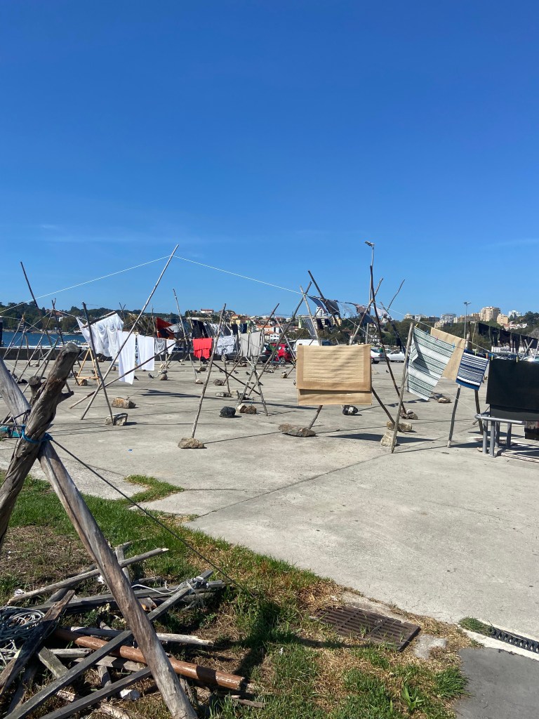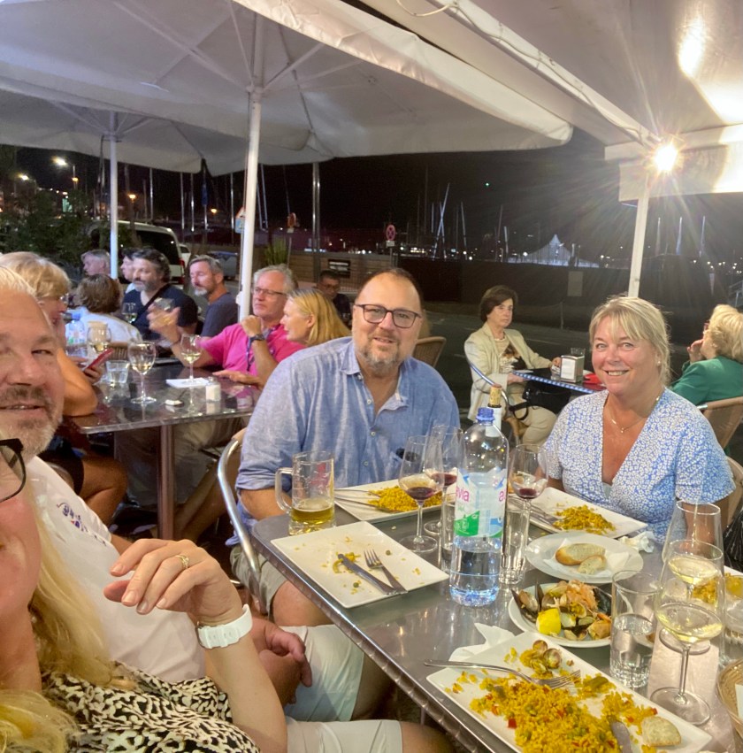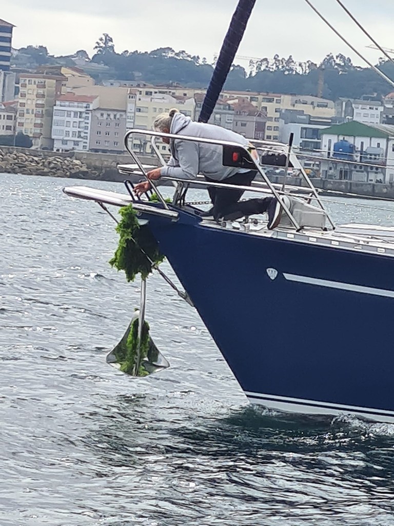 A tour in to town to do some grocery shopping ended up with new sandals as well . Didn’t buy these when I saw them in Mallorca so now was the time and I was not the only one buying sandals. After lunch it was time to leave and when we took up the anchor the chain was filled with “green salad” so it took a little wile to clean the worst to get it up. Right and enough wind made us all happy that we finally could sail. Passing by lots of fish and shellfish farms some of them very close to the shore. Which a bit destroys the view and makes it harder to anchor . Instead of anchoring we decided to go in to Porto Villagarcia. We ended up having a nice evening over at Christophes boat Currier Sur.