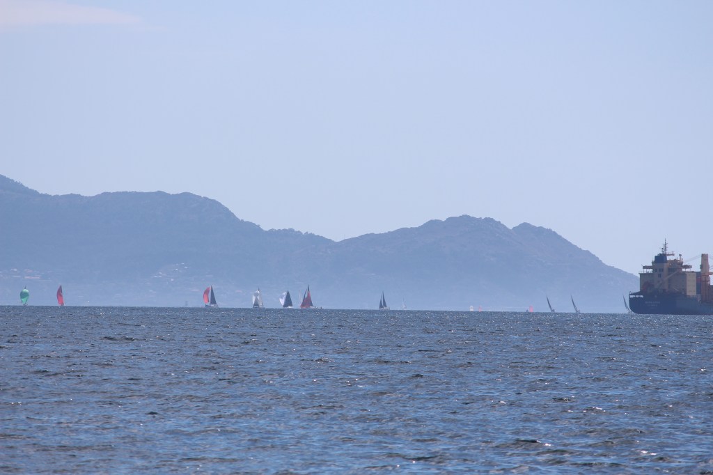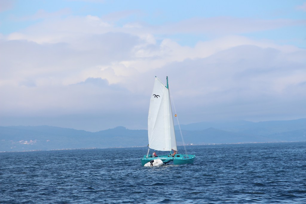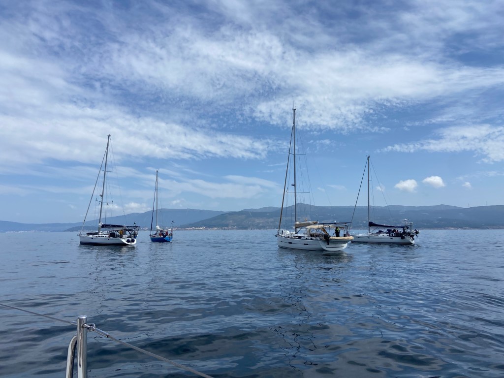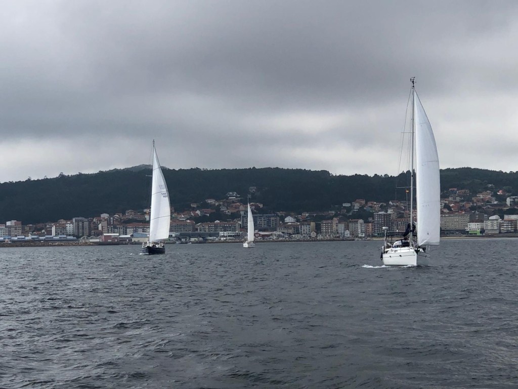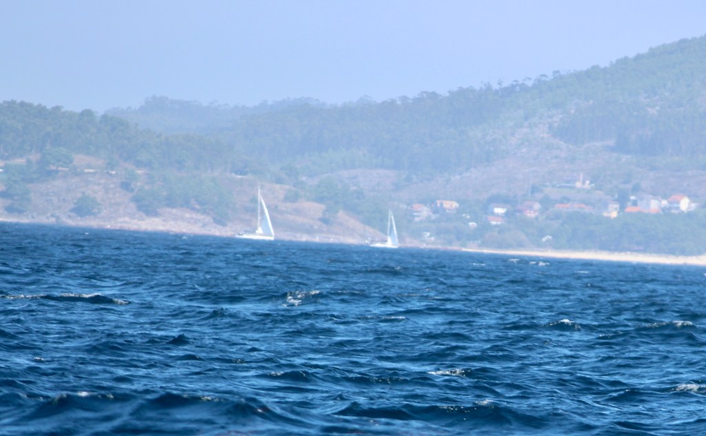 There will be a good weather window in two days to go down to Porto, so we leave Vigo to go further out on the Ria. On our way out we see MorningGlory and Balder on the other side of the Ria going to Vigo. They are easy spotted due to there turquoise colour. And not far after them we see Life@sea and Zelda. All of them sailing. Lucky them.