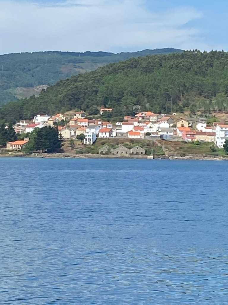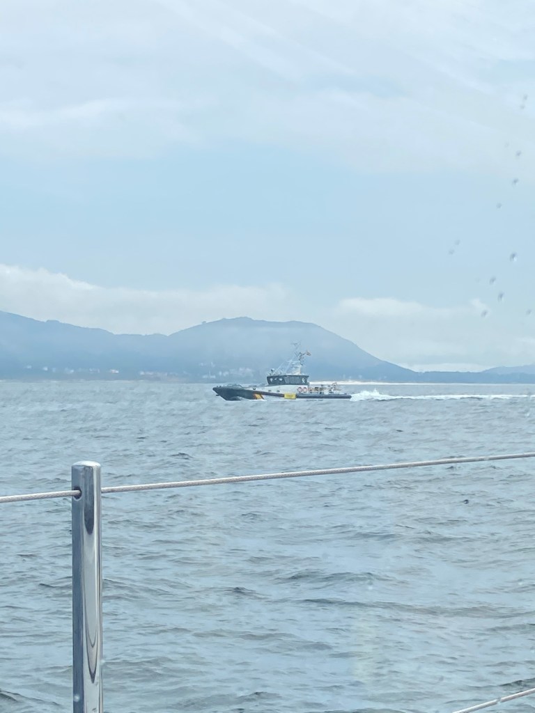 Almost at the Ria the sky clears up and we see a Guardian civila boat meeting us. Suddenly it turns and comes up next to us. A bit scary first, thinking have we done something wrong. Gladly they only wanted our papers and ask where we came from and where we were going. The last thing the wonder was why we are going in a convoy and they agreed it was a good thing due to the Orcas. The papers came back in a fishing net( the Swedish language have a specific name for it.. fiskehåv ) and we could continue . Getting in to the Ria we decided to go to Muros harbour and the rest went further in the to the Ria to swing anchor in a bay.