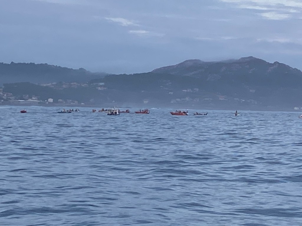 At 8.00 on Thursday 8 Sep we leave Baiona with our sailing friends and a lot of other boats as well. It is a very magical morning. Lots of photos are taken and just outside the wave-pier there is a lots of small fishing boats. Depending on our speeds we divide us in different groups. We take the lead and guide Currier Sue and Life@Sea true all the fishing gears that we pass. It is a lot off them so some slalom technic is required. Happy to see some dolphins also. The waves are high and long and in between our friends boats mor or less disappears