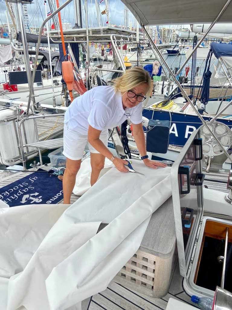 The next morning our sails arrives but can’t be hoisted since the hydraulic needs to be fixed. We got the mainsail fixed so we don’t have to have battens in them any more, mended the torn and new UV covers.