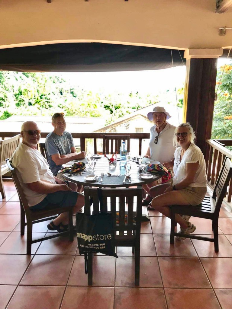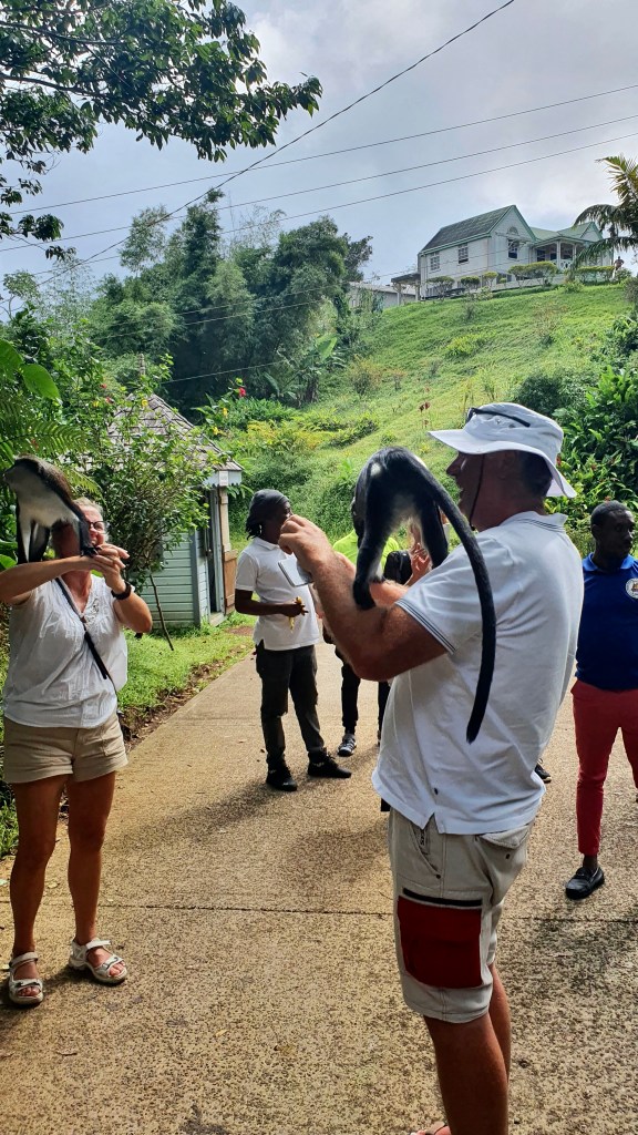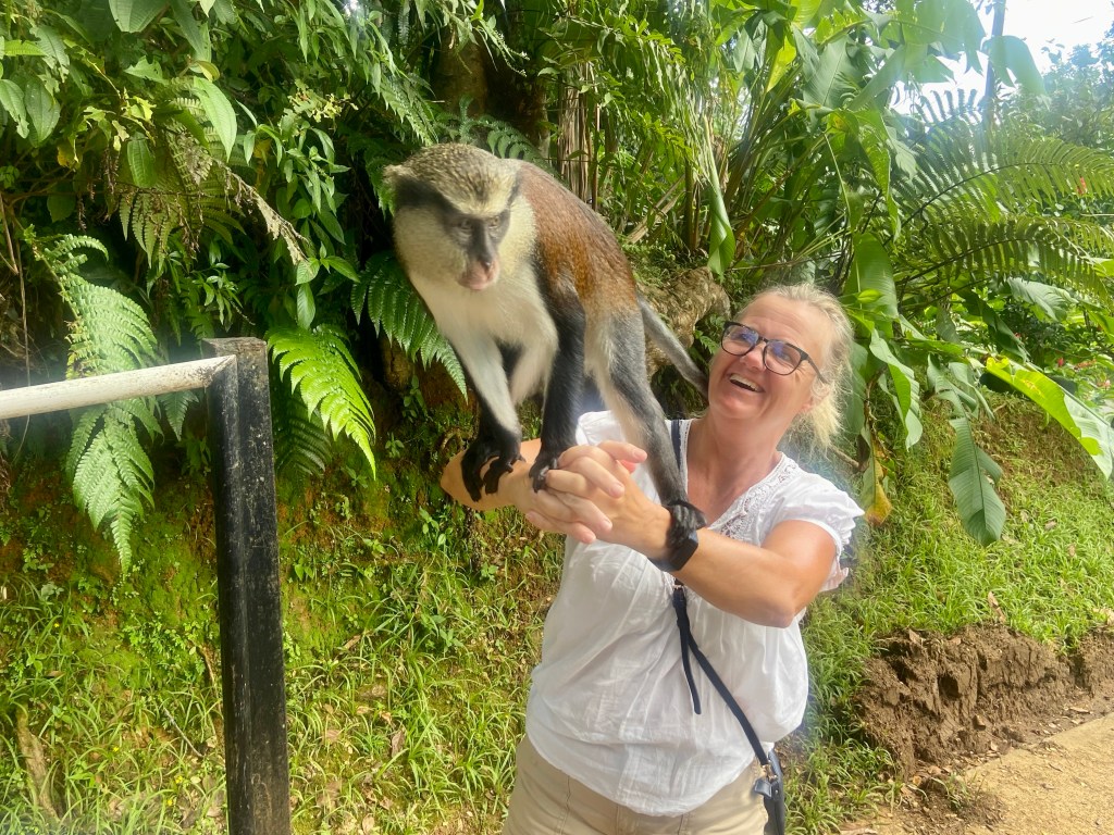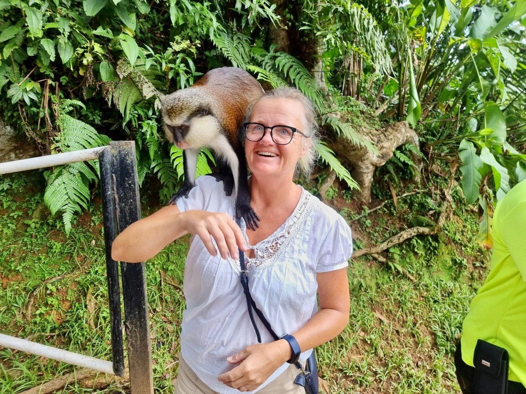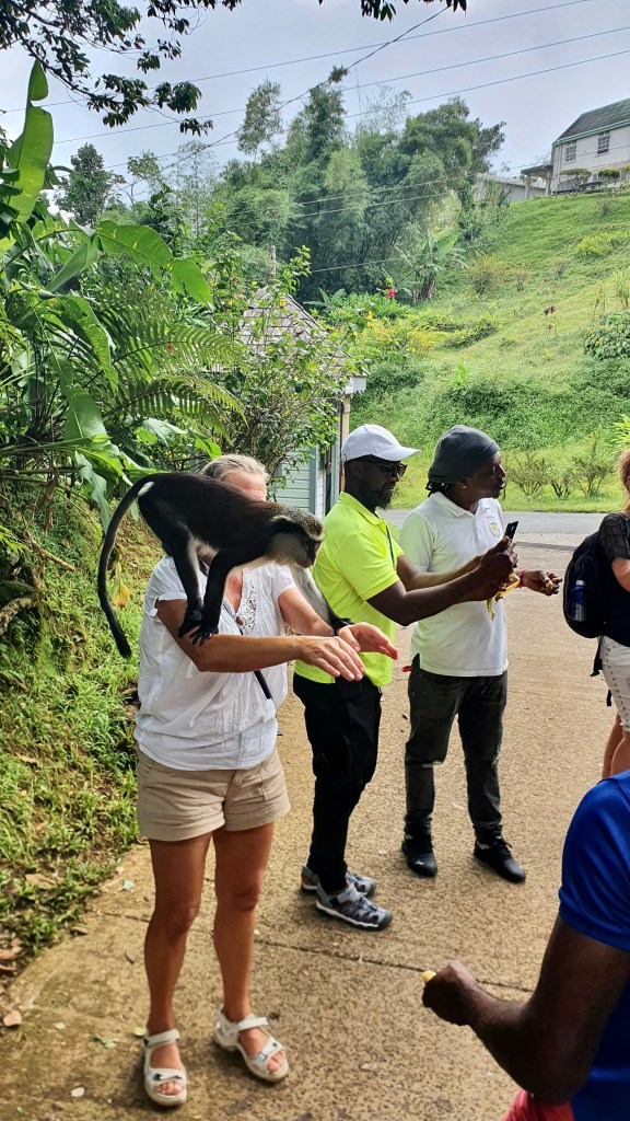 The next morning we had a guided bus tour around the iland toghether with Even,Jörn and Johnny. We went to Annadale waterfall where we could jump in tomtar water but to many people and the water look so and so. Next stop was at Grand Etang national park with a lake in crater. Grand Etang Lake is a 36 acre crater lake inside an ancient volcano, one of two crater lakes in Grenadine. The lake is full with fish but you are not aloud to fish there. The guys was not that impressed. More fun was it with the monkeys. I wanted meet them. While Johnny was taking photos of me he got surprised by the others monkey that jump on him.
