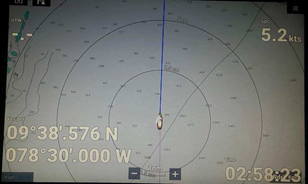 Almost at the finish line. Count down. We need to pass 078 30 000 W and at 02 58 23 we passed the finish line. It took us around 4 hours more before we where anchored in Holandais Cay close to our friends on Sara of Sweden. This looks fantastic and here we will stay for some days.