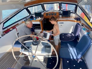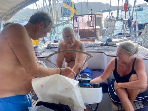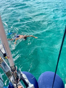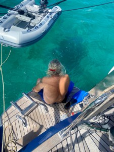Finally, I can swim from the boat again. I manage to take a dip before the sky opens up. At the same time, I see Seamonster with Gen and Jerry coming in to anchor for the night. When the rain stops, the bottom of the dinghy is filled with water, so we just have to scoop out the water. It has been a long time since we’ve had this much rain.