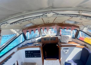 Back on the boat, I get help removing the salt from the hull and cleaning the interior. It’s so nice to have that done occasionally. I take the opportunity to continue sewing some more sailcloth boxes. I try cutting out letters and numbers from the Sailrite fabric I bought for our hatches. It’s quite fiddly to cut out, but it turns out well. Unfortunately, I run out of my navy blue thread, so I can’t continue sewing on the letters/numbers. I find some glue, which I use to stick them on. I can’t find any place nearby to buy thread, so I have to wait to sew them on. We say goodbye to Solana V, Renegade, Matilda, and Lover of the Light.