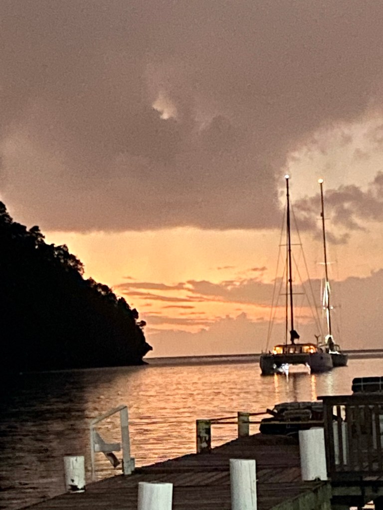 We sailed up to Antigua in the morning. Seamonster also left but was headed to English Harbour to fix their rigging. We had a wonderful sail up with sun and warmth. The closer we got, the more the clouds gathered, and of course, when we dock at the customs dock, it pours down. Edgar was not too pleased with these bureaucrats. They were a bit grumpy and wanted to show some power. I think it’s the first time we’ve encountered such sour officials, as everyone else has been very nice. Luckily, the harbor master was pleasant and very helpful when we docked at the pontoon. Even the rain had stopped but lingered in the air. When we finished, I saw that Amanzi was a boat away from us. Unfortunately, we wouldn’t meet Mark and Clare as they had crew sailing their boat home. Kaja is also at the dock, getting ready to sail one step closer to home. They don’t have to cross the Atlantic since they are going to the USA, a bit envious especially since they will go via the Bahamas. In the evening, we meet up with them again, Bahati, and Escaped of London.