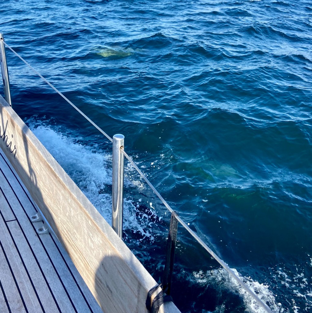 At 8.00 on Thursday 8 Sep we leave Baiona with our sailing friends and a lot of other boats as well. It is a very magical morning. Lots of photos are taken and just outside the wave-pier there is a lots of small fishing boats. Depending on our speeds we divide us in different groups. We take the lead and guide Currier Sue and Life@Sea true all the fishing gears that we pass. It is a lot off them so some slalom technic is required. Happy to see some dolphins also. The waves are high and long and in between our friends boats mor or less disappears